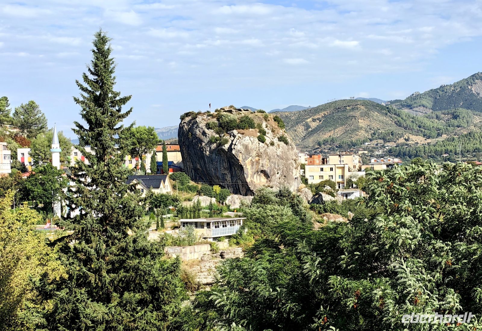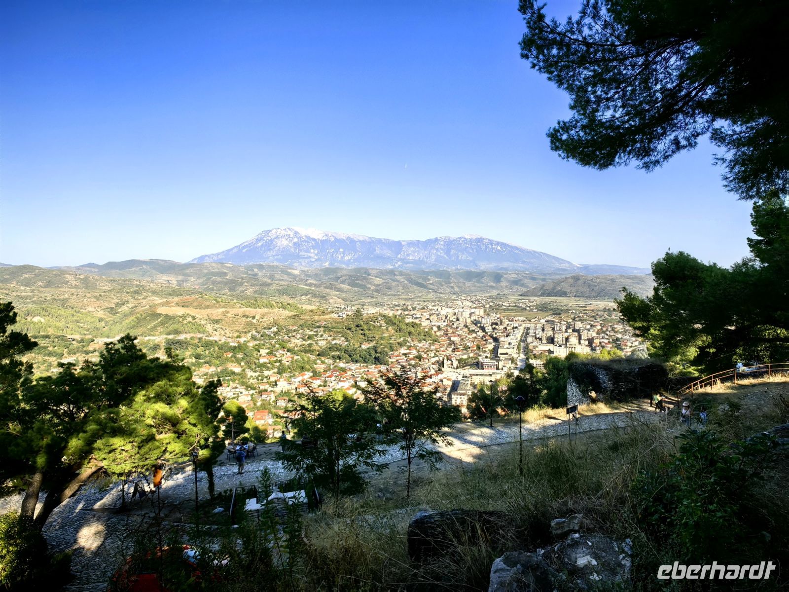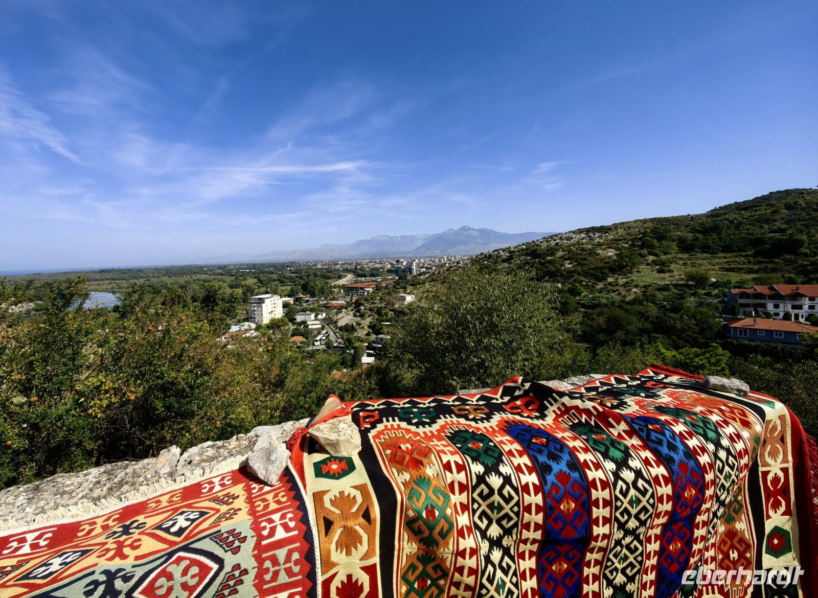 Kruje liegt am Hang eines westlichen Gipfels des Skanderbeggebirges, etwa 500 Meter über dem Meeresspiegel. Nur 35 Kilometer trennen uns hier von der Adriaküste.