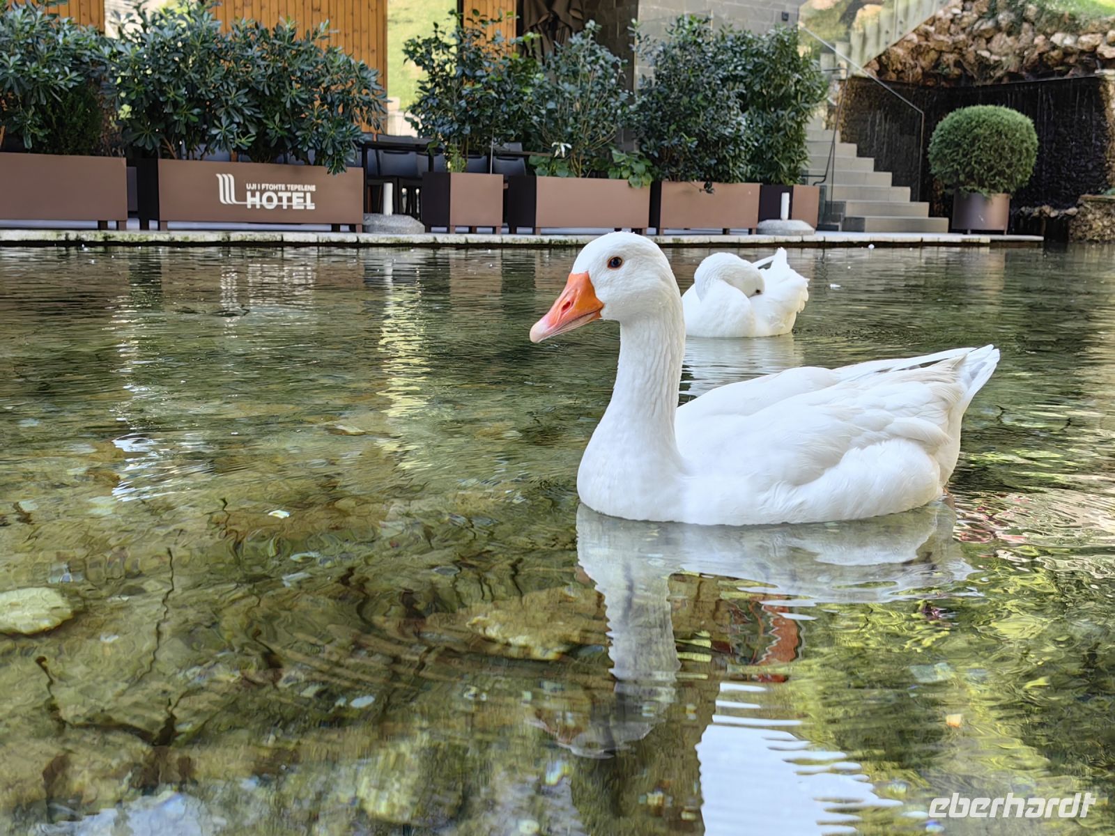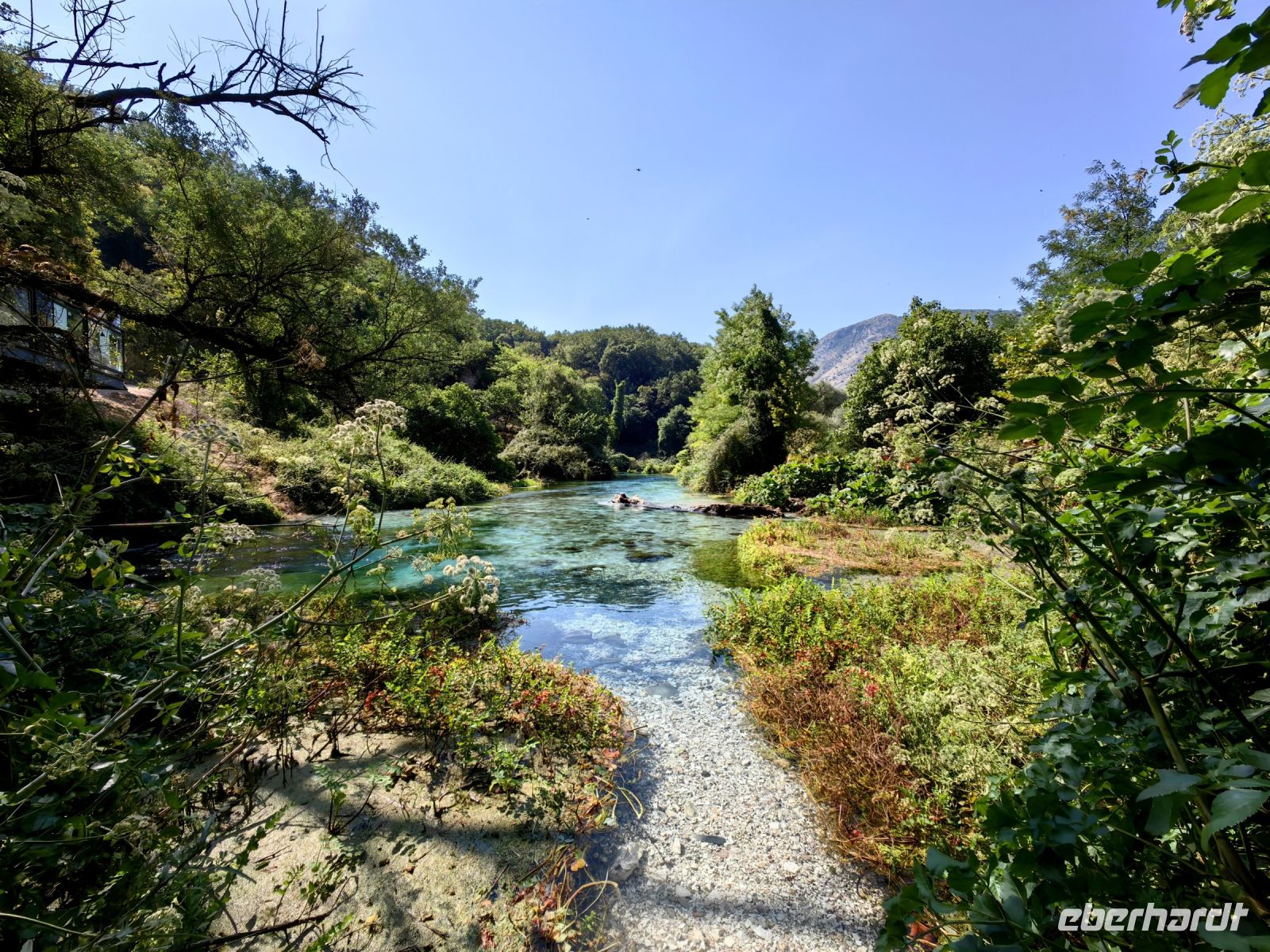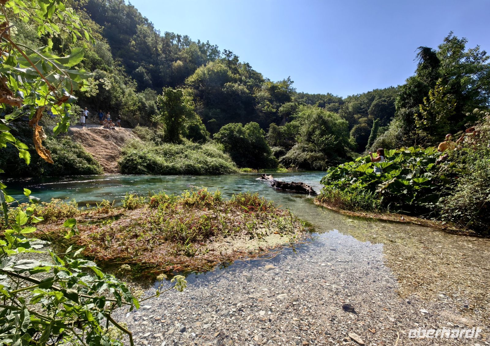 Da wir an einem Samstag hier sind, begegnen uns viele Albaner, die ein wenig an der Quelle entspannen wollen und Italiener, die übers Wochenende kommen. Wir werfen rege Steinchen ins Wasser und überzeugen uns so selbst vom unglaublichen Wasserdruck, sie gehen gar nicht unter sondern werden nur seitlich weg gespült.