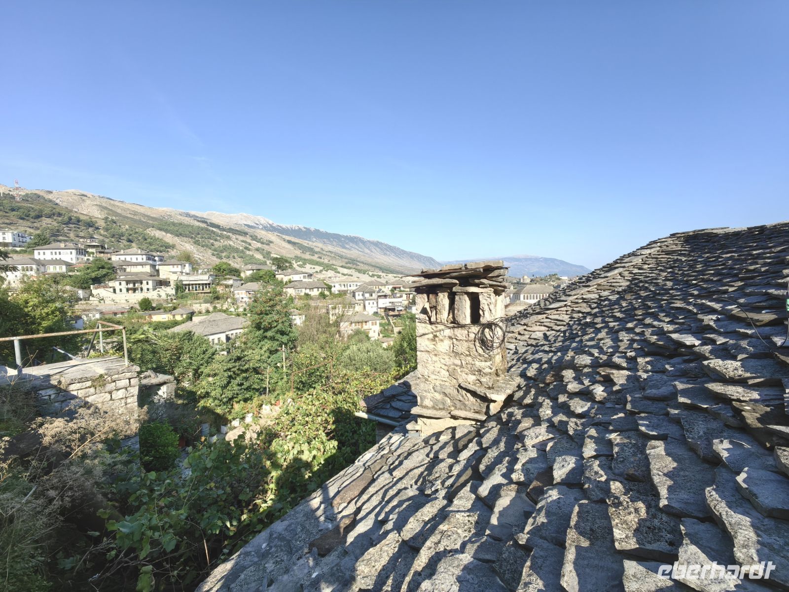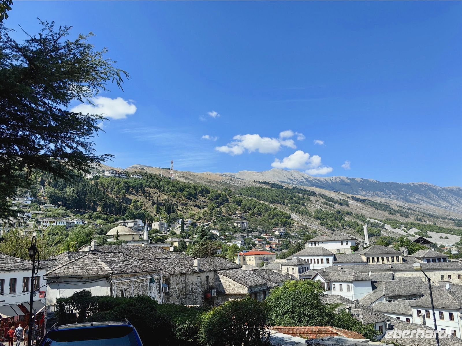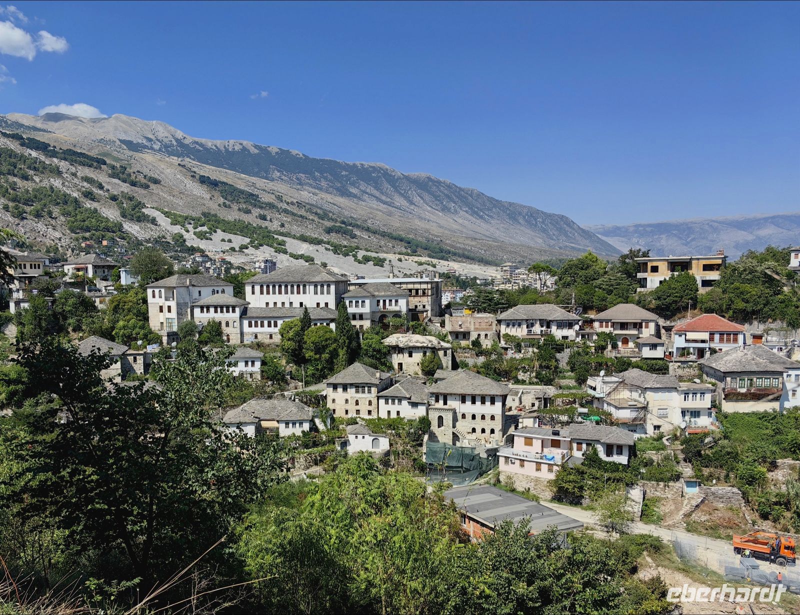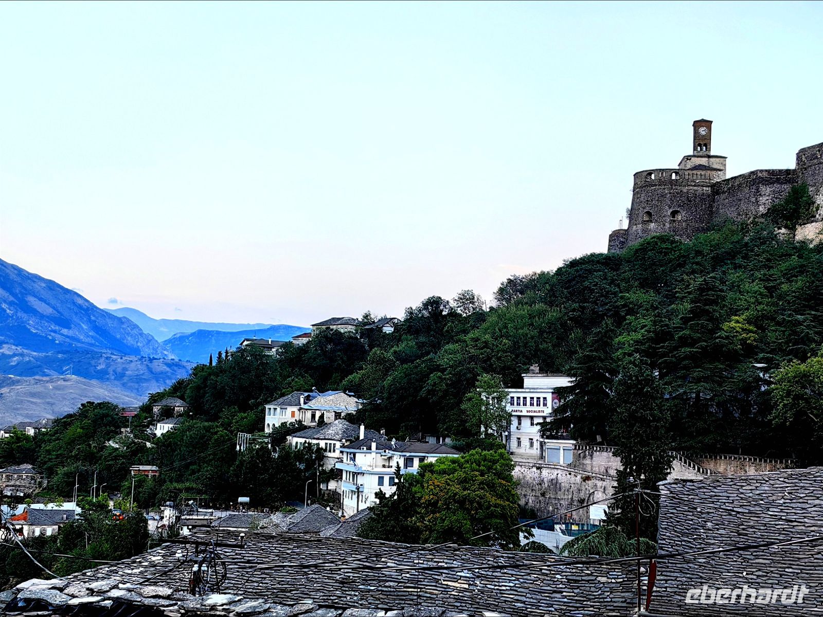 Nach nur einer Fahrstunde erreichen wir Gjirokastra. Schon von weitem sehen wir kleine weiße Häuser, die steil an den Hängen des Mali i Gjere zu kleben scheinen, einem Gebirgszug, dessen majestätische Gipfel sich bis auf 1.800 Meter Höhe erheben. Die Dächer sind allesamt mit lose aufeinander geschichteten flachen Steinen gedeckt.