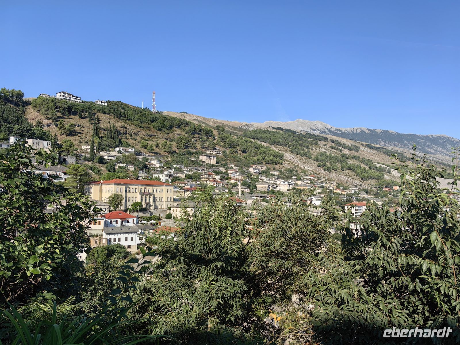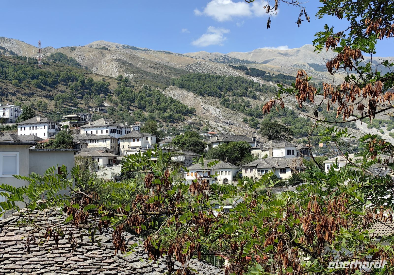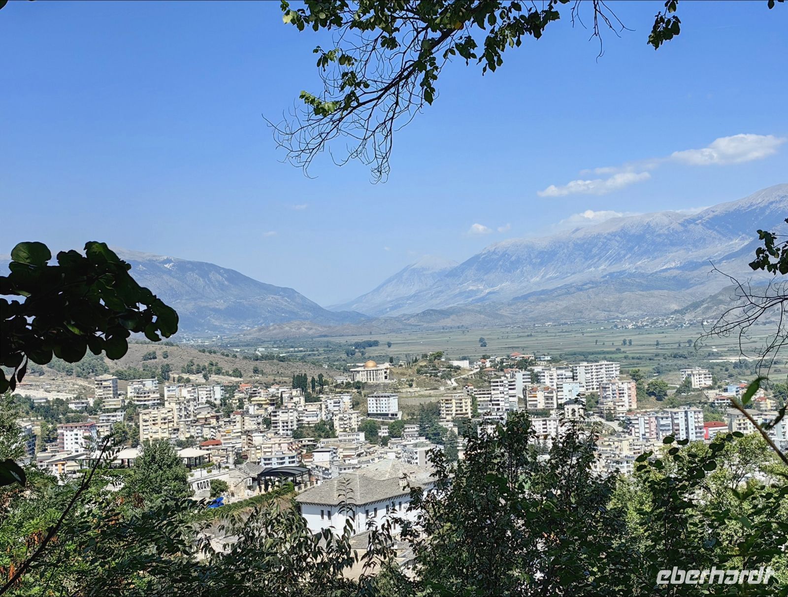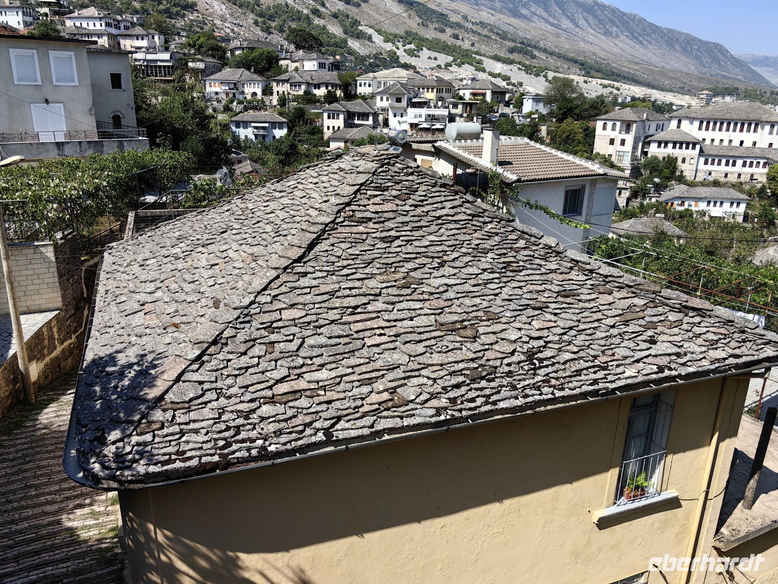 Nach nur einer Fahrstunde erreichen wir Gjirokastra. Schon von weitem sehen wir kleine weiße Häuser, die steil an den Hängen des Mali i Gjere zu kleben scheinen, einem Gebirgszug, dessen majestätische Gipfel sich bis auf 1.800 Meter Höhe erheben. Die Dächer sind allesamt mit lose aufeinander geschichteten flachen Steinen gedeckt.
