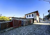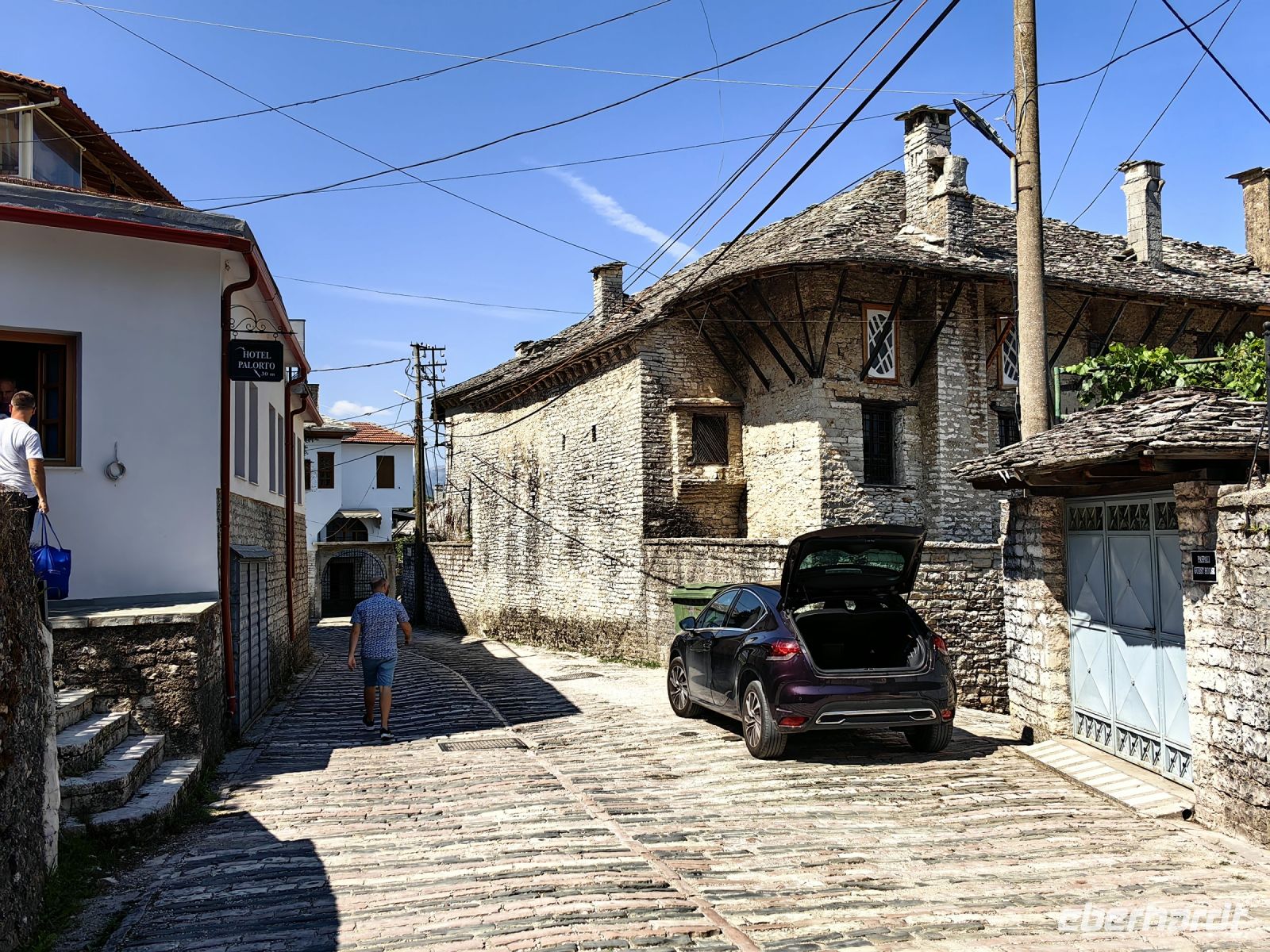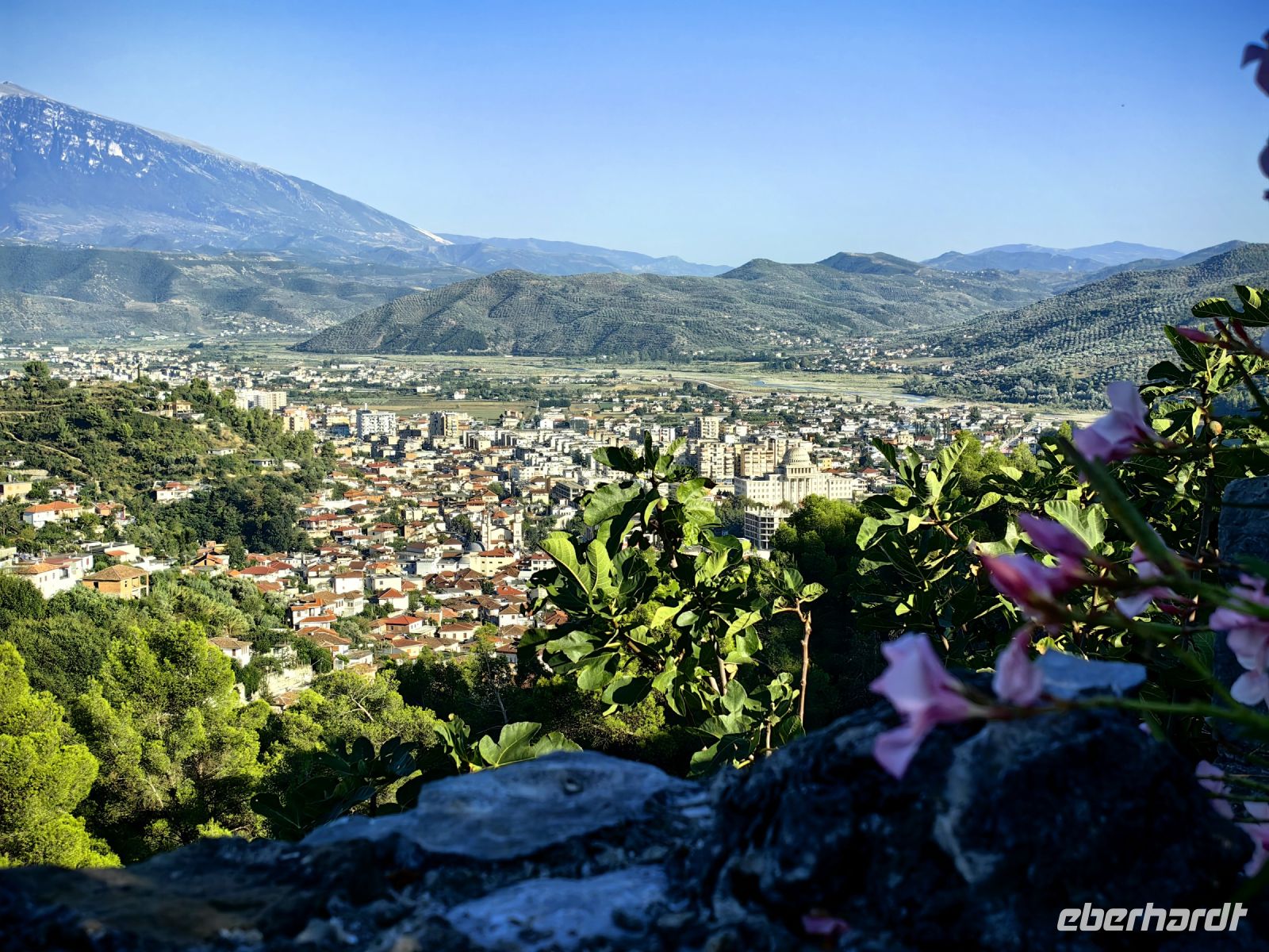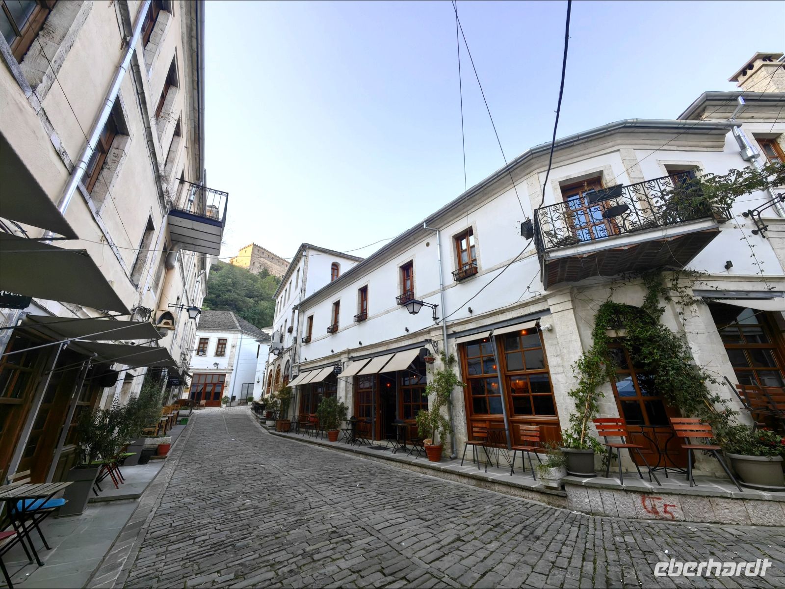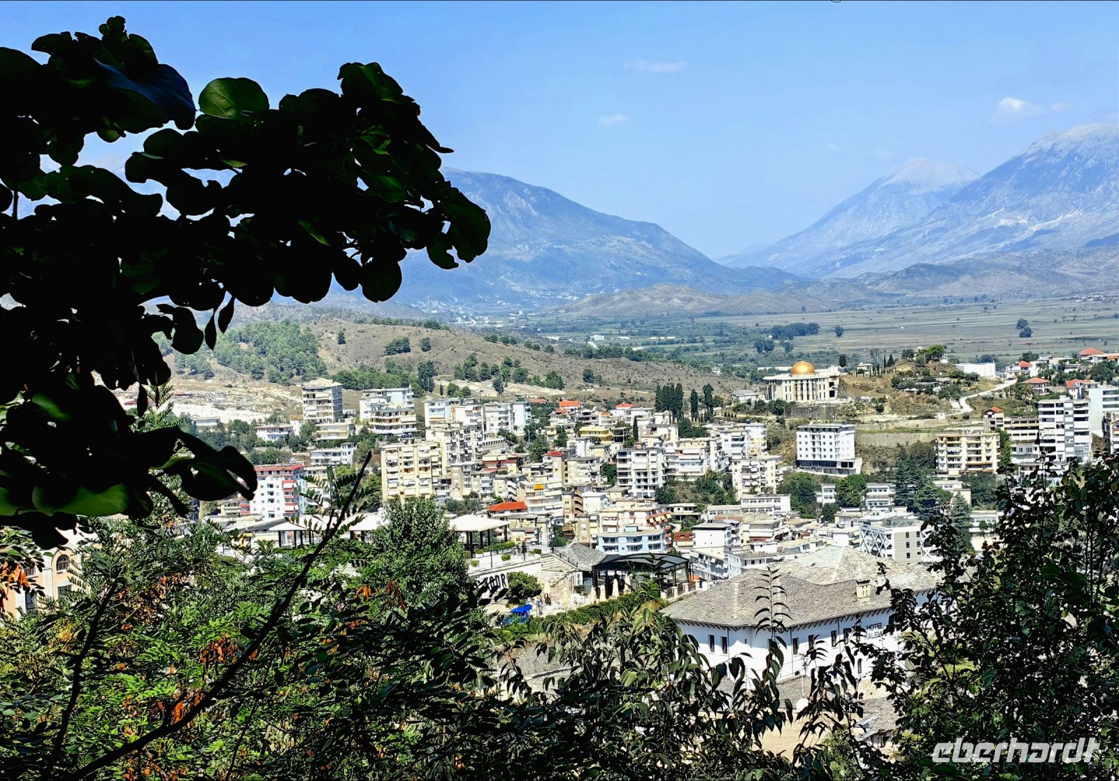 Nach nur einer Fahrstunde erreichen wir Gjirokastra. Schon von weitem sehen wir kleine weiße Häuser, die steil an den Hängen des Mali i Gjere zu kleben scheinen, einem Gebirgszug, dessen majestätische Gipfel sich bis auf 1.800 Meter Höhe erheben. Die Dächer sind allesamt mit lose aufeinander geschichteten flachen Steinen gedeckt.