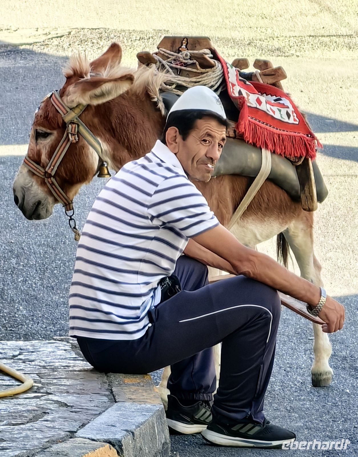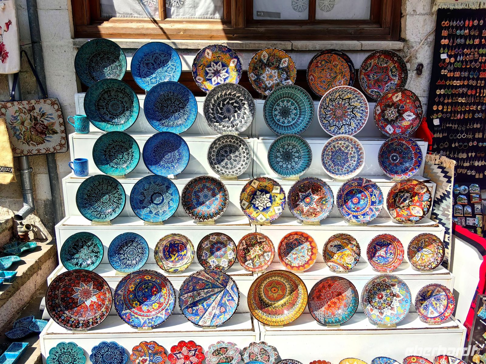 Im Anschluß haben wir noch ein wenig Zeit, um die Händler entlang des Burgaufgangs zu besuchen. Vor allem schöne Teppiche, bunte Keramik und allerlei orientalisches Geschirr wird feil geboten. Manche Gäste nutzen die Gelegenheit, um eine Mittagspause zu machen und währenddessen auf die Festung zu blicken.