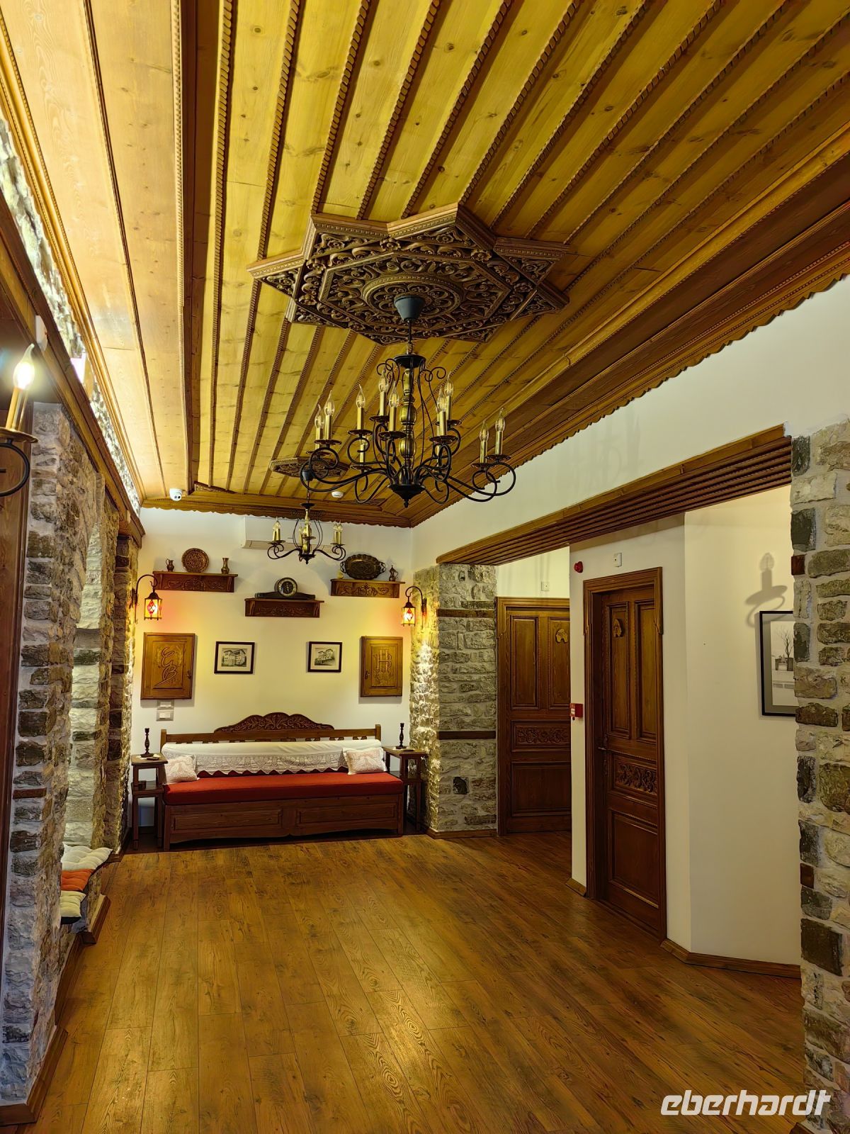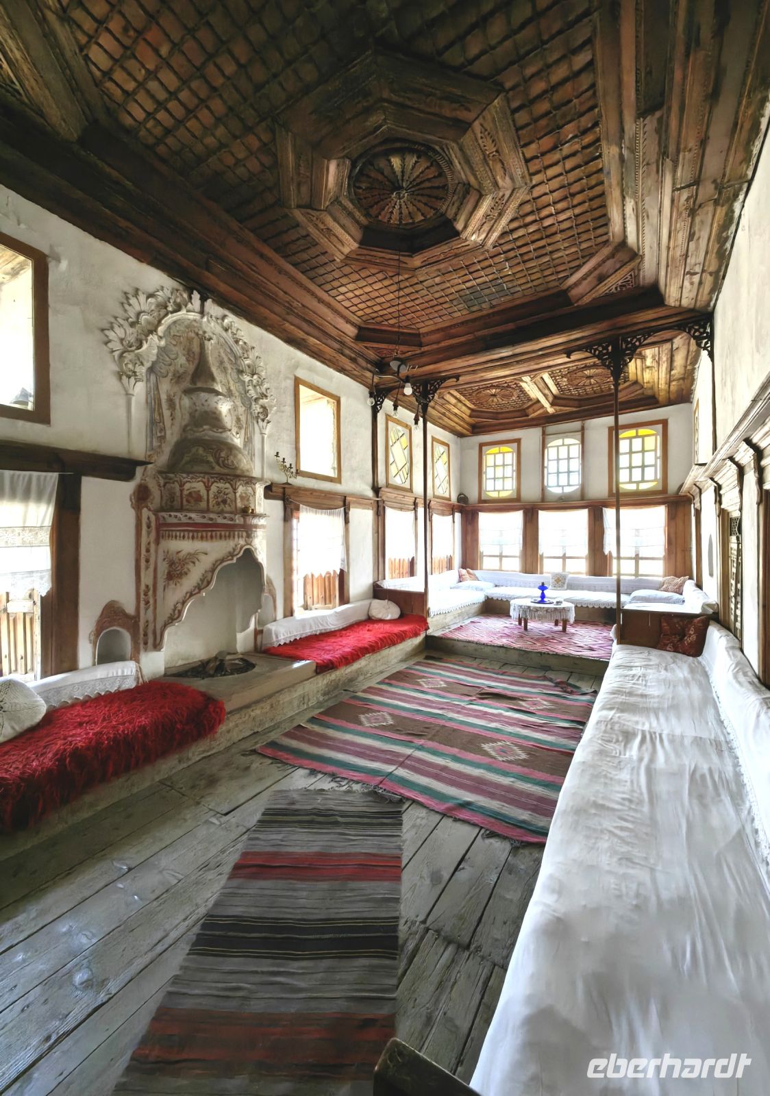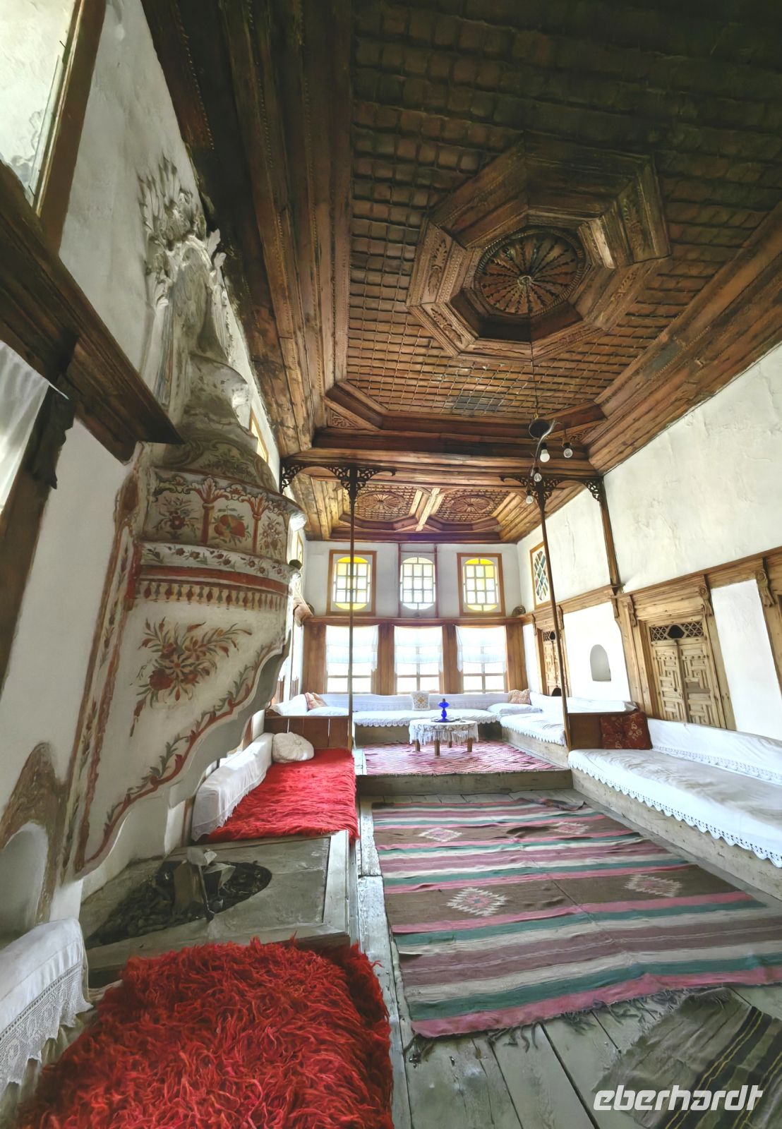 Wir spazieren weiter zum Skendulihaus, einem vollständig im osmanischen Stil eingerichteten Wohnhaus aus dem Jahre 1823, in dem wir uns anschauen, wie die Menschen damals lebten. Auf mehr als 1.000 Quadratmetern Wohnfläche befinden sich mehrere Wohn- und Schlafräume auf drei Stockwerken. Im Haus gibt es vier Hamams und Innentoiletten, was für die damalige Zeit ein luxuriöser Zustand war.