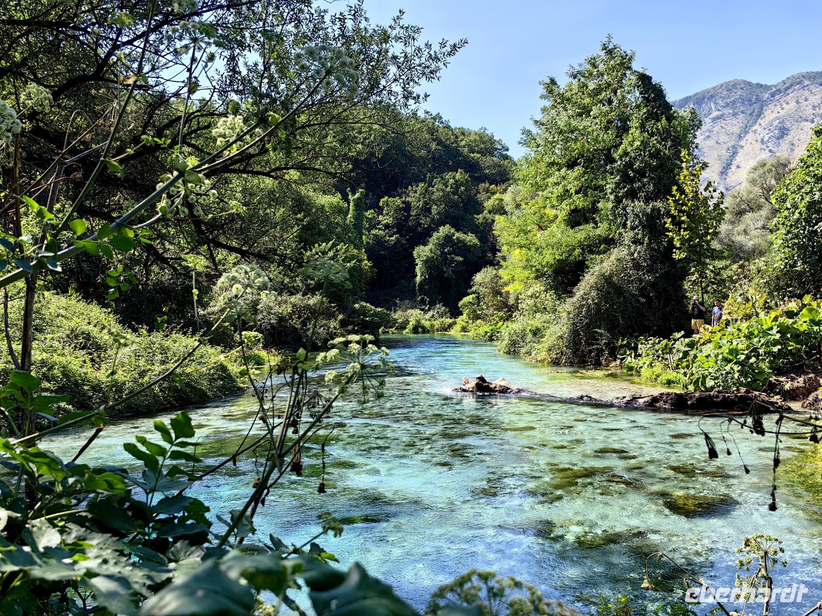 Am Morgen verlassen wir das schöne Gjirokastra und fahren in Richtung der Küste zum Ionischen Meer. Unseren ersten Halt legen wir am Syri i Kalter, dem sogenannten Blue Eye, ein. Mitten in einem 180 Hektar großen Naturschutzgebiet gelegen, ist das Blaue Auge die wasserreichste der insgesamt 18 albanischen Quellen, die den nahe gelegenen Stausee Bistrica speisen. Der Stausee, an dem wir aussteigen, wurde in den 1960er Jahren angelegt und dient dem Antrieb von Turbinen zur Energiegewinnung im unteren Tal. Das Wasser schießt mit hohem Druck aus der Karstquelle hervor. Die genaue Tiefe konnte bisher nicht ermittelt werden, aber die Schätzungen reichen bis zu 51 Metern. Man vermutet, daß das Blaue Auge ein Teil eines Höhlensystems mit unterirdischen Flüssen zwischen Drinos und Bistrica ist. Die Wassertemperatur beträgt ganzjährig 13 Grad und so wundert es uns nicht, bei den 30 Grad Außentemperatur nur wenige Badewillige zu sehen.
