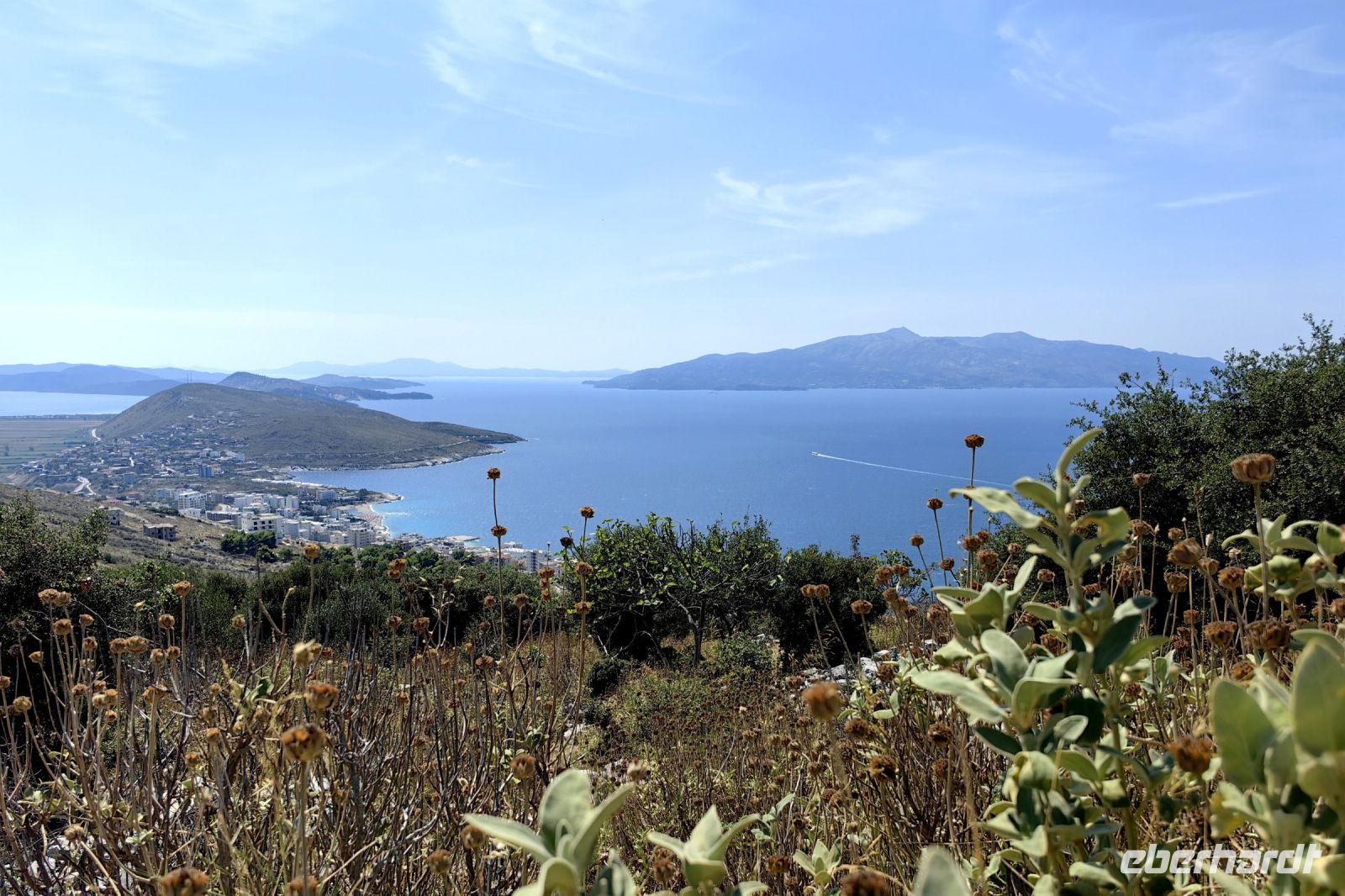 Unser Quartier liegt in einer Höhe von 1027 Metern über dem Meeresspiegel und die Temperaturen haben sich in der Nacht auf 14 Grad abgekühlt. Es scheint aber die Sonne und der Himmel ist azurblau. Bevor wir abfahren, füttern wir noch die frei herumlaufenden Rehe und fotografieren das Spektakel. Nach 15 Minuten Fahrt sind wir bereits wieder so weit nach unten gefahren, daß das Thermometer 28 Grad anzeigt und so wagen wir einen Fotostop mit fantastischem Blick auf Vlora. Diese Stadt liegt am Übergang von der Adria zum Ionischen Meer. Die Bucht, die einen natürlichen Hafen bildet, war bei Griechen, Römern, Osmanen und Russen gleichermaßen beliebt. Die italienische Küste ist gerade mal 60 Kilometer entfernt und das italienische Städtchen Otranto liegt näher als die Hauptstadt Tirana. Diese einmalige Lage zur Adria hat die Stadt lange geprägt: Immer wieder wurde sie von den Italienern besetzt und in den 1990er Jahren war hier der Ausgangspunkt für viele Flüchtlinge nach Westeuropa. Vorgelagert ist die Insel Sazan und einige der schönsten Strände Albaniens liegen unweit des Zentrums von Vlora.