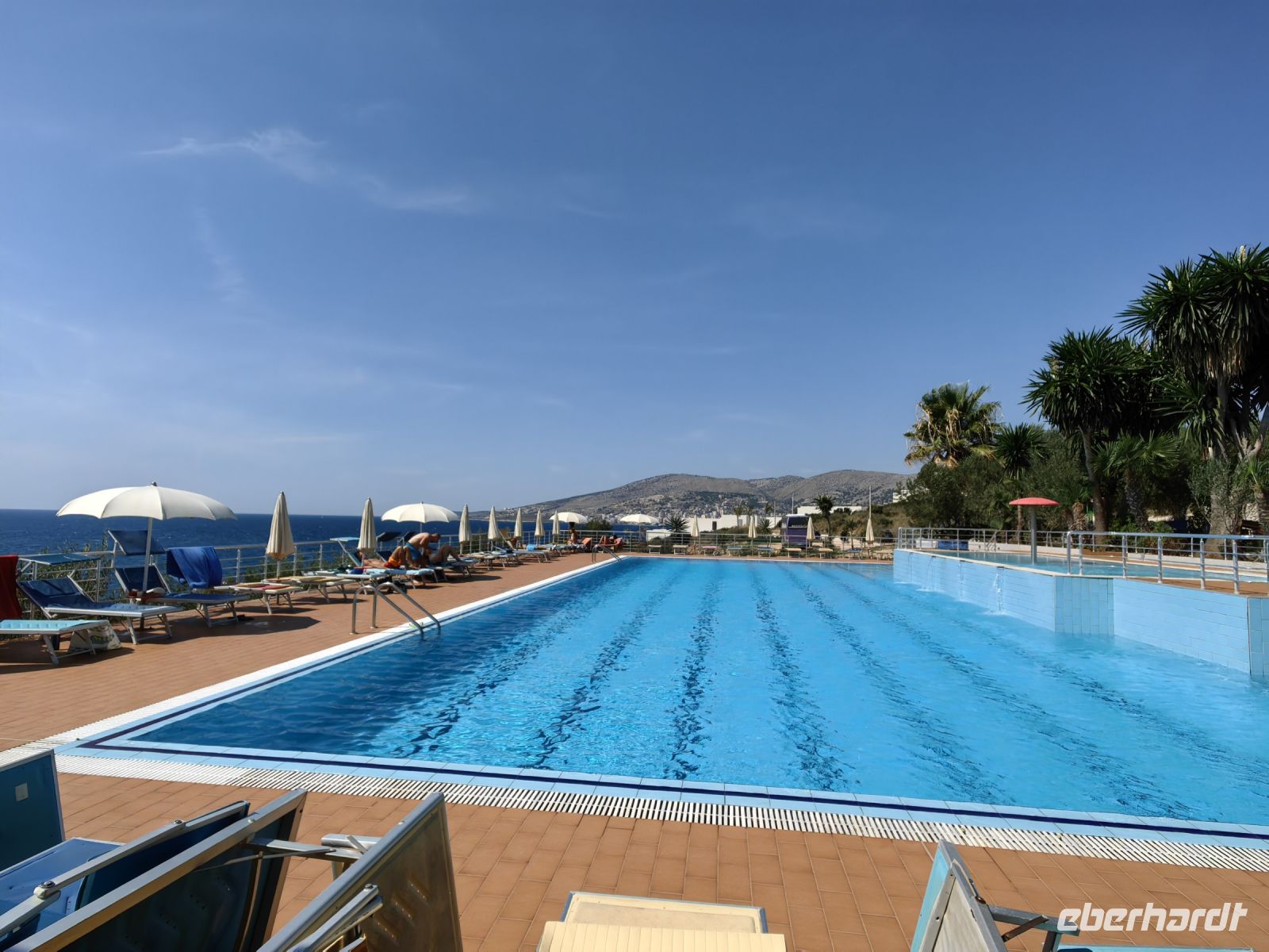 Wir entspannen uns am Sonntag Nachmittag in dieser Bilderbuchkulisse in vollen Zügen und die Gäste, die nicht schwimmen gehen, liegen im Schatten unter den Strohschirmen und ruhen sich aus.