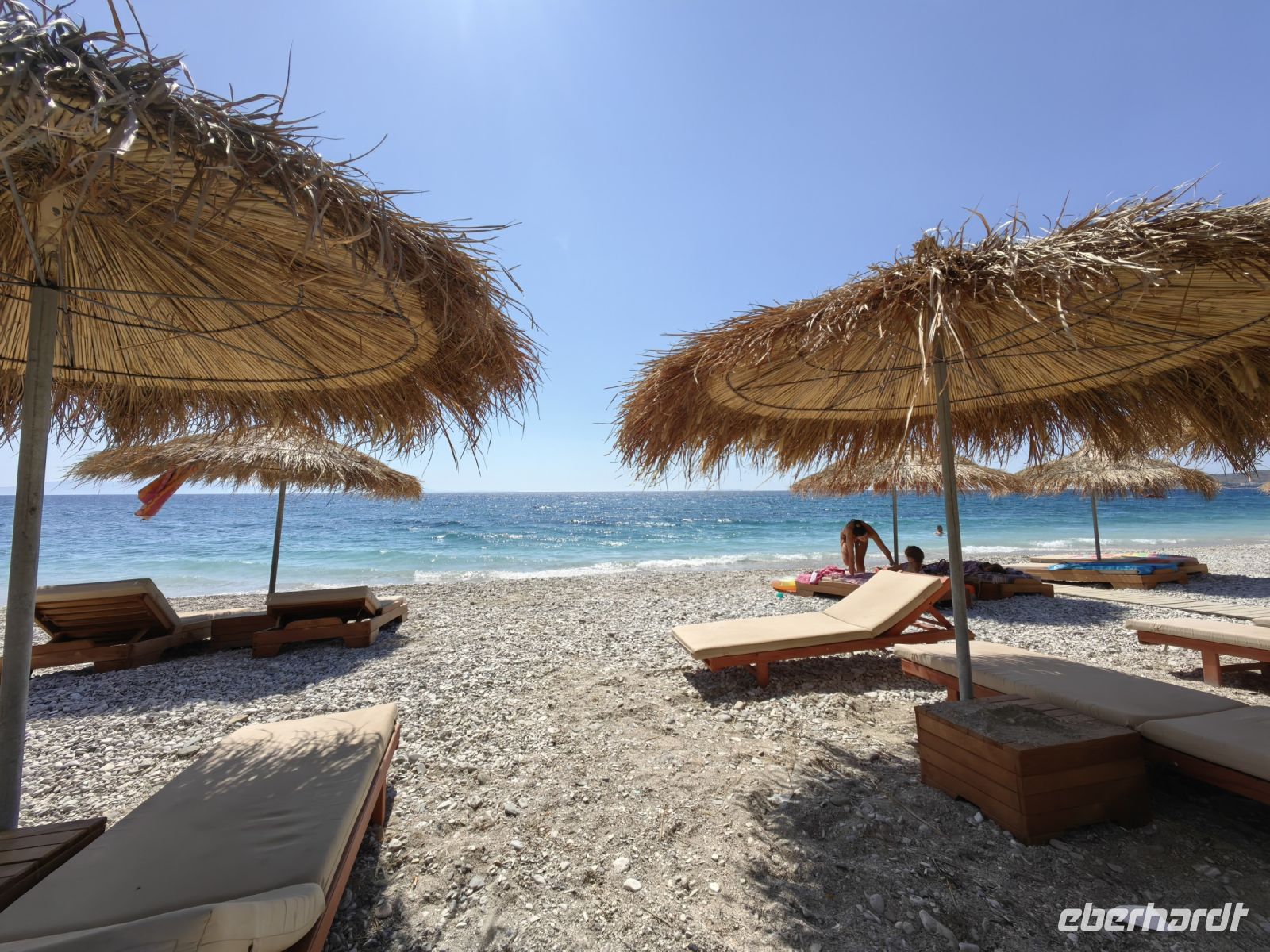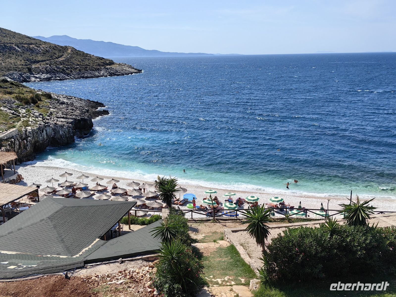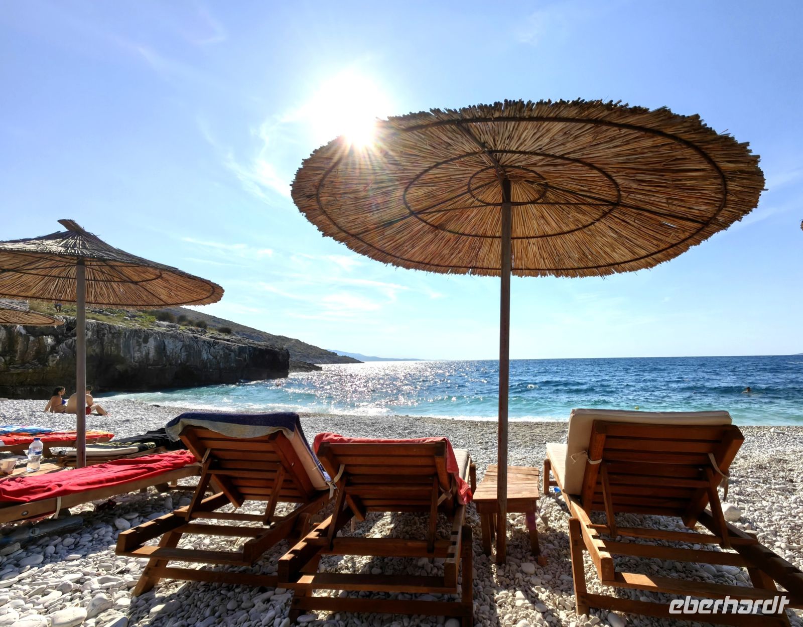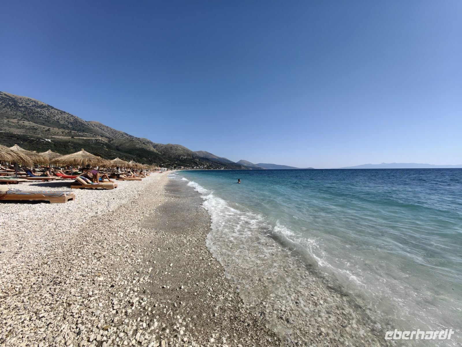 Nach so viel Kultur sind wir hungrig geworden und da wir am Meer sind, beschließen wir, an der malerischen Küste in ein Strandrestaurant in Borsh zu fahren. Hier ist der Strand zwar steinig aber dafür ist das Wasser glasklar und türkisblau.