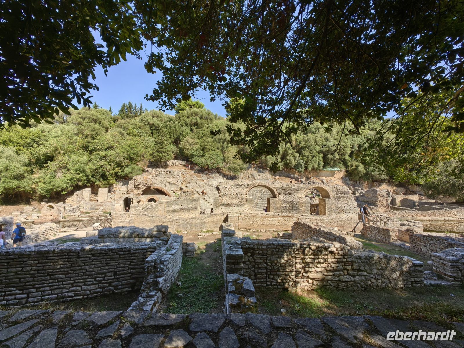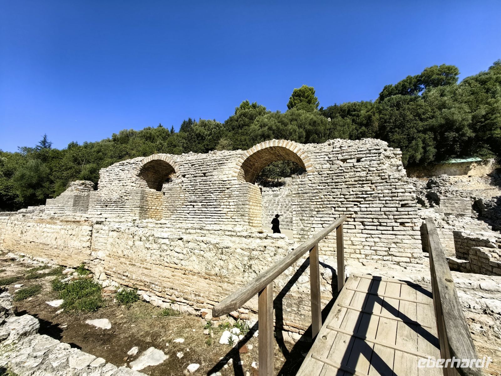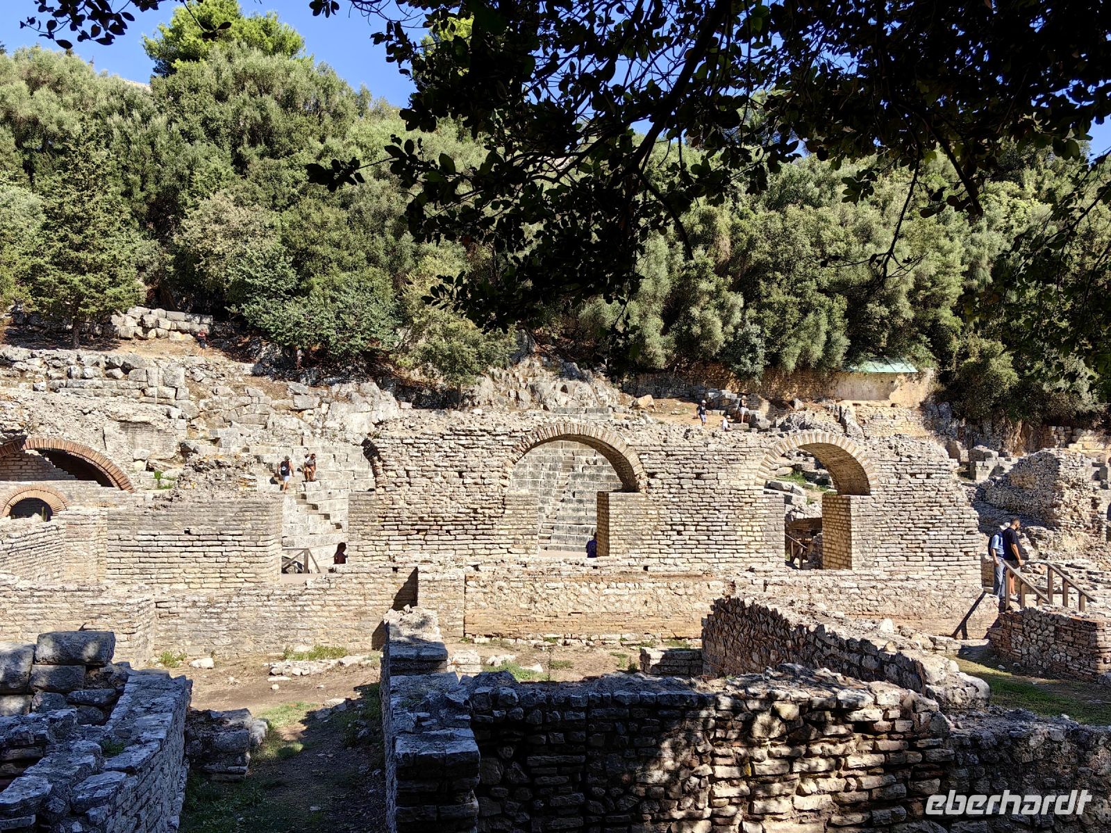 Bauhistorisch ist Butrint ein wichtiger Baustein im historischen Mosaik des Mittelmeerraumes. Beginnend im 8. Jahrhundert vor Christus bewahrt der Ort das Erbe der hellenistischen, byzantinischen, venezianischen und osmanischen Kulturen und Zivilisationen. Bereits in den Werken berühmter antiker Autoren wie Milet oder Vergil wird Butrint erwähnt. Als städtisches Zentrum einer weiten Region kam es zu Reichtum und Macht, wovon die zahlreichen Profan- und Prachtbauten, Straßen und Festungsanlagen zeugen. Wir schauen uns das Amphitheater an, welches ursprünglich 2.000 Zuschauern Platz bot, spazieren weiter am Aquädukt aus der römischen Zeit vorbei, sehen ein aus dem 5. Jahrhundert stammendes Baptisterium und Reste einer Basilika, die bis ins 16. Jahrhundert Bischofssitz war. Am Löwentor staunen wir über einen der sechs einstigen Eingänge der Anlage und am Schluß steigen wir hoch auf die Akropolis, den zur Stadt gehörenden Burgberg, auf dem sich ein kleines Museum befindet.
