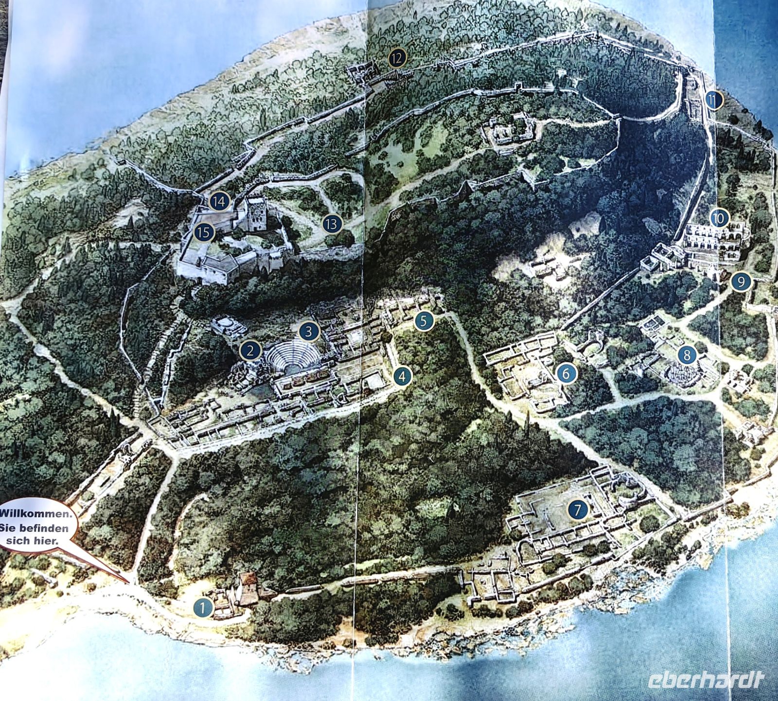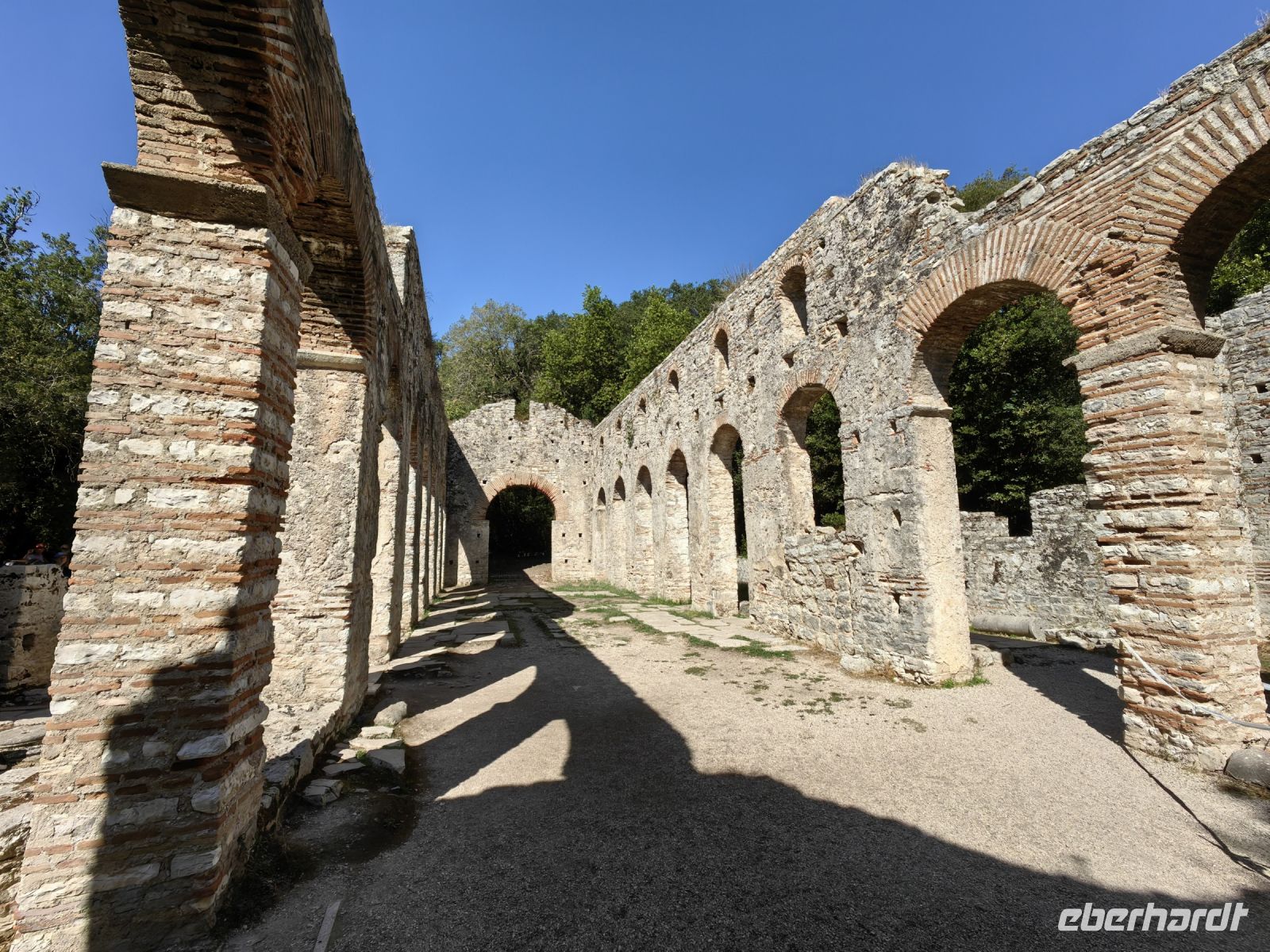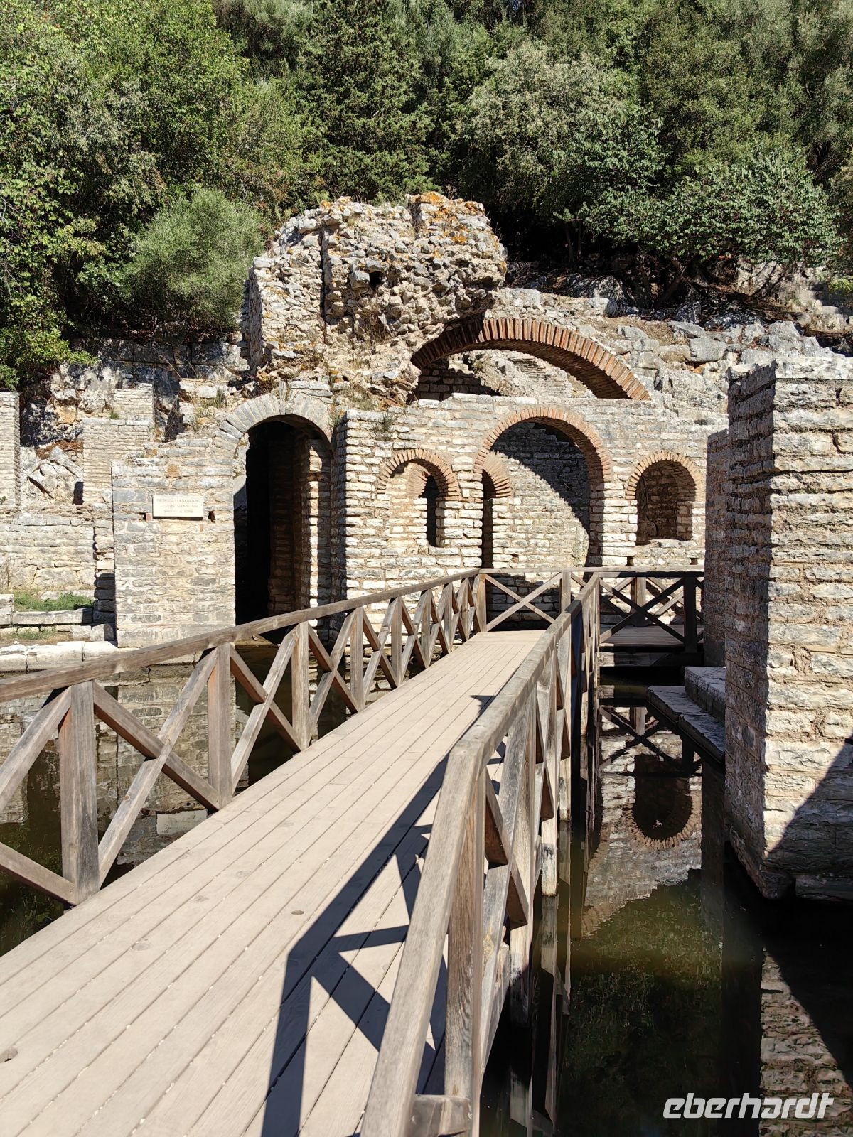 Bauhistorisch ist Butrint ein wichtiger Baustein im historischen Mosaik des Mittelmeerraumes. Beginnend im 8. Jahrhundert vor Christus bewahrt der Ort das Erbe der hellenistischen, byzantinischen, venezianischen und osmanischen Kulturen und Zivilisationen. Bereits in den Werken berühmter antiker Autoren wie Milet oder Vergil wird Butrint erwähnt. Als städtisches Zentrum einer weiten Region kam es zu Reichtum und Macht, wovon die zahlreichen Profan- und Prachtbauten, Straßen und Festungsanlagen zeugen. Wir schauen uns das Amphitheater an, welches ursprünglich 2.000 Zuschauern Platz bot, spazieren weiter am Aquädukt aus der römischen Zeit vorbei, sehen ein aus dem 5. Jahrhundert stammendes Baptisterium und Reste einer Basilika, die bis ins 16. Jahrhundert Bischofssitz war. Am Löwentor staunen wir über einen der sechs einstigen Eingänge der Anlage und am Schluß steigen wir hoch auf die Akropolis, den zur Stadt gehörenden Burgberg, auf dem sich ein kleines Museum befindet.
