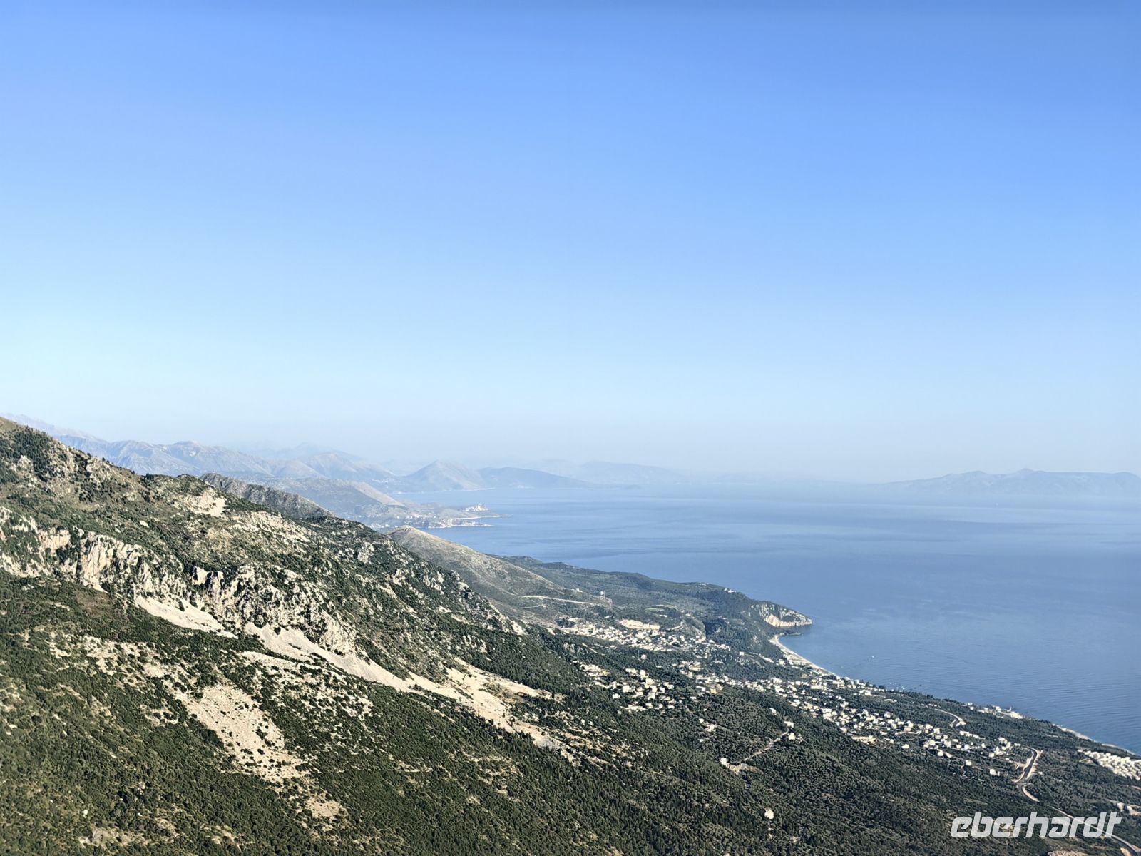 Auch hier würde es sich lohnen, länger zu verweilen, allerdings liegt unser heutiges Hotel mitten in den Bergen und wir winden uns mal wieder Serpentine für Serpentine auf den Llogorapaß von 1050 Metern Höhe hinauf. Das Wetter ist traumhaft, keine Wolke ist am Himmel, das Meer liegt ganz seidenglatt vor uns und schimmert tiefblau in der Sonne. Wir halten die Traumausblicke über die Steilküste auf unzähligen Fotos fest.
