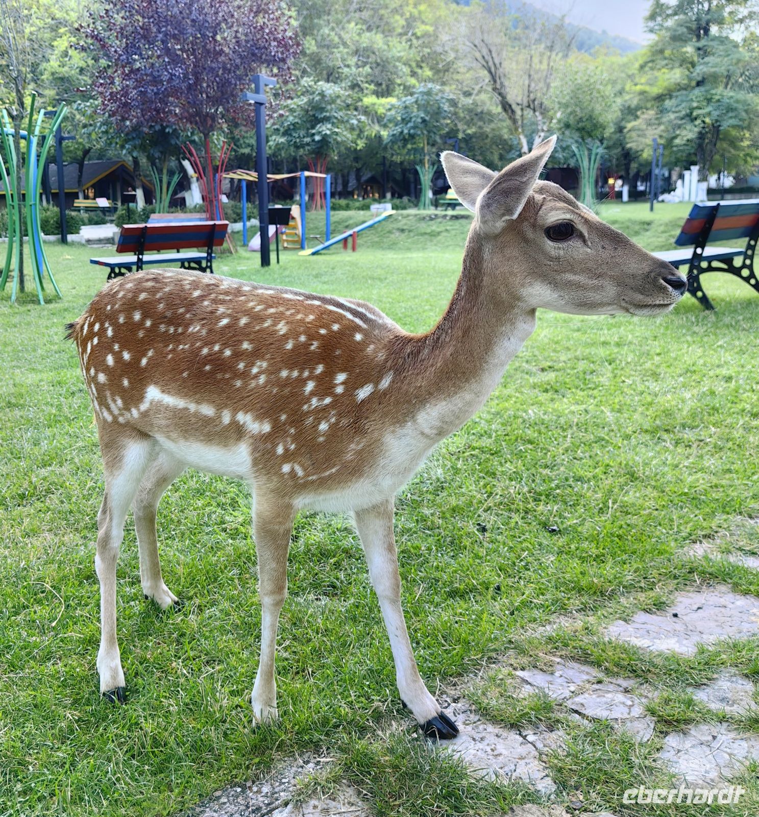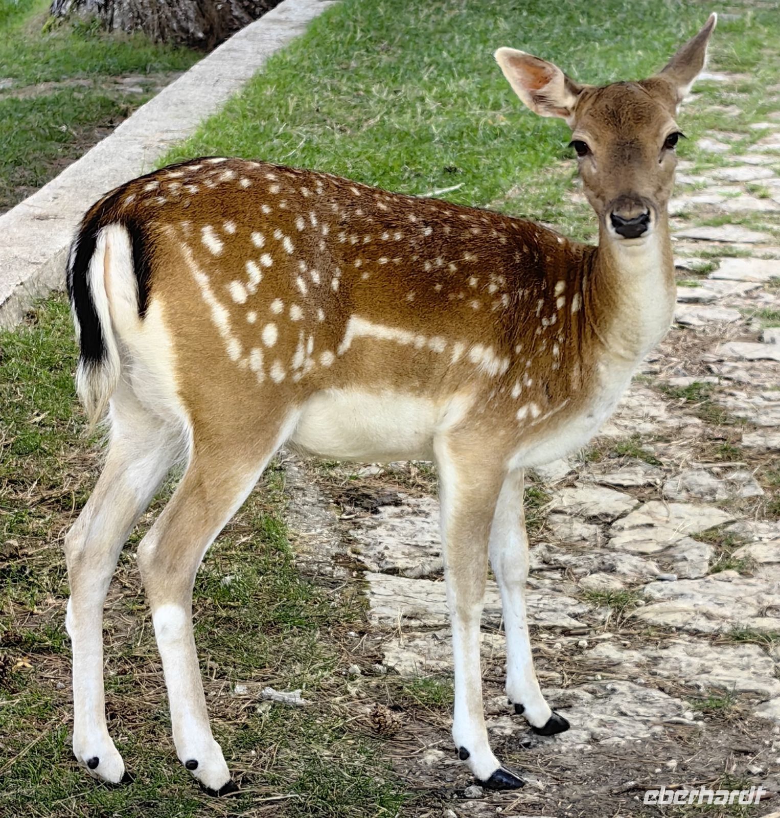 Der ganze Park hat eine Fläche von 1010 Hektar inmitten des Ceraunischen Gebirges und wir sind in einem Bergwald. Das Dammwild weidet auf den Wiesen vor dem Hotel und die frische Bergluft ist ein Genuß nach der Hitze am Vormittag.