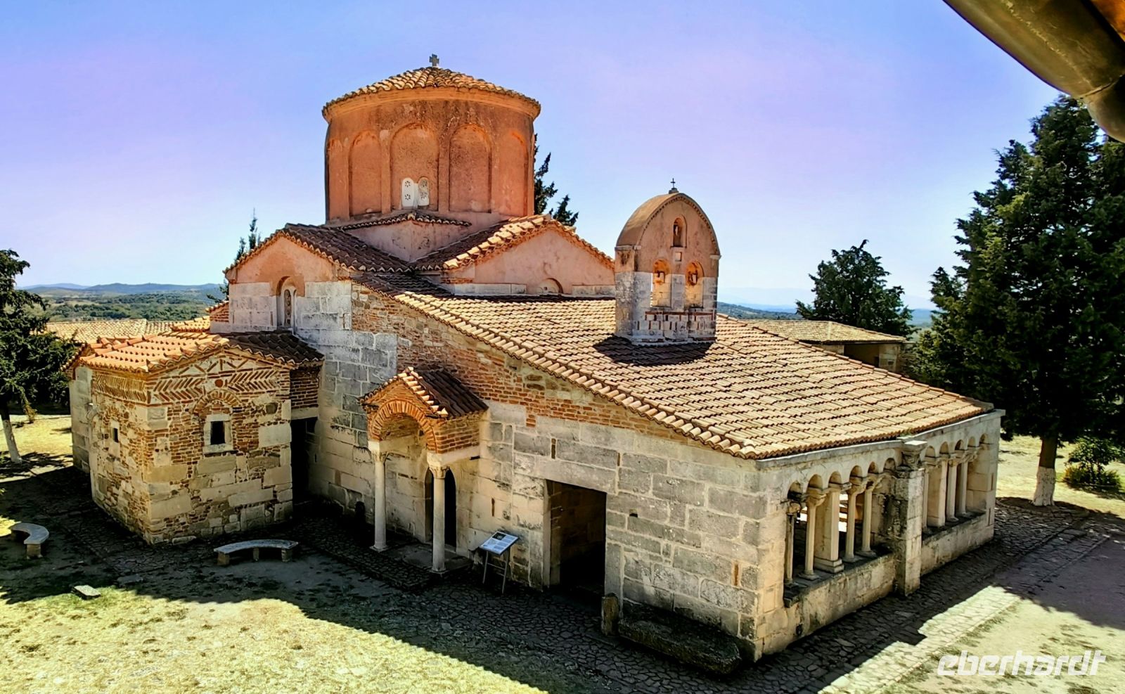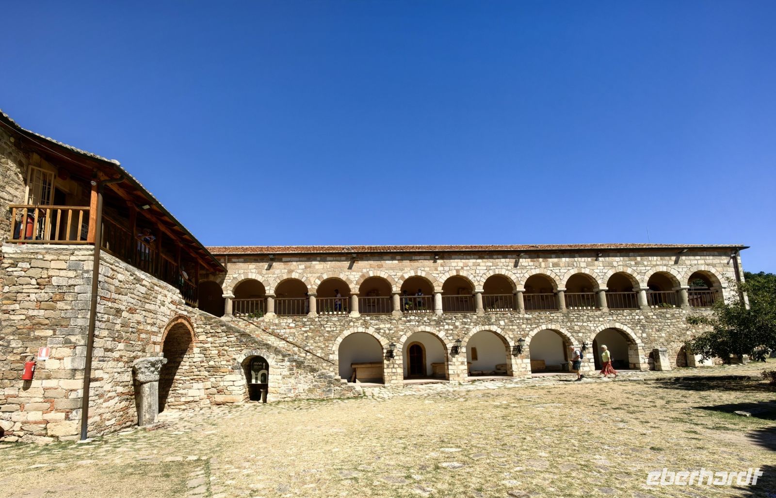 Heute haben wir die längste Strecke der Reise vor uns. Nicht, daß es wirklich viele Kilometer wären, aber die Straße durch die Berge windet sich in unzähligen Serpentinen und erinnert von der Beschaffenheit des Belags her an die kommunistischen Zeiten, was bedeutet, daß wir eine Durchschnittsgeschwindigkeit von nur 40 km/h erreichen, auch wenn wir in einem modernen Bus sitzen. Wozu sollte man früher auch Straßen errichten, unter Diktator Hoxha war der Privatbesitz von Autos verboten.