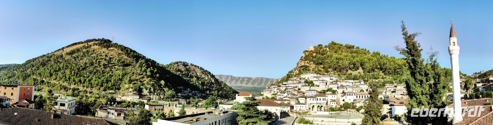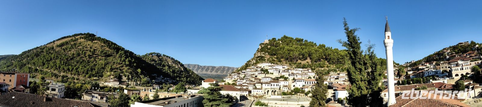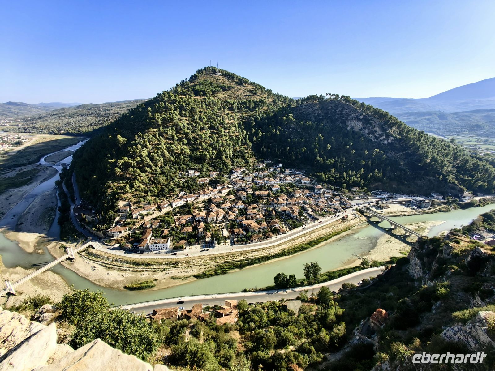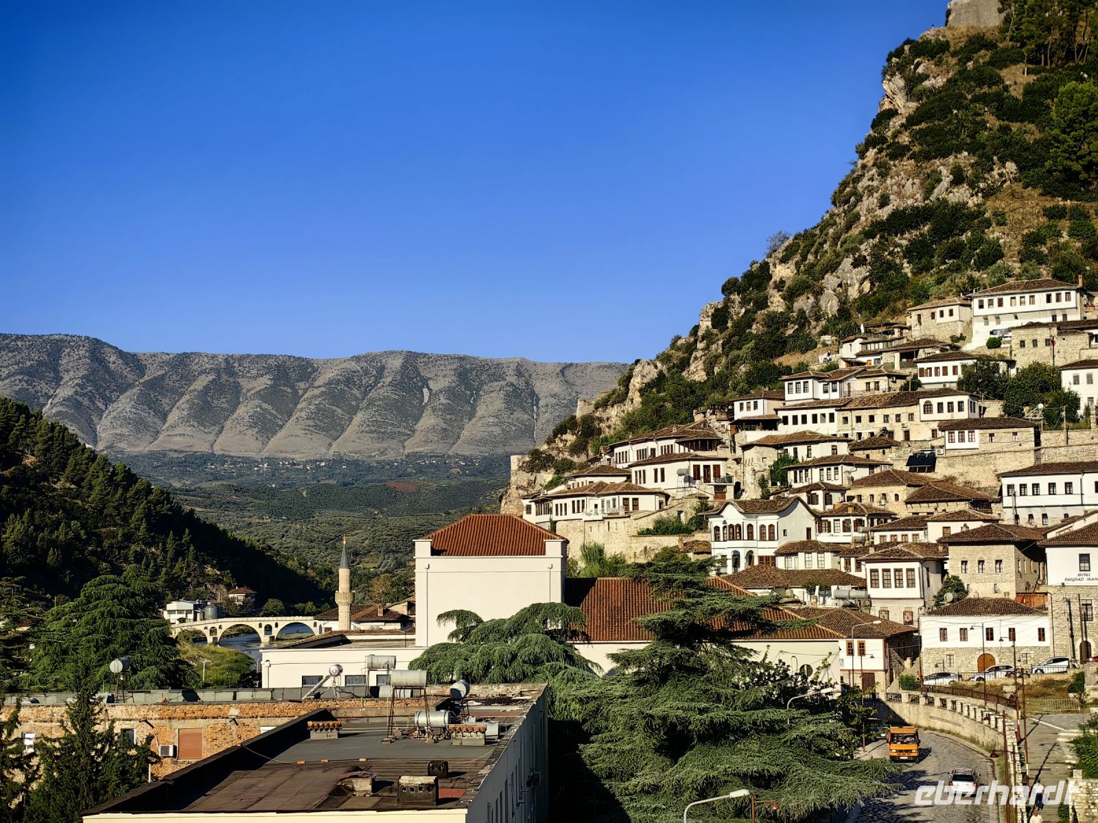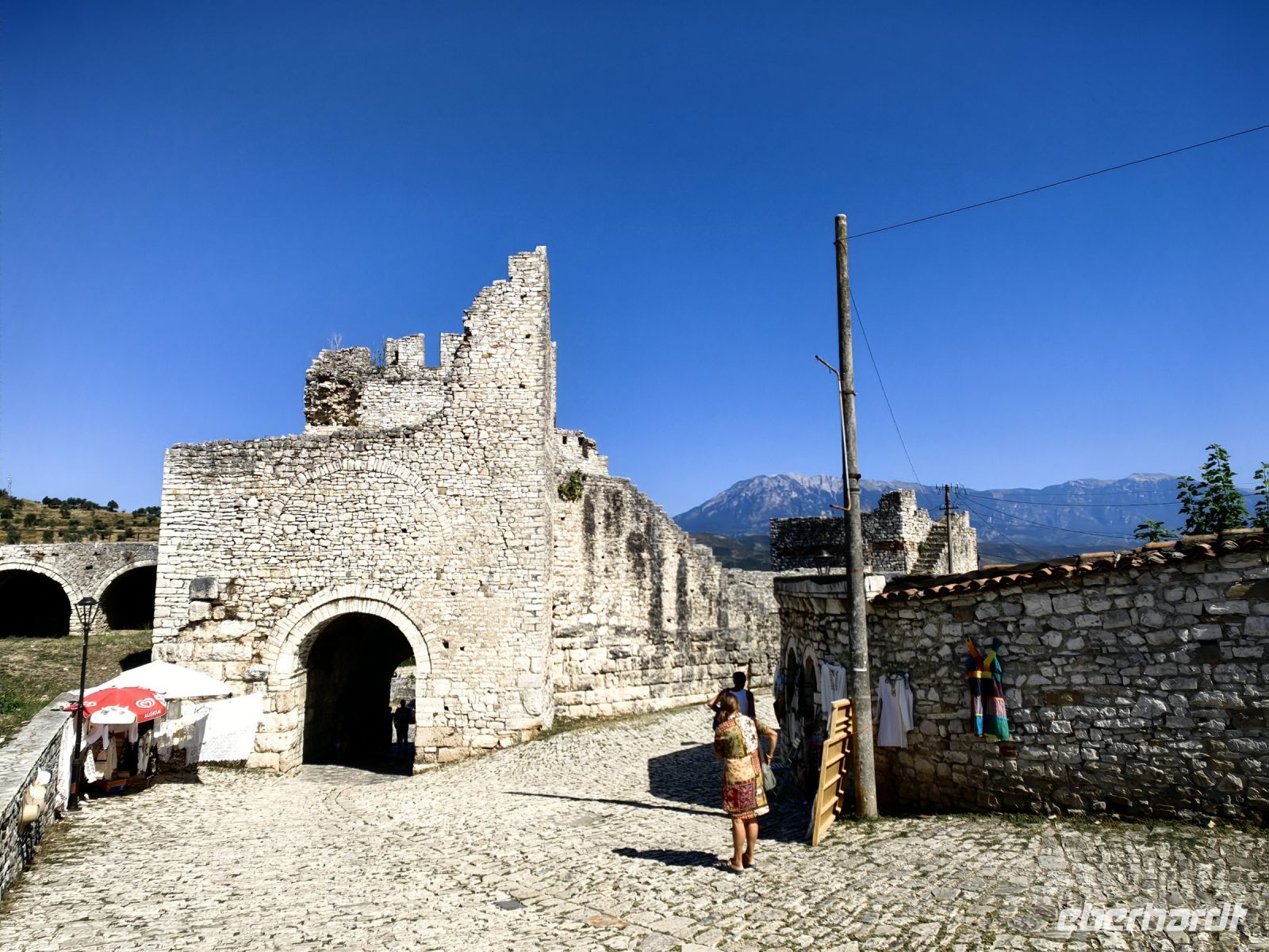 Zu allererst erklimmen wir die Burg von Berat, die hoch oben auf einem felsigen Hügel oberhalb des Osumflusses liegt. Die Anlage, die auf römische und byzantinische Vorgängerbauten zurückgeht, wurde in ihrer heutigen Gestalt im 13. Jahrhundert errichtet. Im Mittelalter fanden alle Wohnhäuser der Einwohner der Stadt, 20 Kirchen und eine Moschee hier drin platz. Von den meisten Gotteshäusern sind nur noch Ruinen erhalten, aber im Burggelände selbst wohnen heute noch Menschen. Vom südlichen Ende der Burganlage hat man einen atemberaubenden Ausblick auf die Dreifaltigkeitskirche aus dem 13. Jahrhundert und die gesamte Altstadt der unter UNESCO Weltkulturerbe stehenden Stadt Berat.
