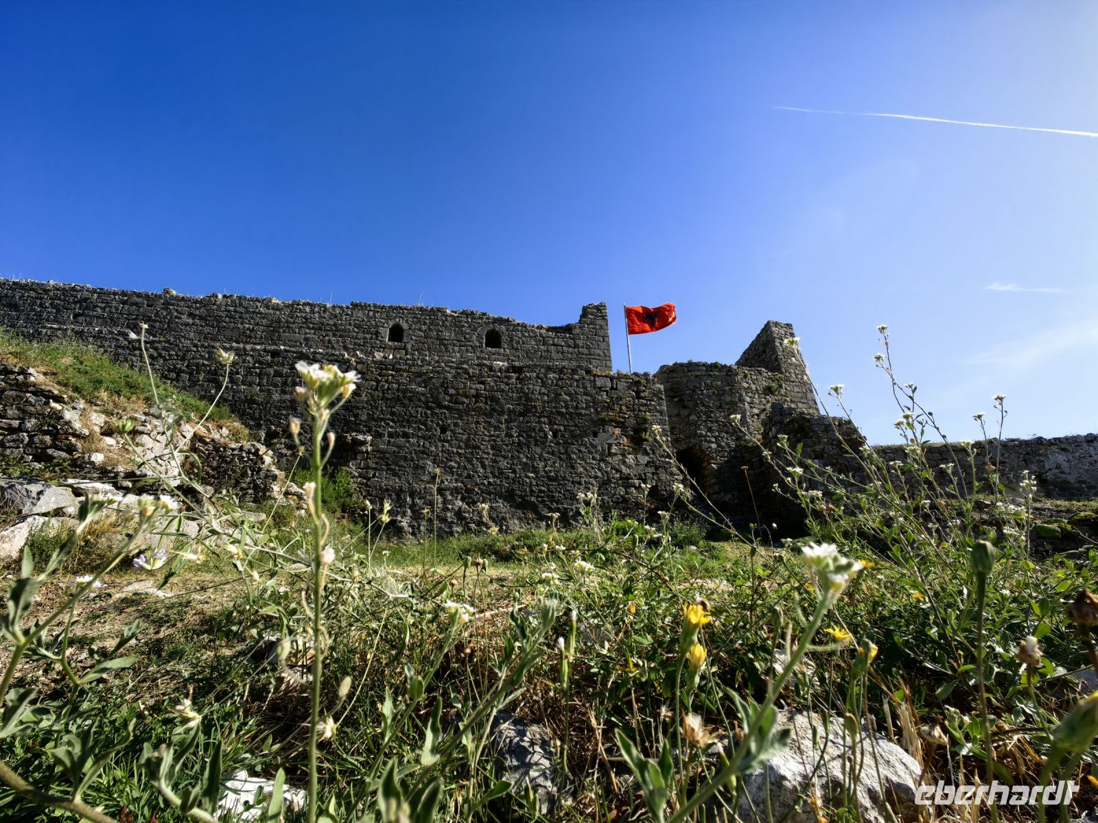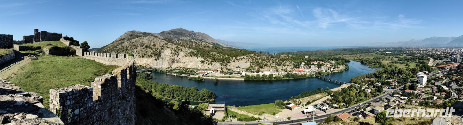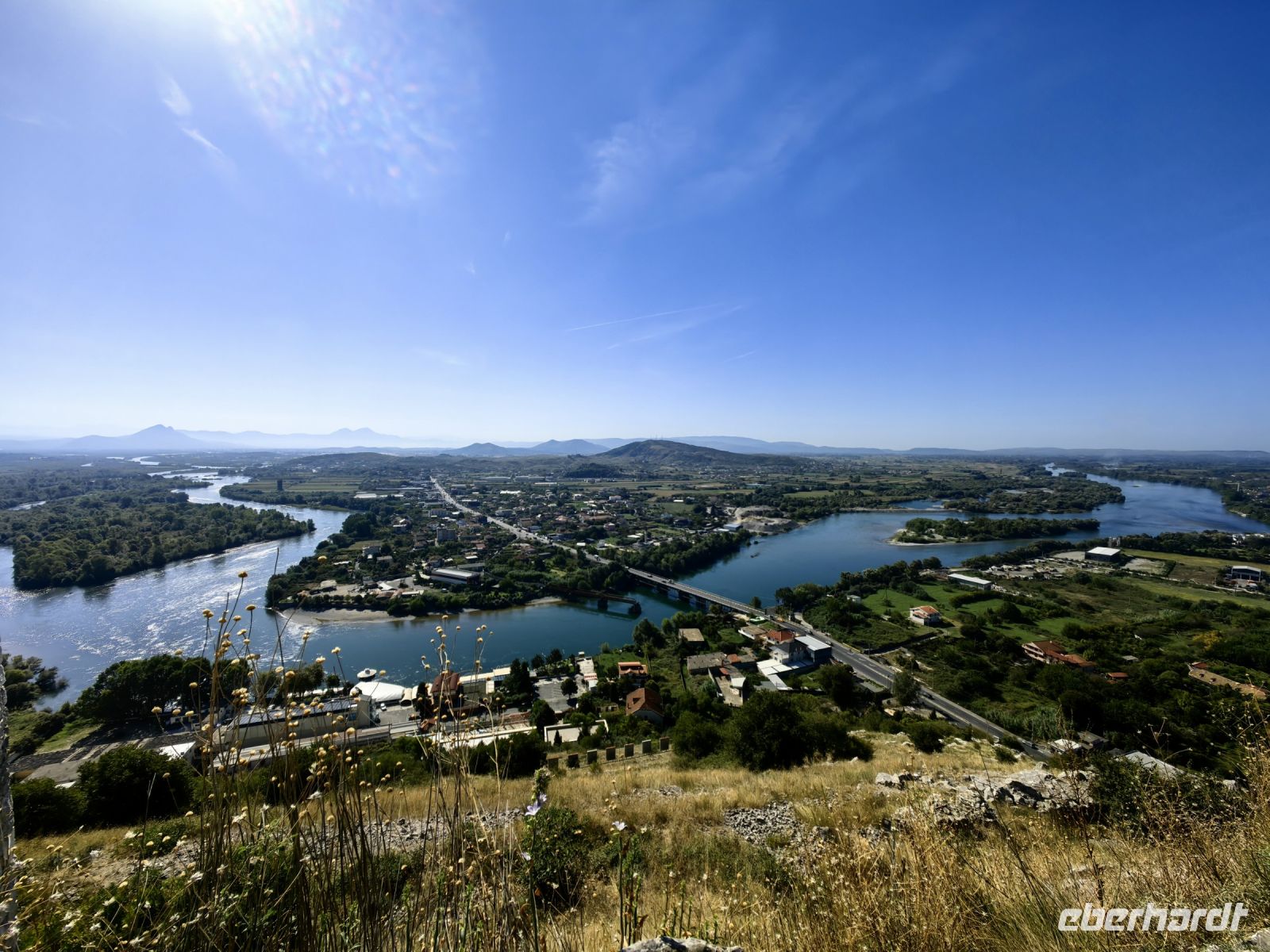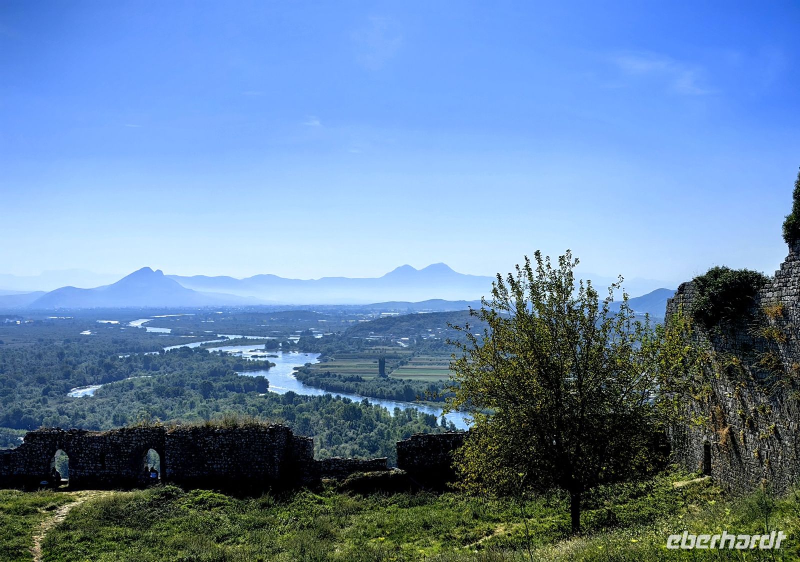 Am Morgen erklimmen wir die hoch oben auf dem Hausberg von Shkodra gelegene Burg Rozafa. Sehr steil müssen wir nach oben steigen, um wenig später mit einem umwerfenden Ausblick belohnt zu werden. Wir sehen die drei Flüsse Buna, Drin und Kir und die alten Mauern, die eine Fläche von etwa neun Hektar umgeben. Das Innere der Burg ist durch Mauern von drei Höfen mit Toren dazwischen getrennt. Der dritte Hof ist etwas kleiner als die anderen und liegt auf dem höchsten Teil des Hügels. Die Illyrer gründeten bereits im 4. Jahrhundert vor Christus hier oben eine Stadt mit dem Namen Scodra, während der Römerzeit dehnte sie sich bis in die Ebene am Fuße des Hügels aus. Später nutzten die Byzantiner, lokale Fürsten und die Venezianer die Anlage und bauten die Befestigungsanlagen aus. 1479 nahmen die Osmanen die Burg nach langer Belagerungszeit ein und nutzten sie bis 1913. Wir genießen die unbeschreiblichen Rundblicke in die Täler mit den mäandernden drei Flüssen und auf die Berge im Hintergrund.