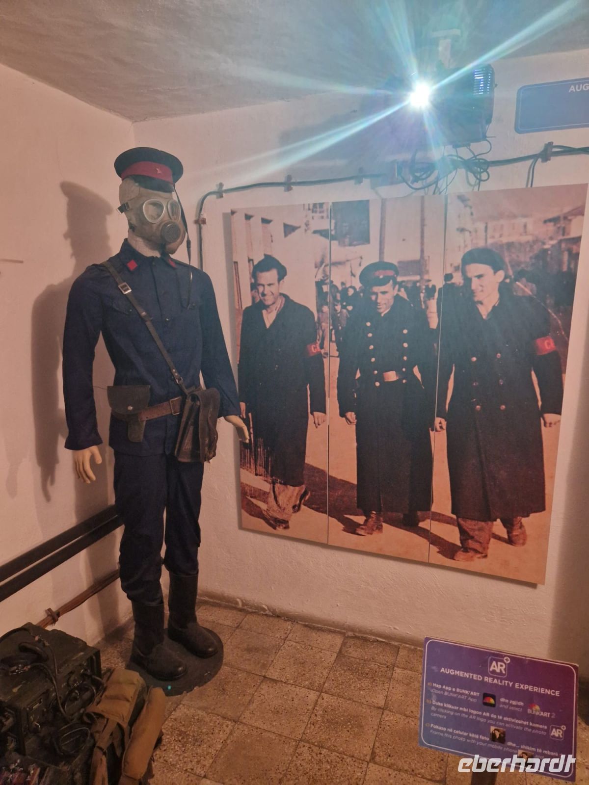 Gemeinsam mit Alert schauen wir uns wenig später den Museumsbunker an. Diktator Enver Hoxha, der bis 1985 die Sozialistische Volksrepublik Albanien mit eiserner Hand regierte, errichtete etwa 200.000 dieser Ungeheuer im ganzen Land. Unter seiner Herrschaft wurde Albanien von der Außenwelt völlig isoliert und aus Angst vor feindlichen Angriffen errichtete man in seinem Auftrag diese Pillbox-Bunker. Ein Bunker war für vier Albaner gedacht, denn jeder war unter dem kommunistischen Regime verpflichtet, sein Land zu verteidigen. So wurden überall in Albanien verstreut an strategisch günstigen Orten diese gruseligen Betonpilze errichtet. Im Bunker herrscht stickige Luft und wir sehen ein Sammelsurium aus Abhöreinrichtungen der verschiedenen Jahrzehnte und Fotos von Menschen, die während der Diktatur zur Zwangsarbeit genötigt wurden. Solch einen Bunker verläßt man gern schnell wieder, es ist sehr bedrückend und kaum vorstellbar, wie es für die Albaner gewesen sein muß, überall im Land so etwas herumstehen zu haben, immer mit dem Gedanken im Kopf, ein Feind könnte angreifen und man muß da hinein!