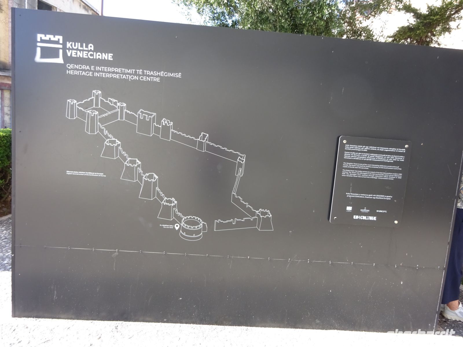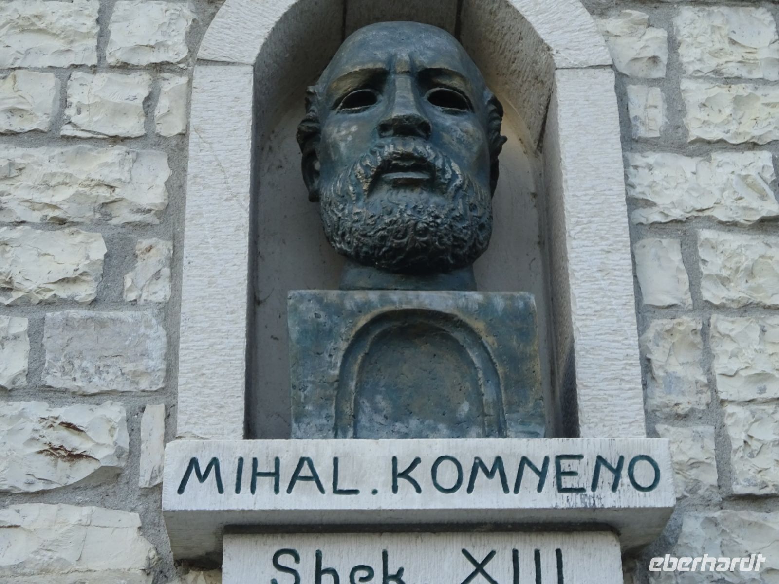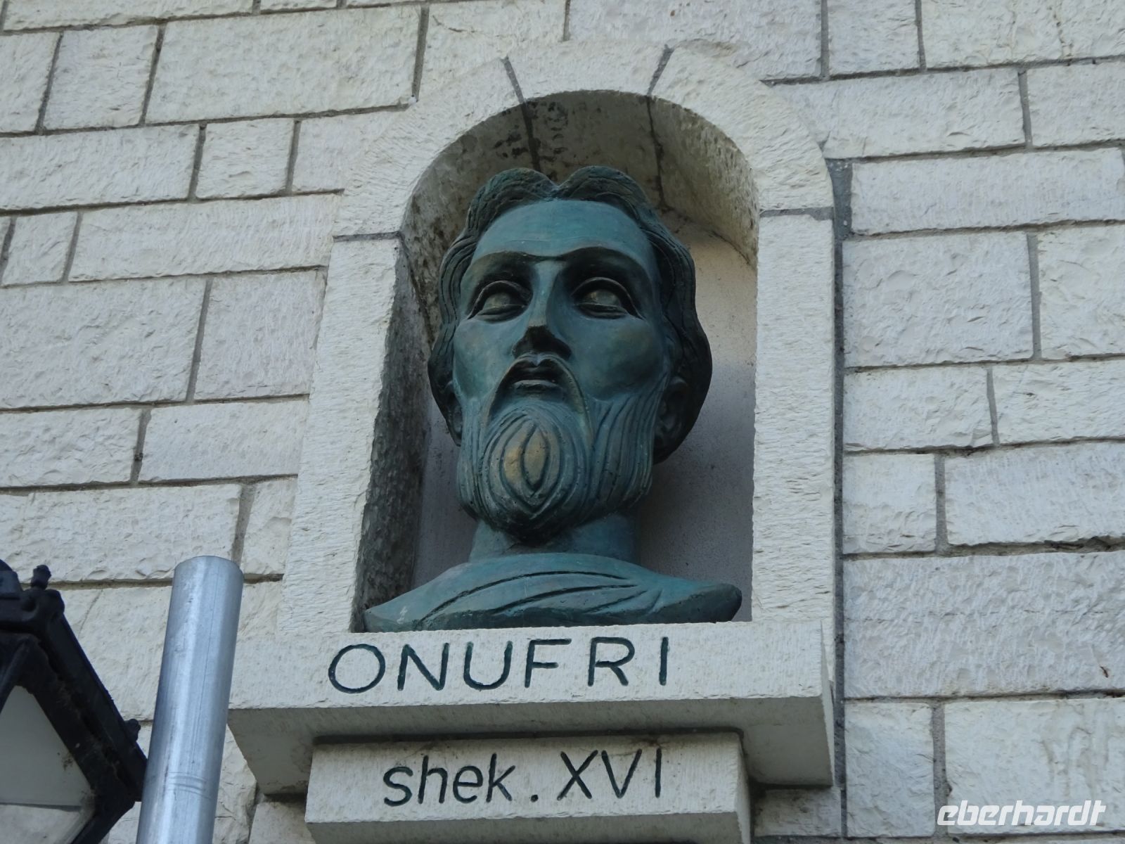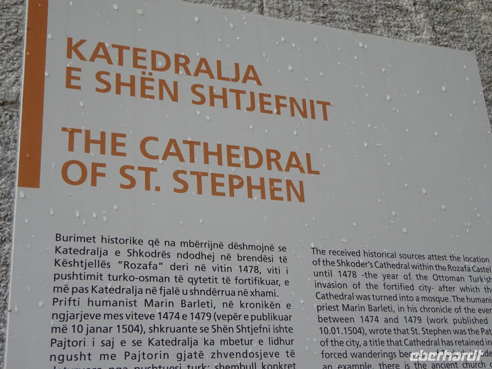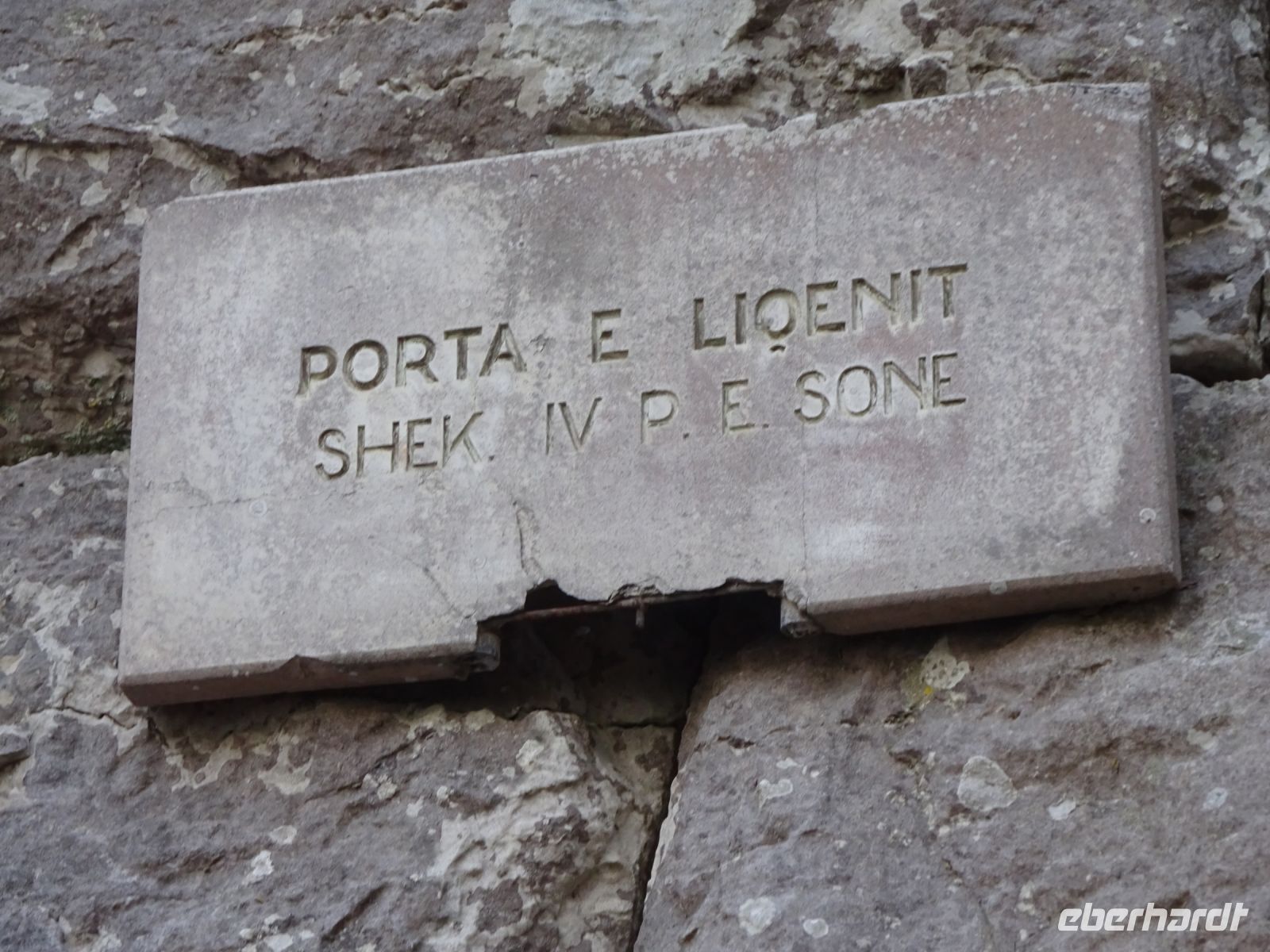Am Morgen setzten wir zunächst unseren Rundgang durch Tirana fort. Andi zeigte uns einen Bunker, einen ehemaligen Atombunker, einen von mehr als 500.000, die Enver Hoxha errichten ließ. Diese Bunker waren übers ganze Land verteilt, vor allem aber in der Nähe von Außengrenzen Albaniens vorhanden. Wir gingen weiter entlang des Boulevards, sahen verschiedene Regierungsgebäude, moderne Bauten, auch die inzwischen umgebaute Pyramide, schließlich noch das Hauptgebäude der Universität. Heute steht der Besuch zweier weiterer Orte auf unserem Programm: Kruja und Shkodra. In Kruja besuchen wir das Skanderbeg-Museum, das dem albanischen Nationalhelden Skanderbeg gewidmet ist. Andi führt uns durch die Sammlungen und erklärt anhand der zahlreichen Exponate und Schautafeln die Geschichte Albaniens. Wir wissen zunächst wenig über dieses Land, hören aufmerksam zu, fragen immer wieder, wollen es wissen. Schon auf dem Weg zum Museum lockte uns der bunte Basar mit seinen schönen Ständen. Der war nun endlich nach dem Museum an der Reihe. Gemütlich schlenderten wir an den schönen Auslagen vorbei, wo sich schnell auch das eine oder andere Souvenir fand. Und Byrek konnte man hier essen. Das ist Blätterteig mit ganz unterschiedlichen Füllungen, landestypisch und sehr schmackhaft, in allen Varianten. Dann fahren wir weiter nach Shkodra, in die fünftgrößte Stadt Albaniens. Auf einem Spaziergang lernen wir die schön restaurierten Straßenzüge Shkodras kennen, machen eine Mittagspause in einem der zahlreichen Cafés und besuchen noch die beeindruckende katholische Kathedrale. Zwischendurch mussten wir uns unterstellen, denn es gab ein ordentliches Gewitter. Bei diesem Wetter sind die Steine hinauf auf die Festung Rozafa ausgesprochen rutschig, d.h. man geht besser nicht hinauf. Von der Legende, die sich um den Bau dieser Festung rankt, erzählte uns Andi, auch vom Relief der Rozafa mit ihrem kleinen Sohn am Eingang zur Festung.
