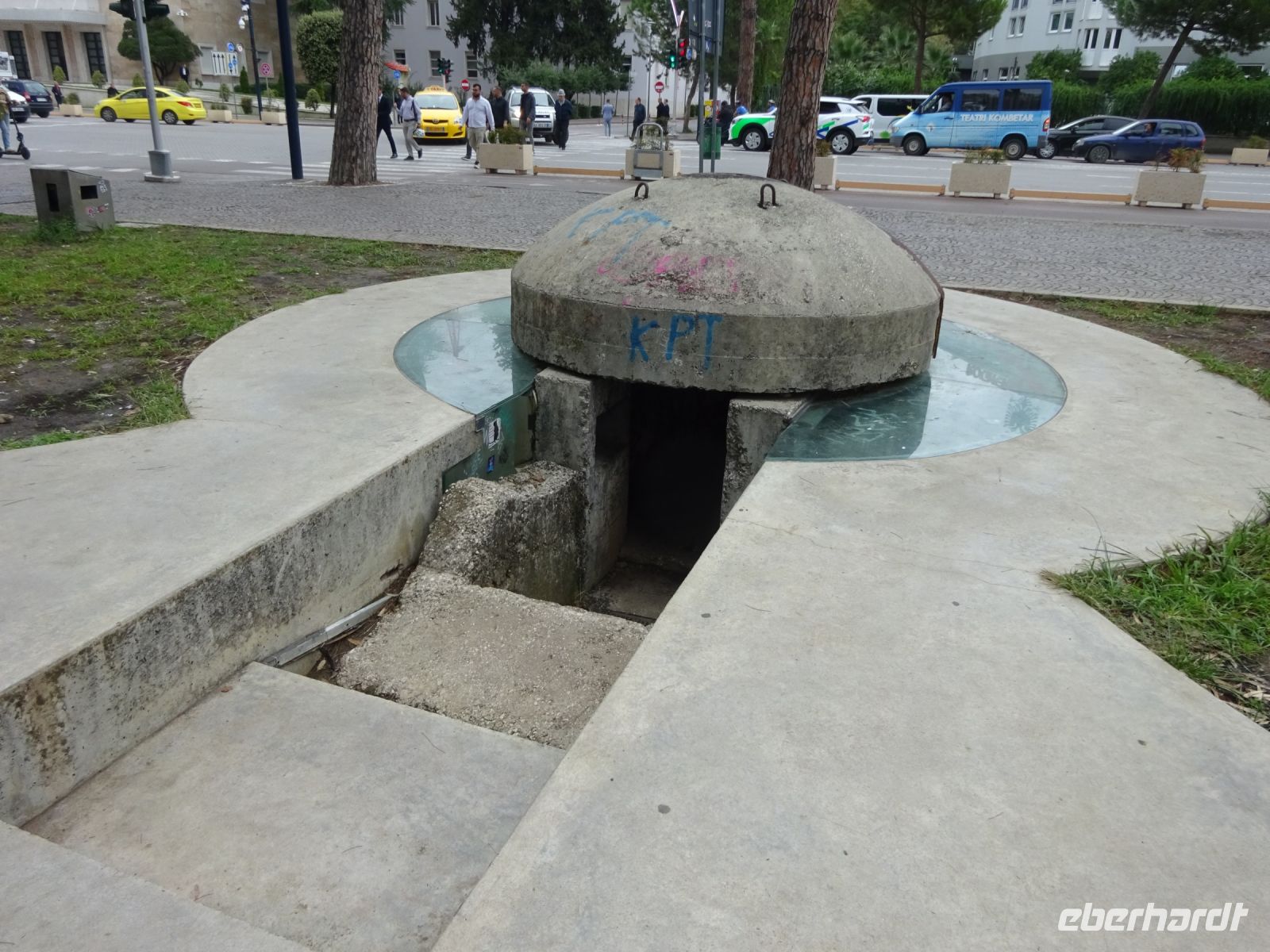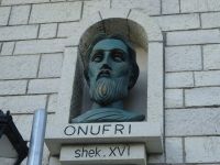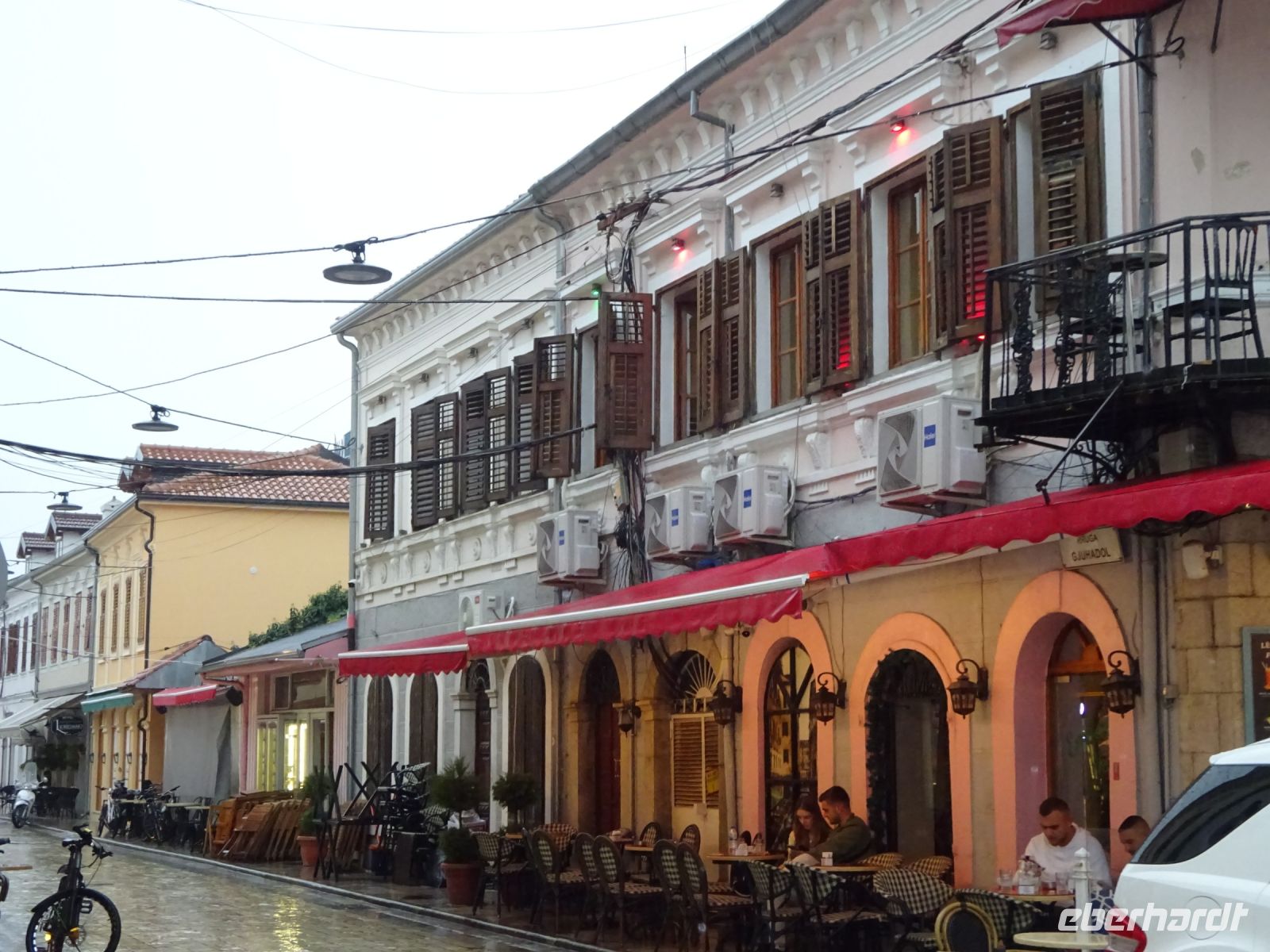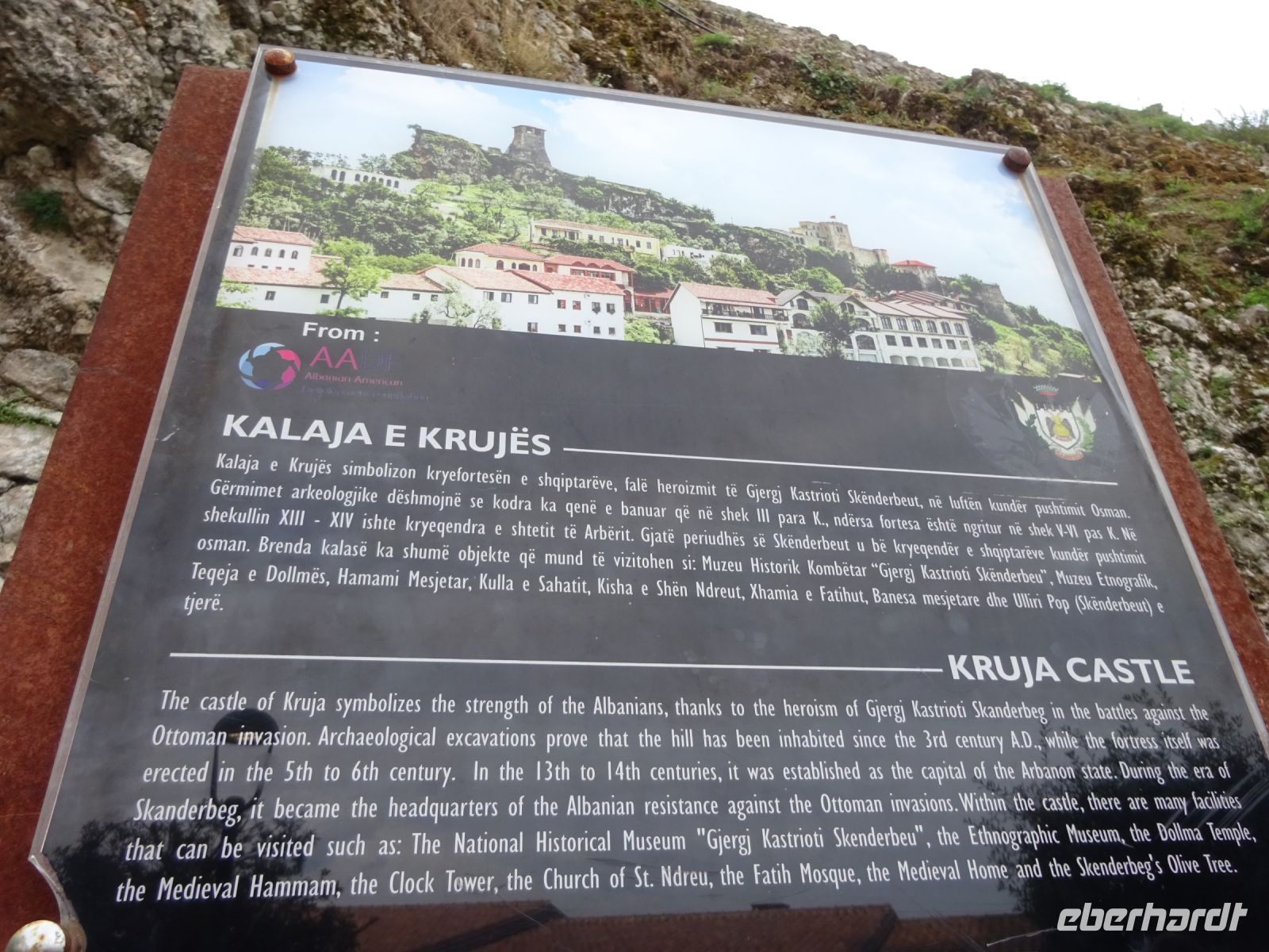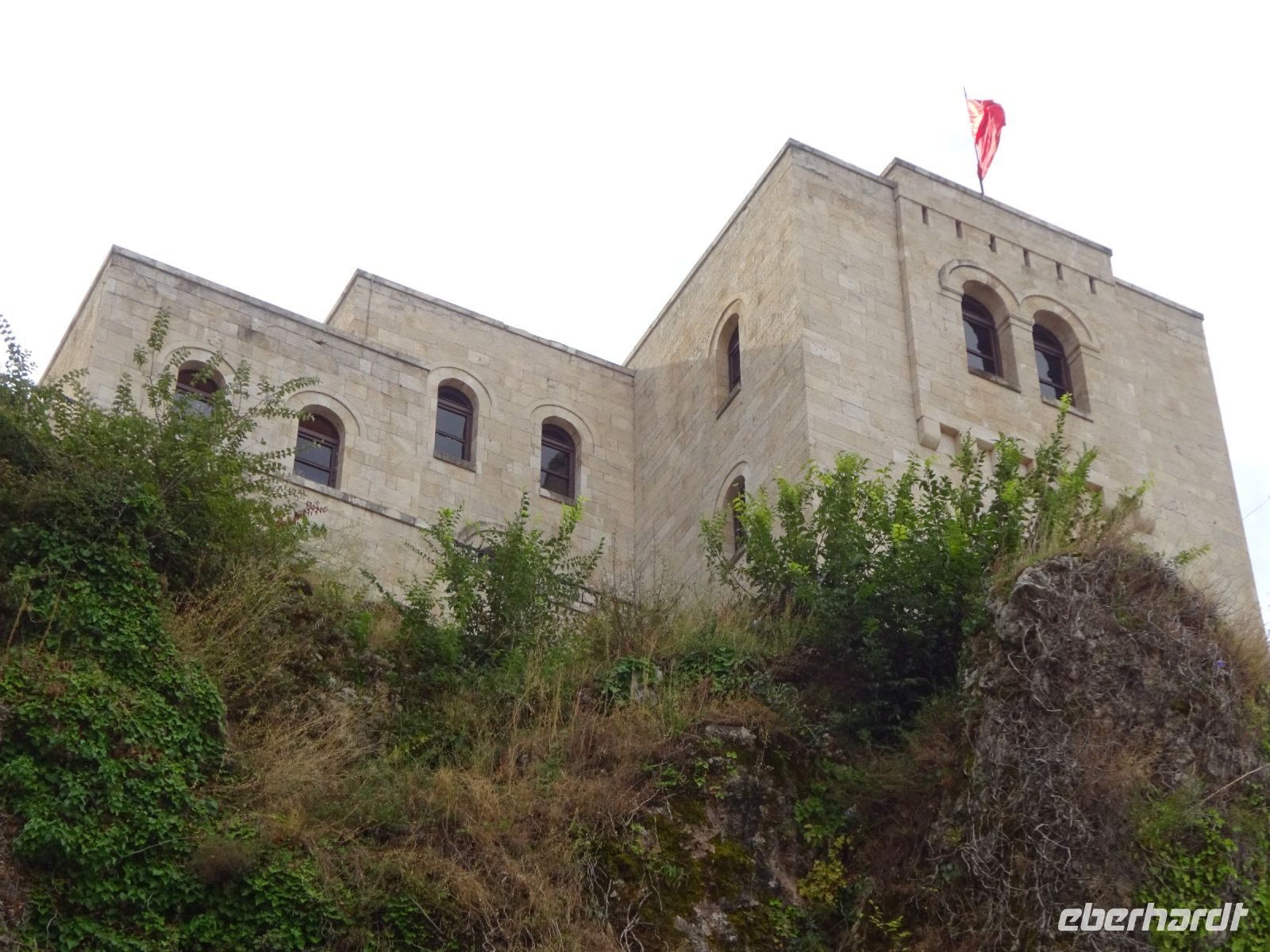 Am Morgen setzten wir zunächst unseren Rundgang durch Tirana fort. Andi zeigte uns einen Bunker, einen ehemaligen Atombunker, einen von mehr als 500.000, die Enver Hoxha errichten ließ. Diese Bunker waren übers ganze Land verteilt, vor allem aber in der Nähe von Außengrenzen Albaniens vorhanden. Wir gingen weiter entlang des Boulevards, sahen verschiedene Regierungsgebäude, moderne Bauten, auch die inzwischen umgebaute Pyramide, schließlich noch das Hauptgebäude der Universität. Heute steht der Besuch zweier weiterer Orte auf unserem Programm: Kruja und Shkodra. In Kruja besuchen wir das Skanderbeg-Museum, das dem albanischen Nationalhelden Skanderbeg gewidmet ist. Andi führt uns durch die Sammlungen und erklärt anhand der zahlreichen Exponate und Schautafeln die Geschichte Albaniens. Wir wissen zunächst wenig über dieses Land, hören aufmerksam zu, fragen immer wieder, wollen es wissen. Schon auf dem Weg zum Museum lockte uns der bunte Basar mit seinen schönen Ständen. Der war nun endlich nach dem Museum an der Reihe. Gemütlich schlenderten wir an den schönen Auslagen vorbei, wo sich schnell auch das eine oder andere Souvenir fand. Und Byrek konnte man hier essen. Das ist Blätterteig mit ganz unterschiedlichen Füllungen, landestypisch und sehr schmackhaft, in allen Varianten. Dann fahren wir weiter nach Shkodra, in die fünftgrößte Stadt Albaniens. Auf einem Spaziergang lernen wir die schön restaurierten Straßenzüge Shkodras kennen, machen eine Mittagspause in einem der zahlreichen Cafés und besuchen noch die beeindruckende katholische Kathedrale. Zwischendurch mussten wir uns unterstellen, denn es gab ein ordentliches Gewitter. Bei diesem Wetter sind die Steine hinauf auf die Festung Rozafa ausgesprochen rutschig, d.h. man geht besser nicht hinauf. Von der Legende, die sich um den Bau dieser Festung rankt, erzählte uns Andi, auch vom Relief der Rozafa mit ihrem kleinen Sohn am Eingang zur Festung.