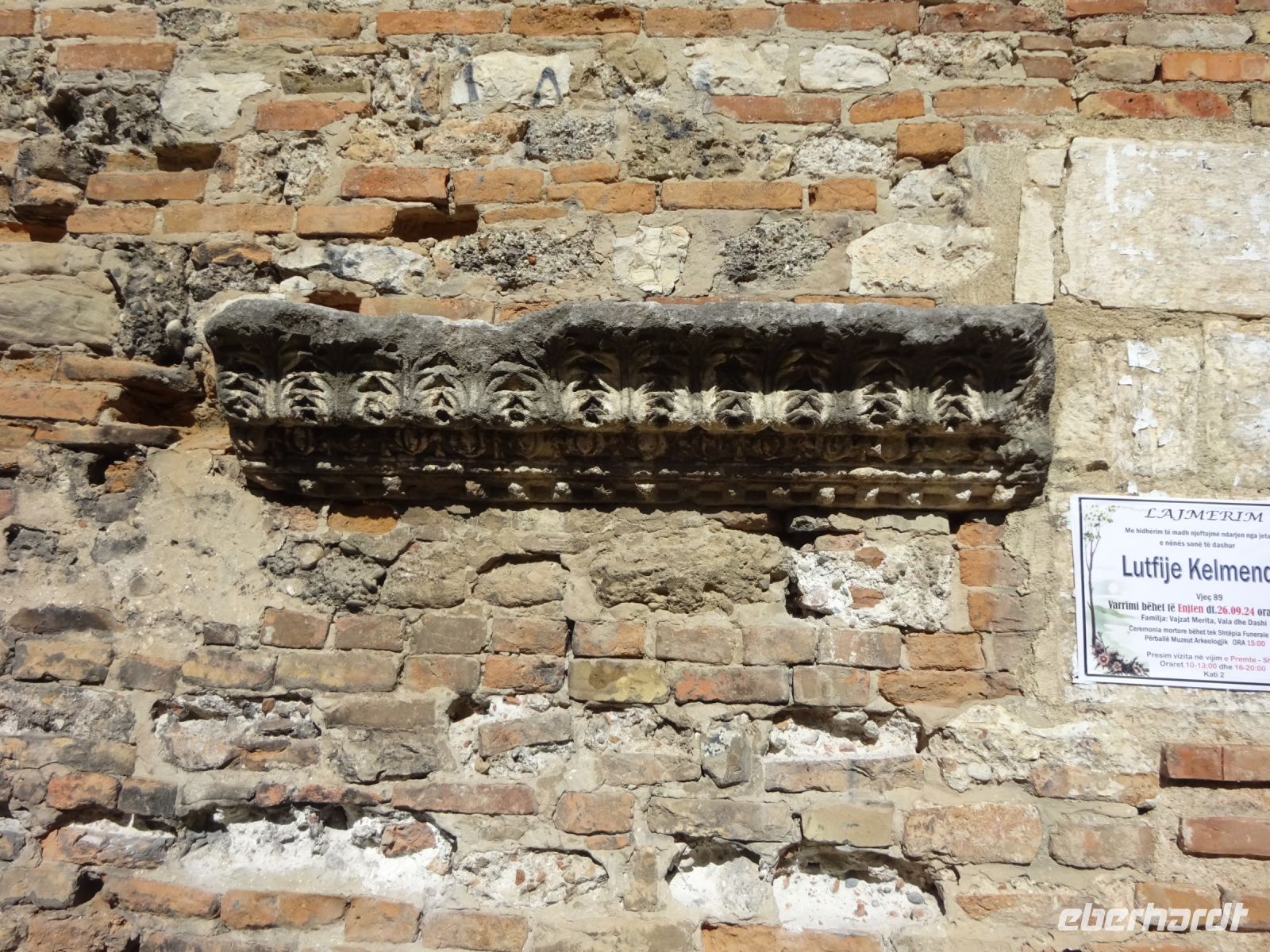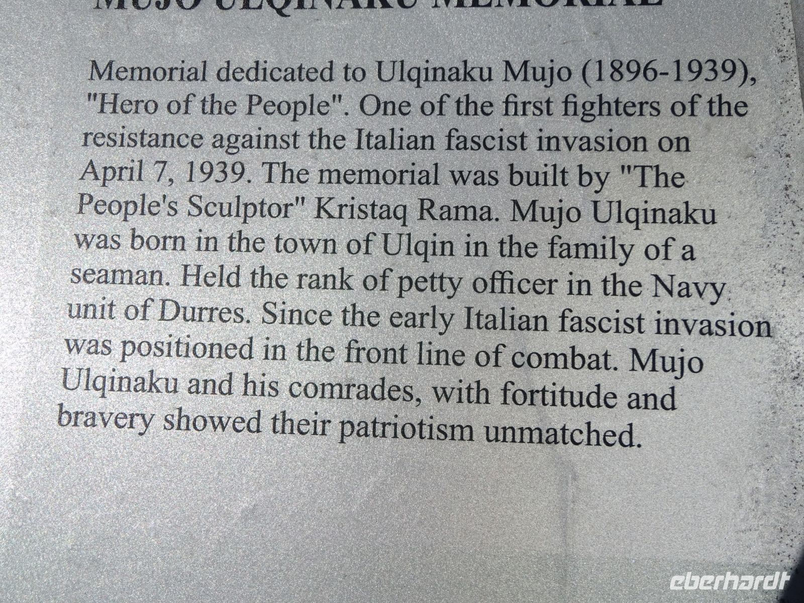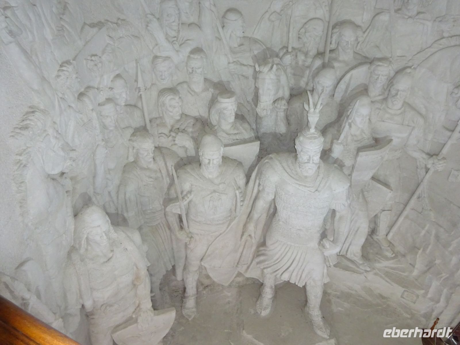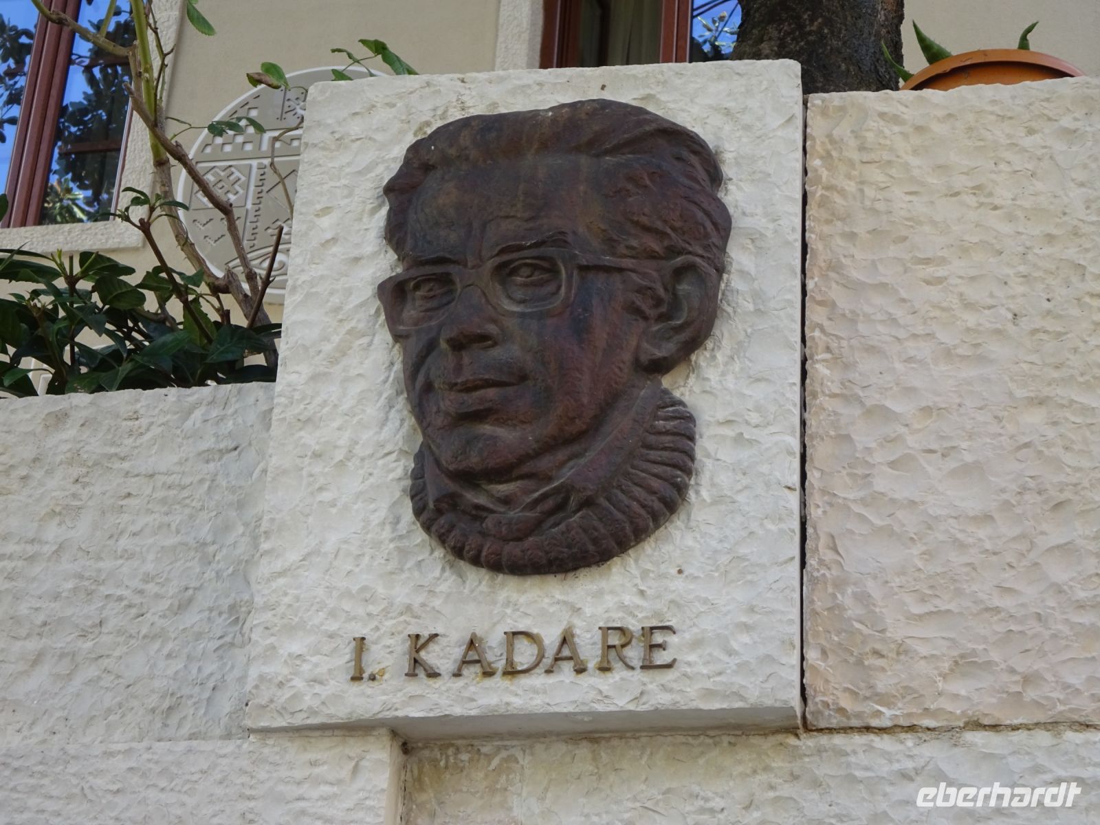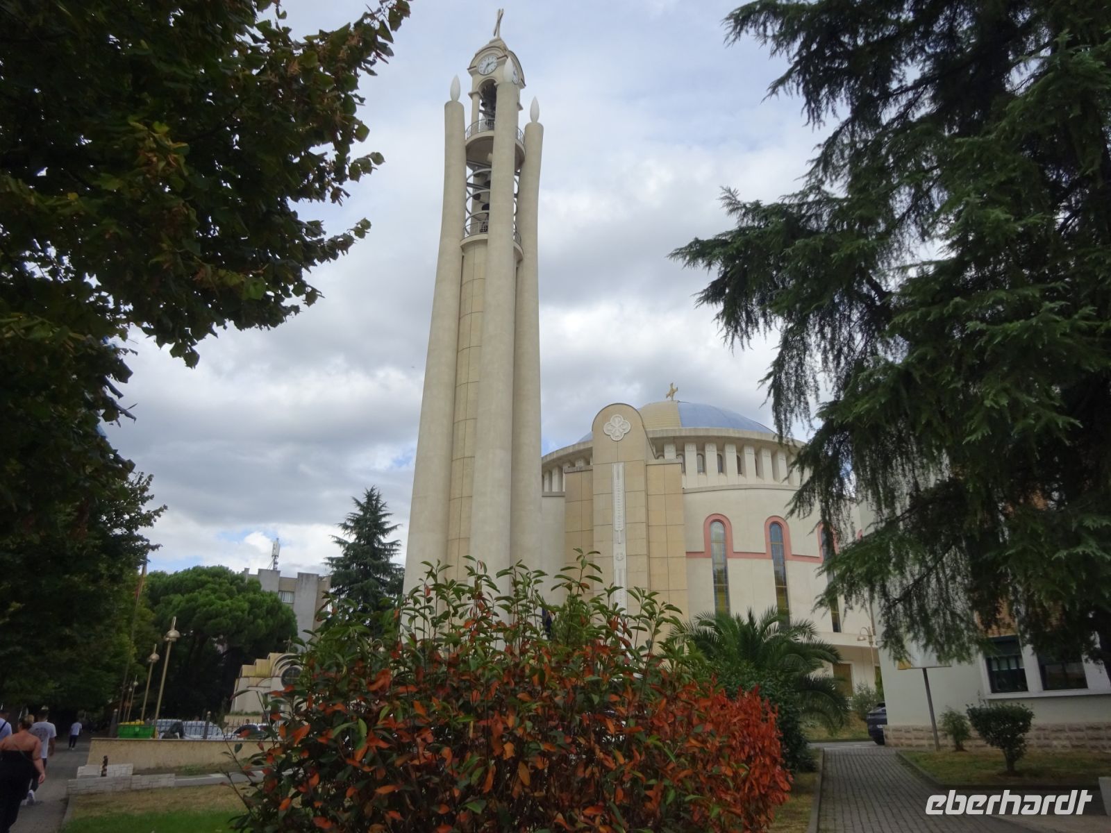 Am Morgen setzten wir zunächst unseren Rundgang durch Tirana fort. Andi zeigte uns einen Bunker, einen ehemaligen Atombunker, einen von mehr als 500.000, die Enver Hoxha errichten ließ. Diese Bunker waren übers ganze Land verteilt, vor allem aber in der Nähe von Außengrenzen Albaniens vorhanden. Wir gingen weiter entlang des Boulevards, sahen verschiedene Regierungsgebäude, moderne Bauten, auch die inzwischen umgebaute Pyramide, schließlich noch das Hauptgebäude der Universität. Heute steht der Besuch zweier weiterer Orte auf unserem Programm: Kruja und Shkodra. In Kruja besuchen wir das Skanderbeg-Museum, das dem albanischen Nationalhelden Skanderbeg gewidmet ist. Andi führt uns durch die Sammlungen und erklärt anhand der zahlreichen Exponate und Schautafeln die Geschichte Albaniens. Wir wissen zunächst wenig über dieses Land, hören aufmerksam zu, fragen immer wieder, wollen es wissen. Schon auf dem Weg zum Museum lockte uns der bunte Basar mit seinen schönen Ständen. Der war nun endlich nach dem Museum an der Reihe. Gemütlich schlenderten wir an den schönen Auslagen vorbei, wo sich schnell auch das eine oder andere Souvenir fand. Und Byrek konnte man hier essen. Das ist Blätterteig mit ganz unterschiedlichen Füllungen, landestypisch und sehr schmackhaft, in allen Varianten. Dann fahren wir weiter nach Shkodra, in die fünftgrößte Stadt Albaniens. Auf einem Spaziergang lernen wir die schön restaurierten Straßenzüge Shkodras kennen, machen eine Mittagspause in einem der zahlreichen Cafés und besuchen noch die beeindruckende katholische Kathedrale. Zwischendurch mussten wir uns unterstellen, denn es gab ein ordentliches Gewitter. Bei diesem Wetter sind die Steine hinauf auf die Festung Rozafa ausgesprochen rutschig, d.h. man geht besser nicht hinauf. Von der Legende, die sich um den Bau dieser Festung rankt, erzählte uns Andi, auch vom Relief der Rozafa mit ihrem kleinen Sohn am Eingang zur Festung.