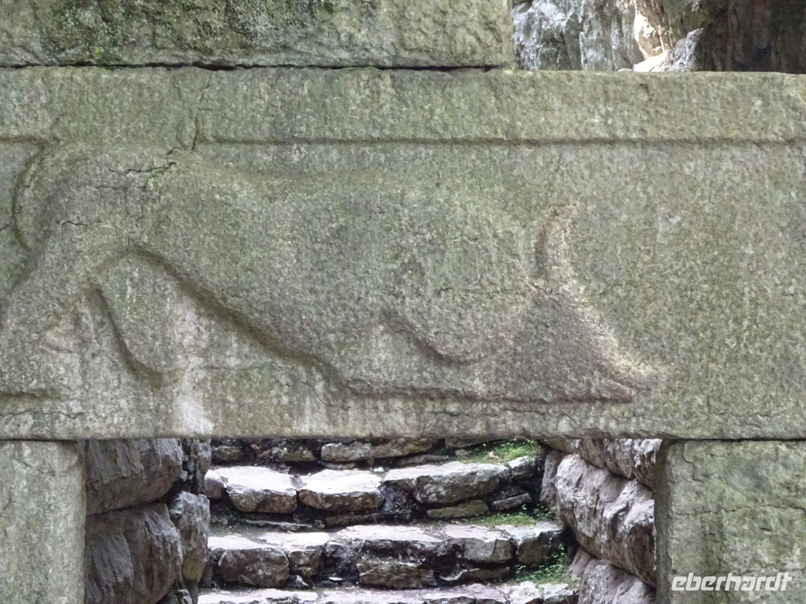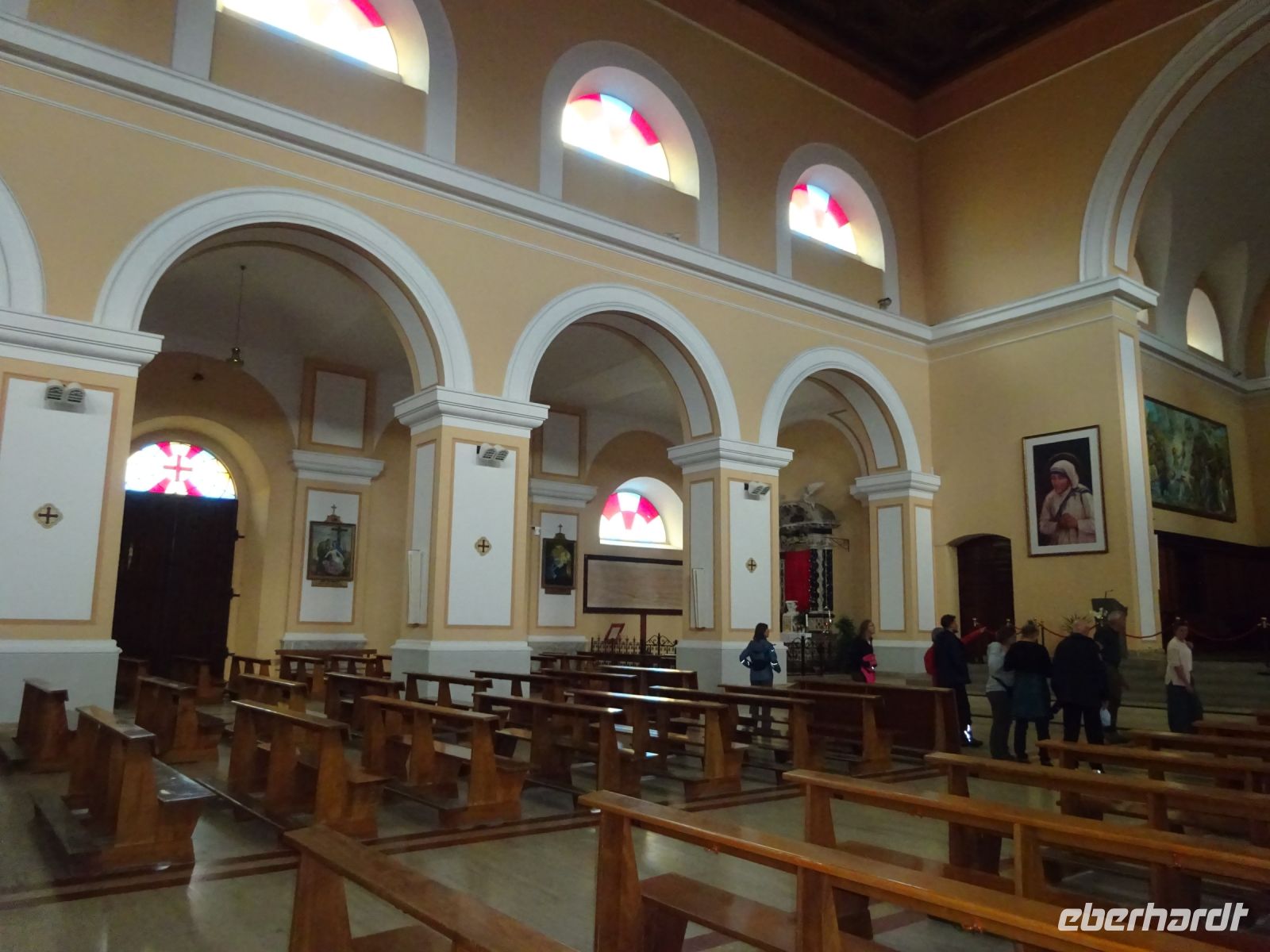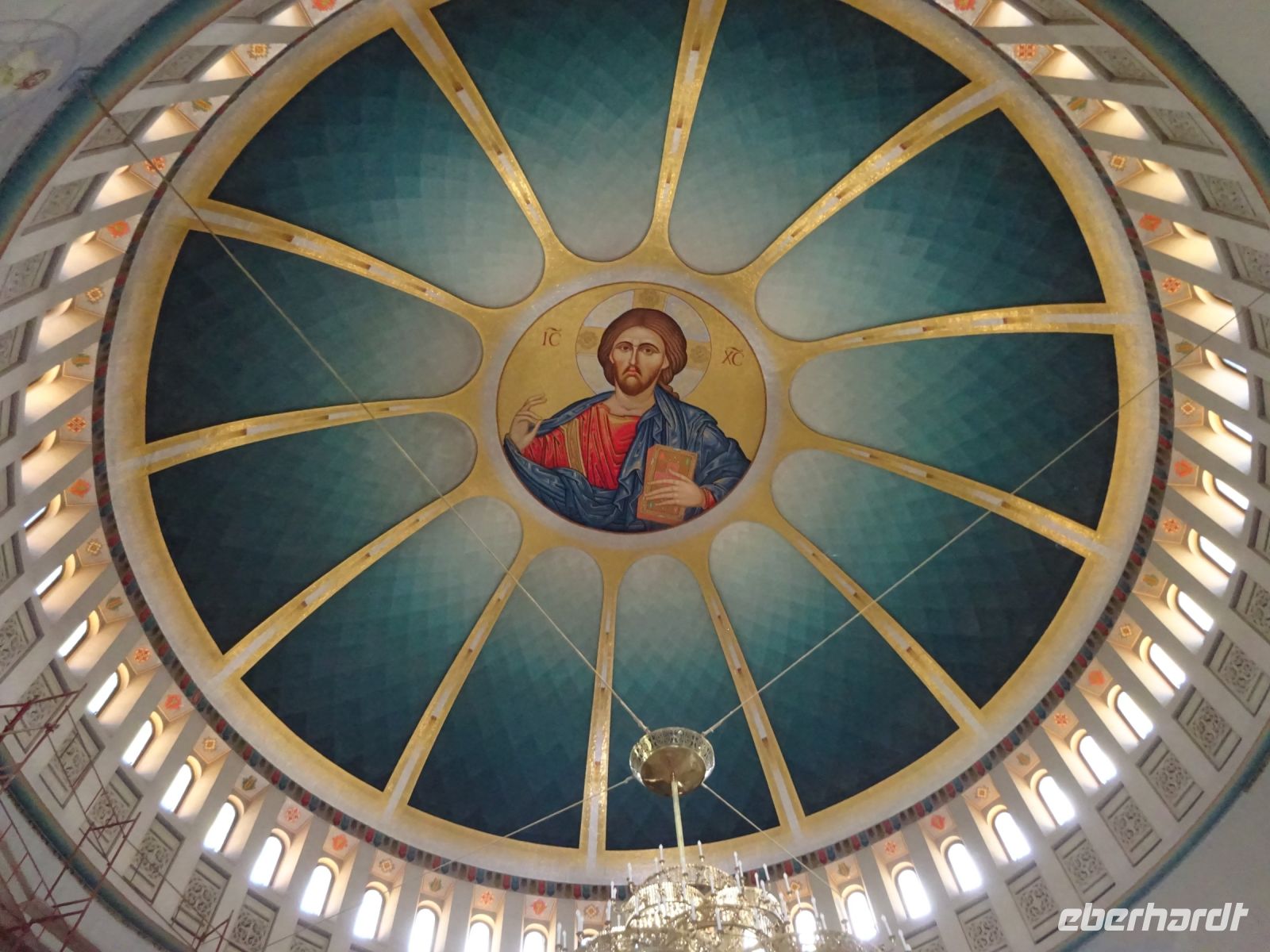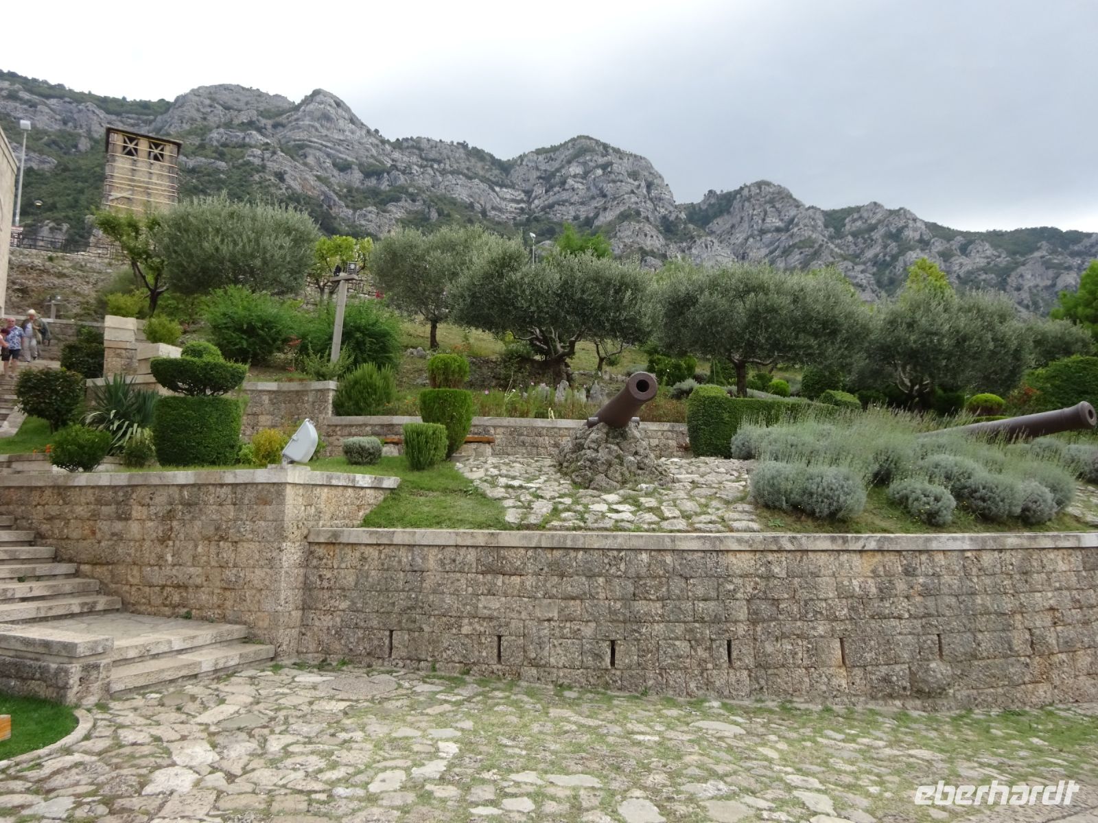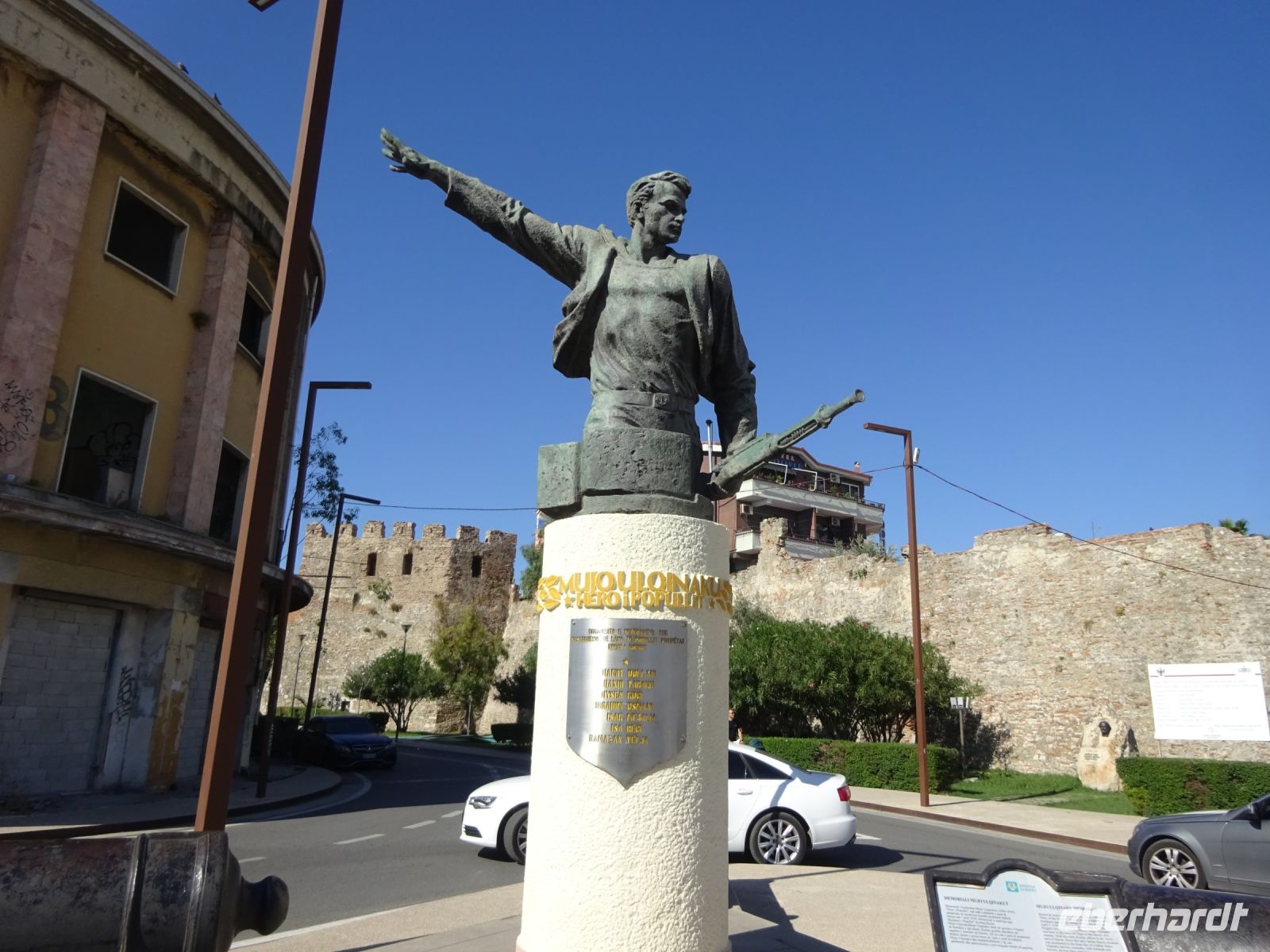 Am Morgen setzten wir zunächst unseren Rundgang durch Tirana fort. Andi zeigte uns einen Bunker, einen ehemaligen Atombunker, einen von mehr als 500.000, die Enver Hoxha errichten ließ. Diese Bunker waren übers ganze Land verteilt, vor allem aber in der Nähe von Außengrenzen Albaniens vorhanden. Wir gingen weiter entlang des Boulevards, sahen verschiedene Regierungsgebäude, moderne Bauten, auch die inzwischen umgebaute Pyramide, schließlich noch das Hauptgebäude der Universität. Heute steht der Besuch zweier weiterer Orte auf unserem Programm: Kruja und Shkodra. In Kruja besuchen wir das Skanderbeg-Museum, das dem albanischen Nationalhelden Skanderbeg gewidmet ist. Andi führt uns durch die Sammlungen und erklärt anhand der zahlreichen Exponate und Schautafeln die Geschichte Albaniens. Wir wissen zunächst wenig über dieses Land, hören aufmerksam zu, fragen immer wieder, wollen es wissen. Schon auf dem Weg zum Museum lockte uns der bunte Basar mit seinen schönen Ständen. Der war nun endlich nach dem Museum an der Reihe. Gemütlich schlenderten wir an den schönen Auslagen vorbei, wo sich schnell auch das eine oder andere Souvenir fand. Und Byrek konnte man hier essen. Das ist Blätterteig mit ganz unterschiedlichen Füllungen, landestypisch und sehr schmackhaft, in allen Varianten. Dann fahren wir weiter nach Shkodra, in die fünftgrößte Stadt Albaniens. Auf einem Spaziergang lernen wir die schön restaurierten Straßenzüge Shkodras kennen, machen eine Mittagspause in einem der zahlreichen Cafés und besuchen noch die beeindruckende katholische Kathedrale. Zwischendurch mussten wir uns unterstellen, denn es gab ein ordentliches Gewitter. Bei diesem Wetter sind die Steine hinauf auf die Festung Rozafa ausgesprochen rutschig, d.h. man geht besser nicht hinauf. Von der Legende, die sich um den Bau dieser Festung rankt, erzählte uns Andi, auch vom Relief der Rozafa mit ihrem kleinen Sohn am Eingang zur Festung.