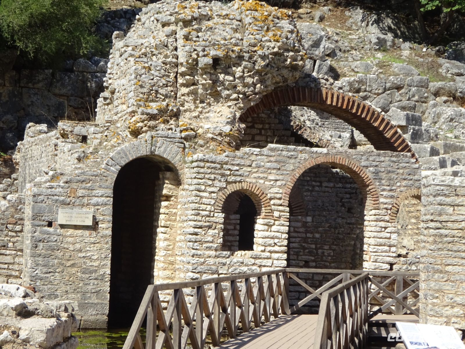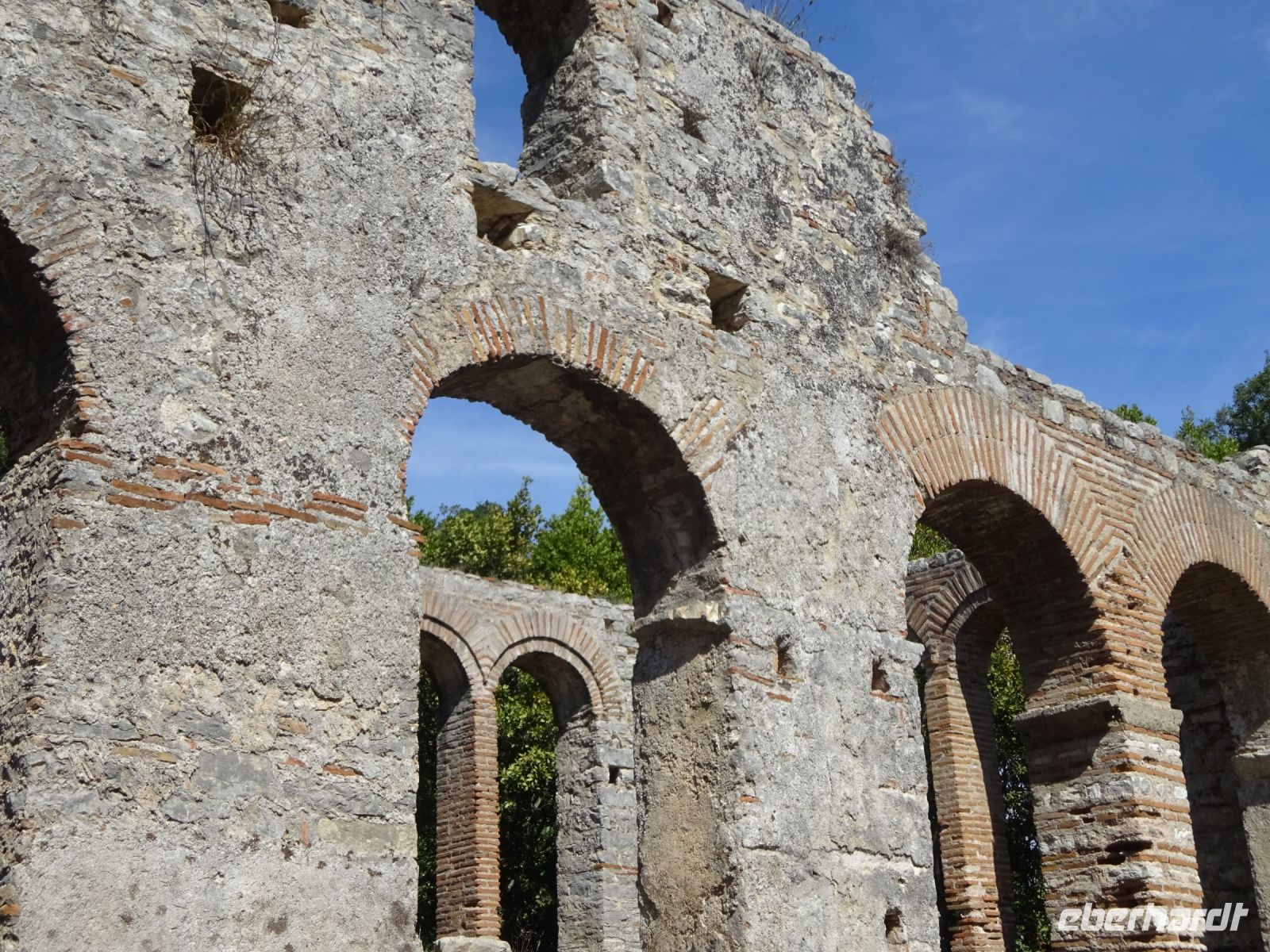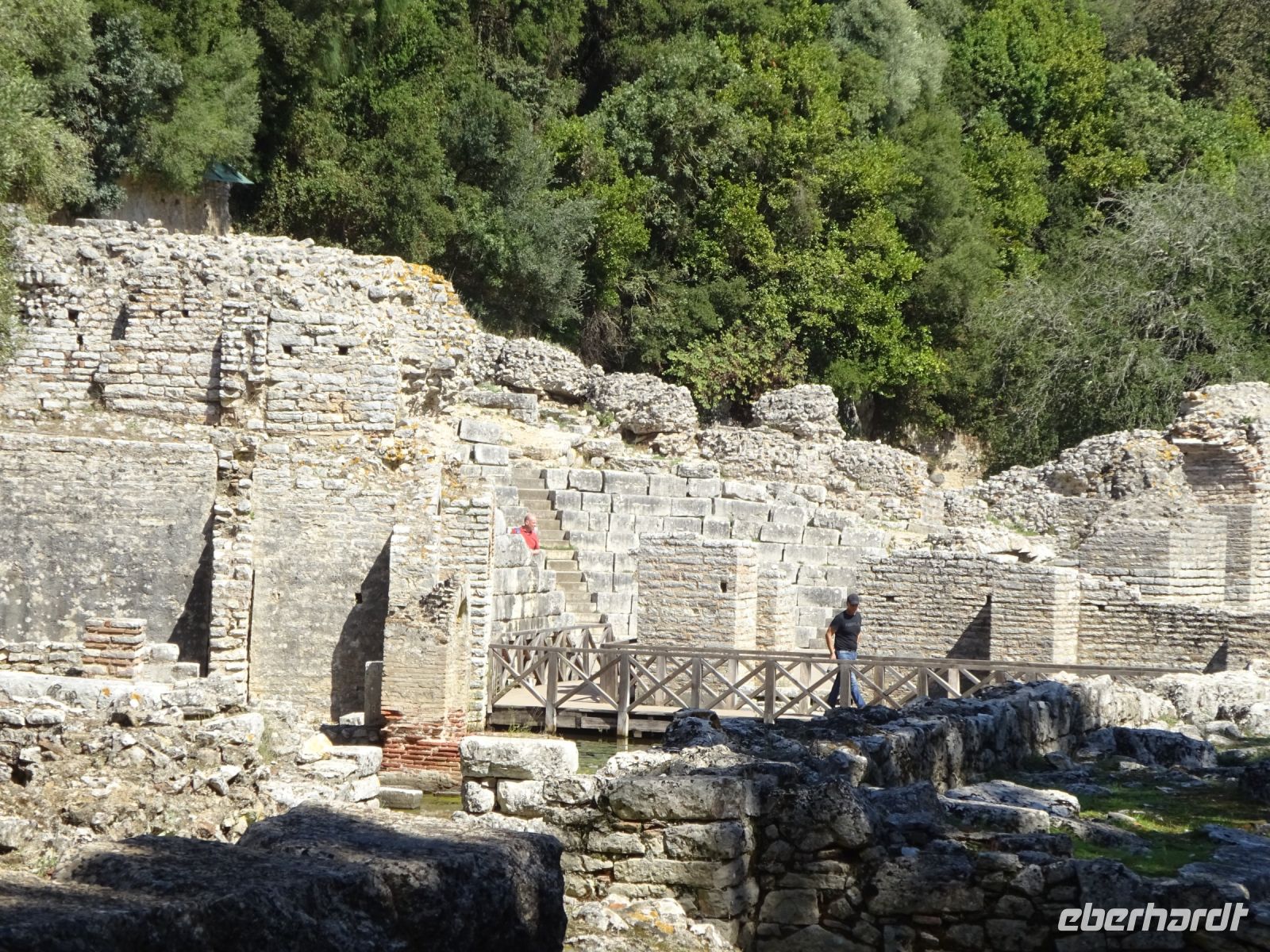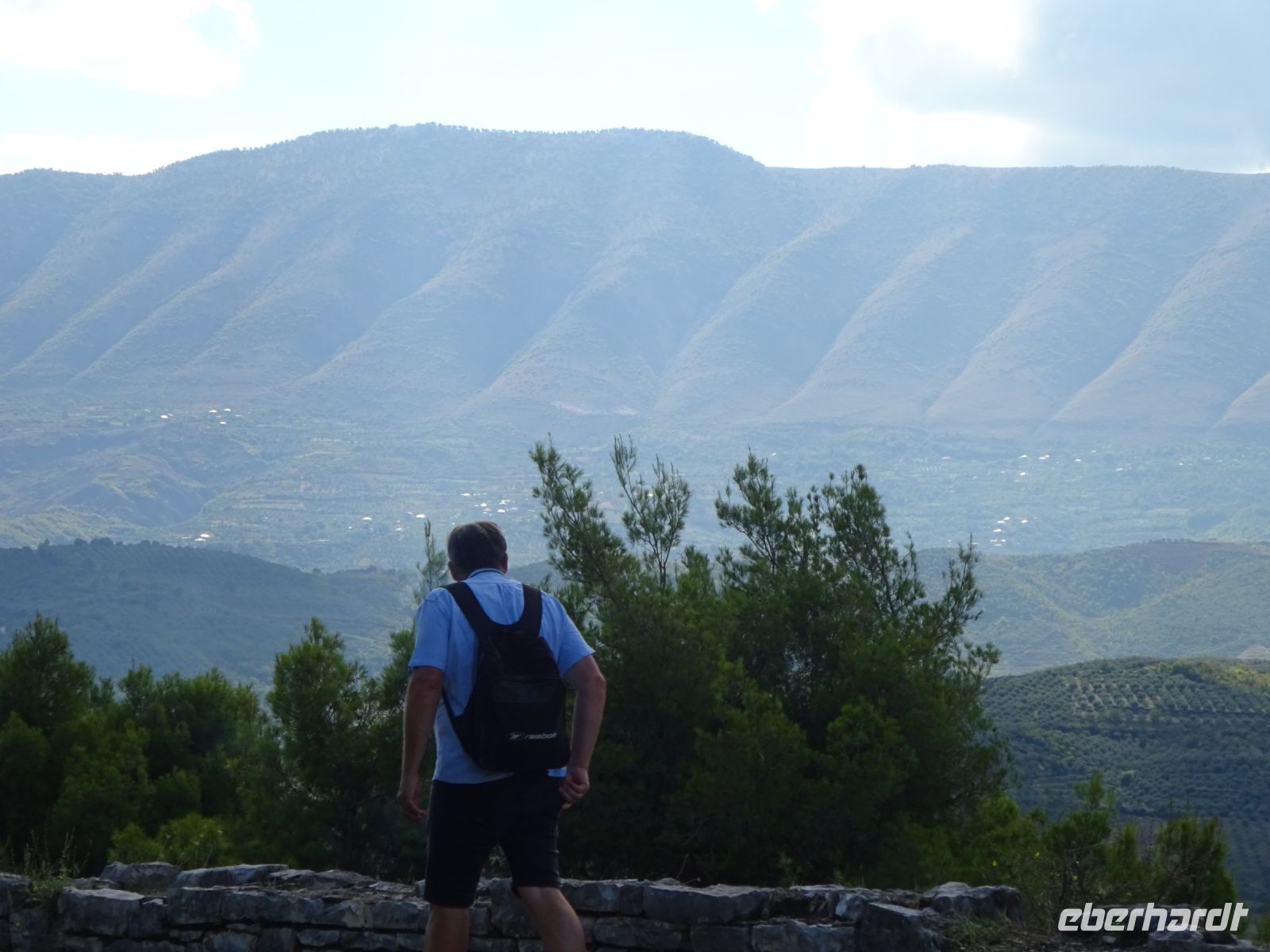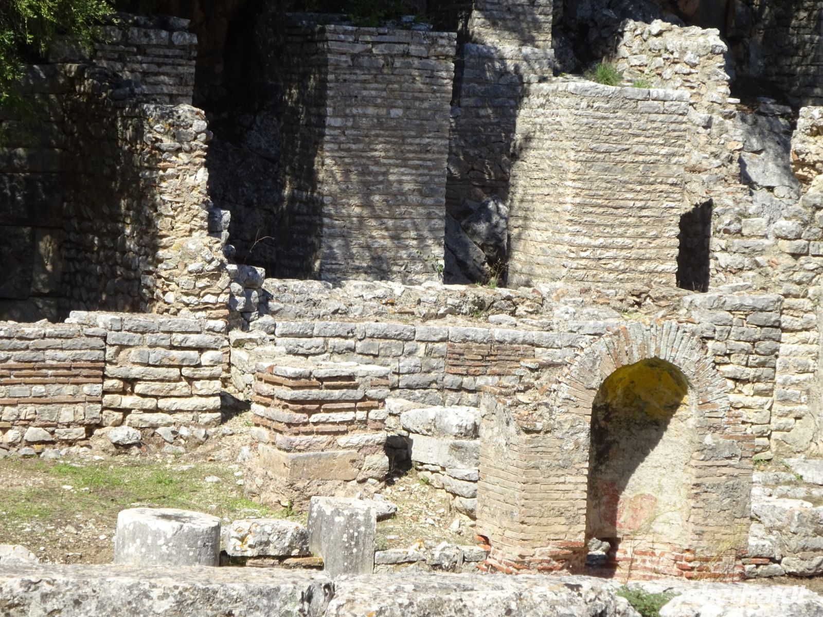 Erster Programmpunkt ist heute das Blue Eye, eine beeindruckende blaue Quelle. Das Wasser sprudelt hier unterirdisch hervor, und bisher weiß niemand genau, wo die Quelle eigentlich ihren Ursprung hat. Gern verweilen wir ein wenig in diesem schönen Naturpark. Die Sonne lacht, was will man mehr. Aber noch weitere Entdeckungen warten auf uns. Ganz in der Nähe von Saranda in etwas südliche Richtung befindet sich der Nationalpark von Butrint, der anschließend auf unserem Programm steht. Es handelt sich dabei um eine der wichtigsten Sehenswürdigkeiten Albaniens überhaupt, die nicht umsonst auf der Liste des UNESCO-Weltkulturerbes steht. Andi führt uns in Butrint durch die Ausgrabungsstätten. Wir kommen aus dem Staunen nicht heraus. Wir sehen u.a. die Fragmente des Amphitheaters und die venezianische Festung, Wasserleitungssysteme und Quellen, Reste einer Kirche, die frühere Stadtbefestigung, Teile der Stadttore usw., usw. Dann fahren wir weiter in Richtung Saranda, wo wir oberhalb des Ortes die malerisch gelegene Festungsruine Lekuresi sehen.