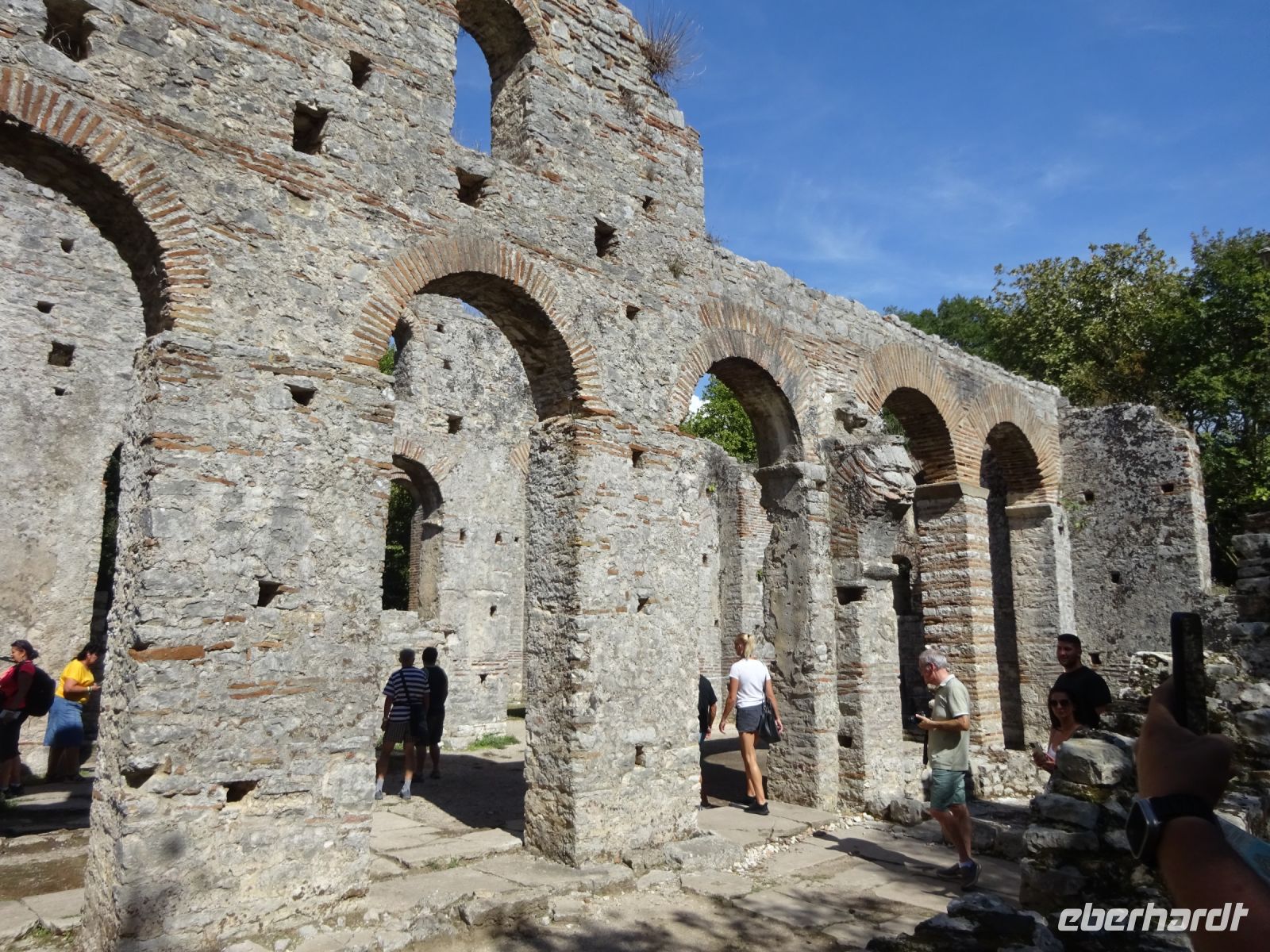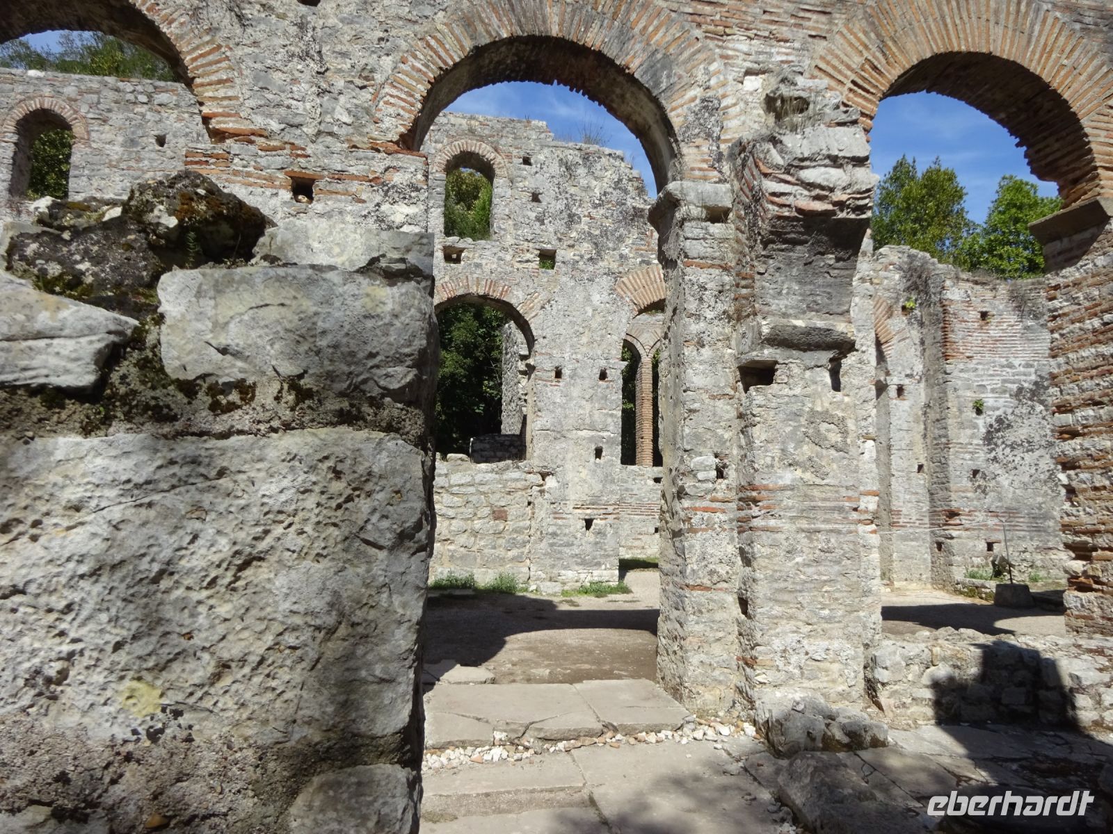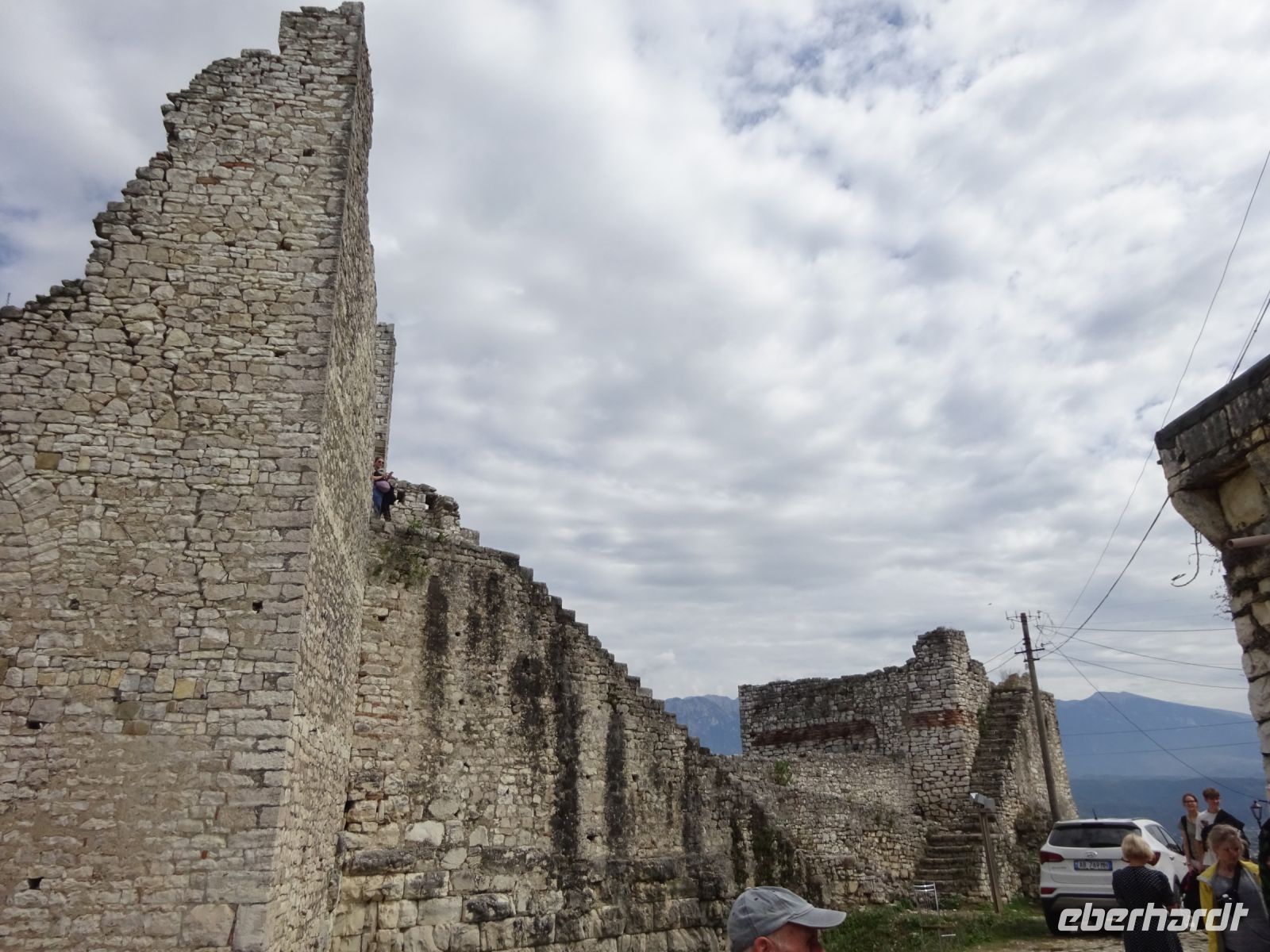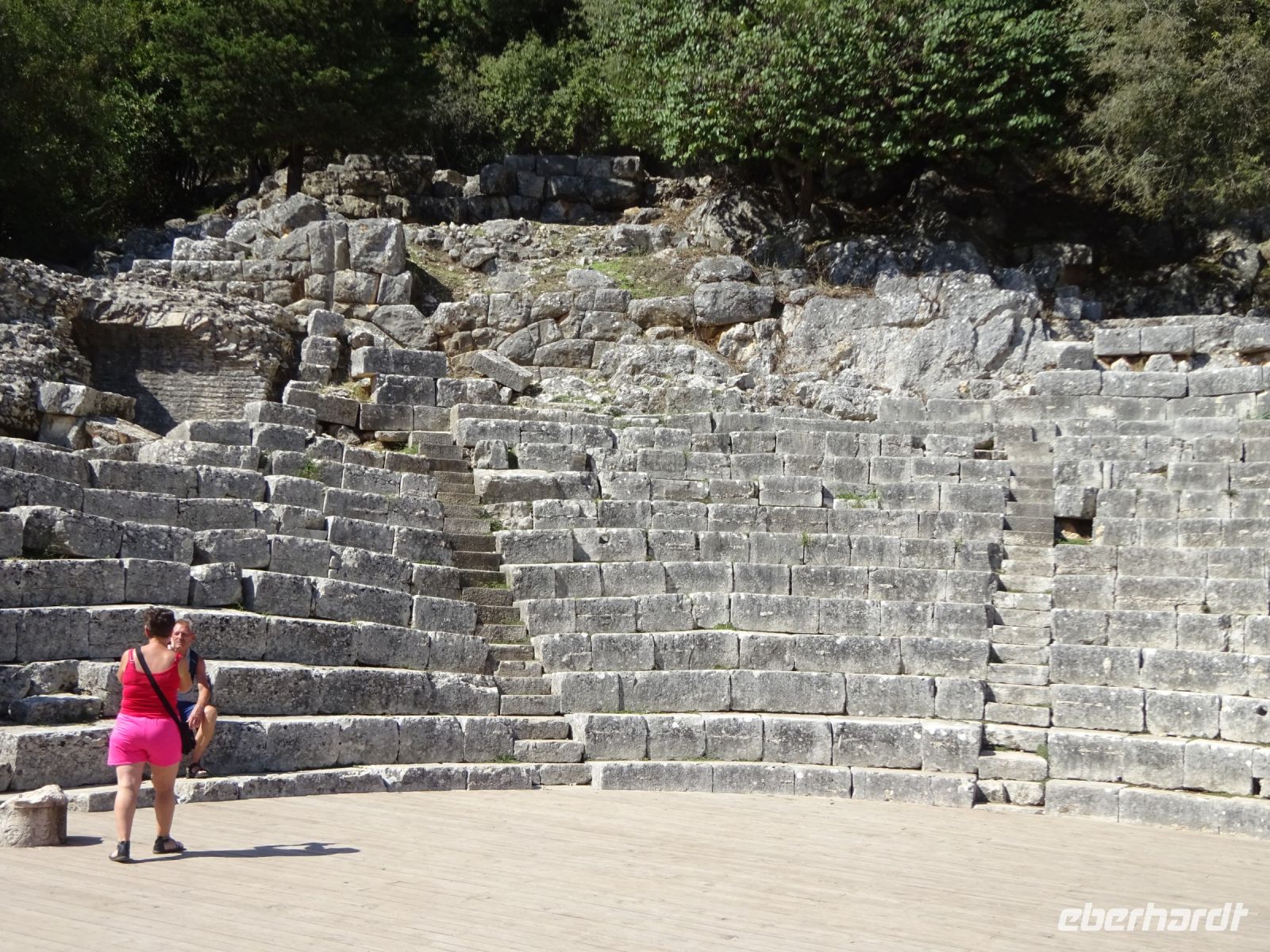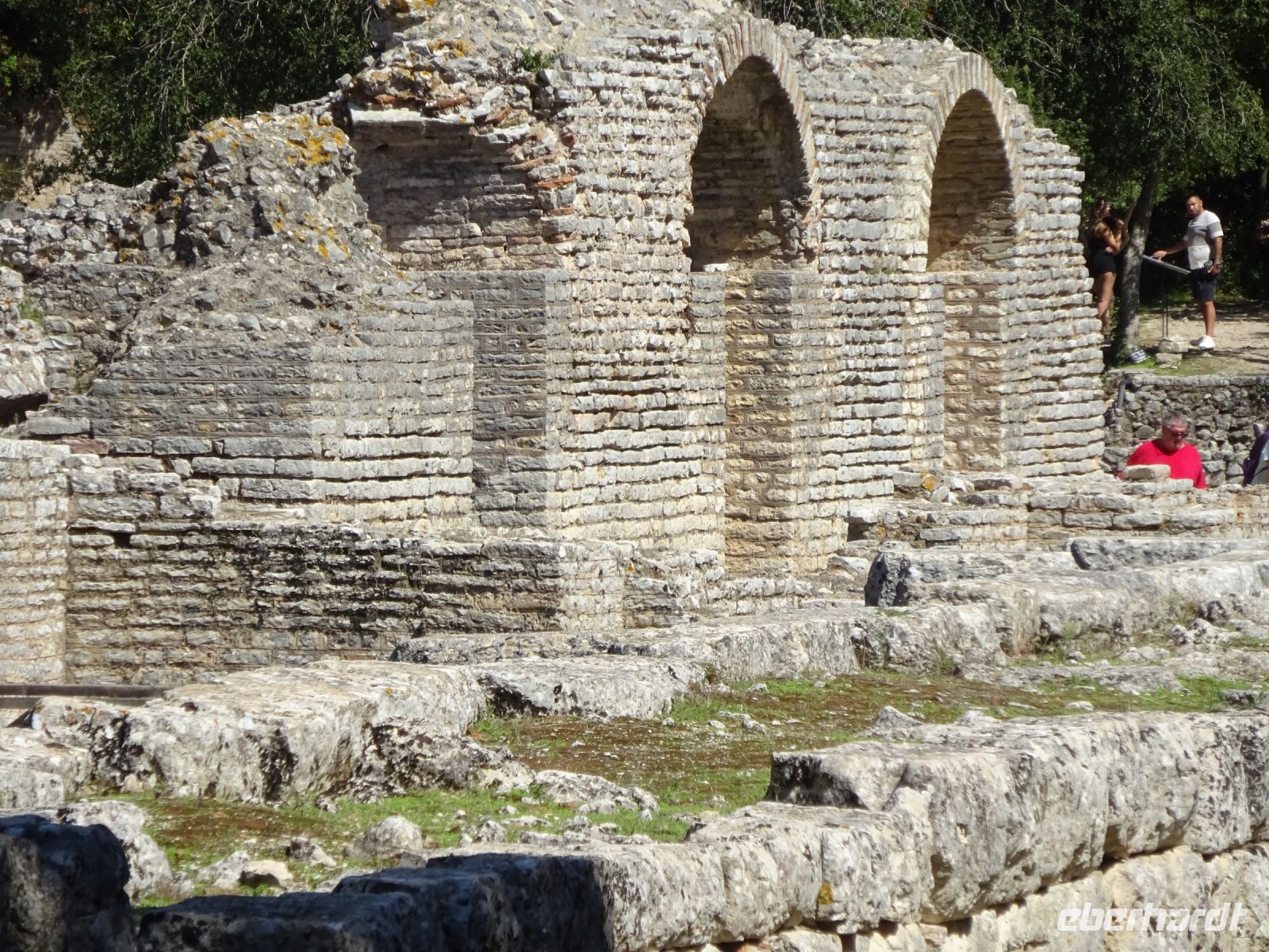 Erster Programmpunkt ist heute das Blue Eye, eine beeindruckende blaue Quelle. Das Wasser sprudelt hier unterirdisch hervor, und bisher weiß niemand genau, wo die Quelle eigentlich ihren Ursprung hat. Gern verweilen wir ein wenig in diesem schönen Naturpark. Die Sonne lacht, was will man mehr. Aber noch weitere Entdeckungen warten auf uns. Ganz in der Nähe von Saranda in etwas südliche Richtung befindet sich der Nationalpark von Butrint, der anschließend auf unserem Programm steht. Es handelt sich dabei um eine der wichtigsten Sehenswürdigkeiten Albaniens überhaupt, die nicht umsonst auf der Liste des UNESCO-Weltkulturerbes steht. Andi führt uns in Butrint durch die Ausgrabungsstätten. Wir kommen aus dem Staunen nicht heraus. Wir sehen u.a. die Fragmente des Amphitheaters und die venezianische Festung, Wasserleitungssysteme und Quellen, Reste einer Kirche, die frühere Stadtbefestigung, Teile der Stadttore usw., usw. Dann fahren wir weiter in Richtung Saranda, wo wir oberhalb des Ortes die malerisch gelegene Festungsruine Lekuresi sehen.