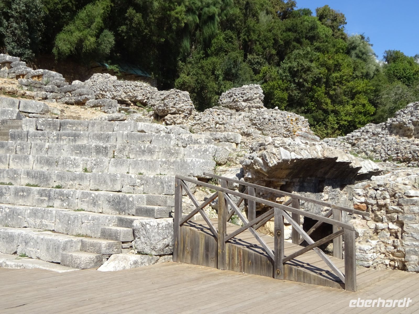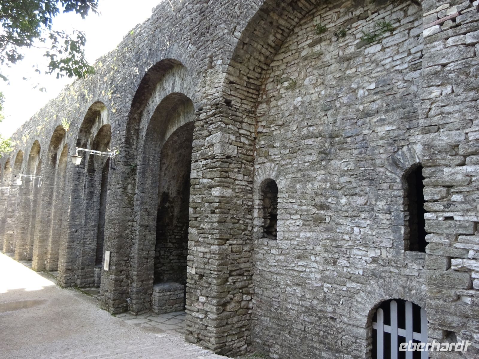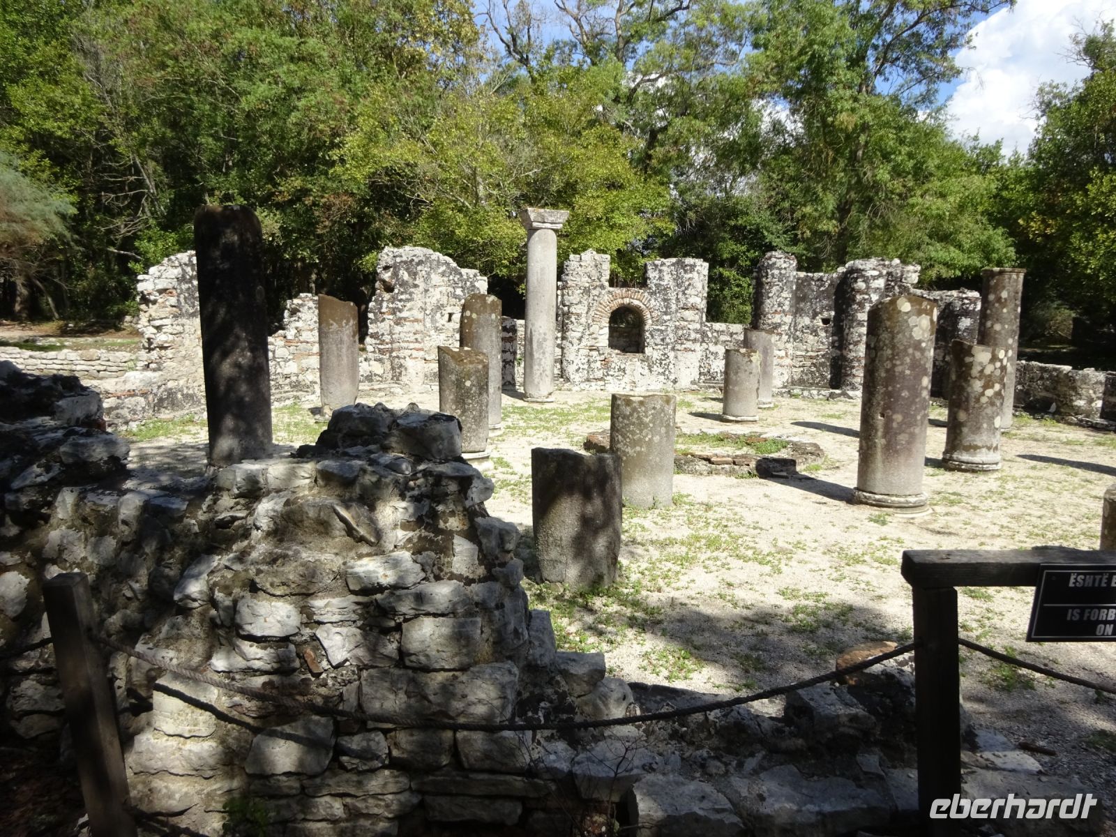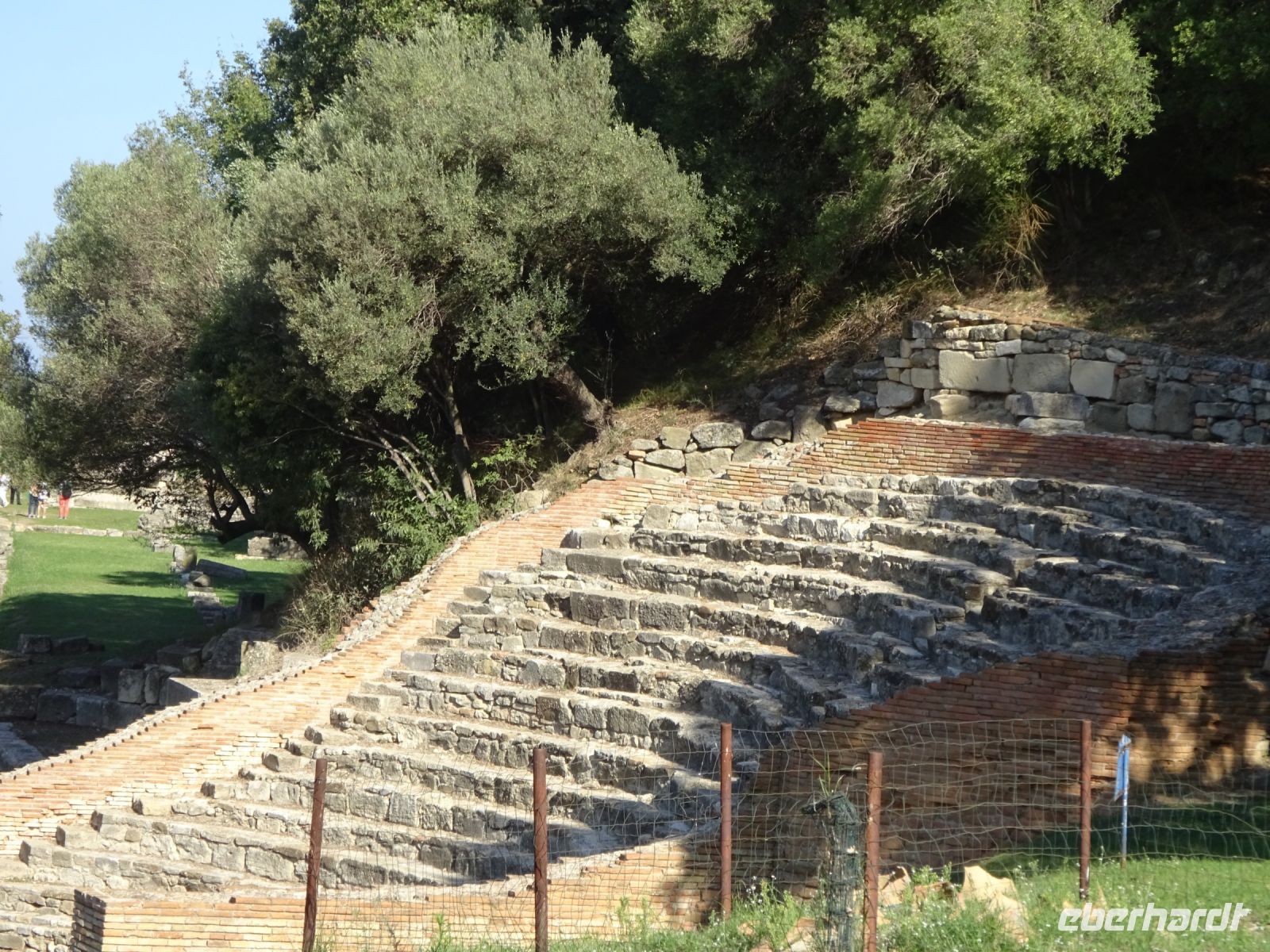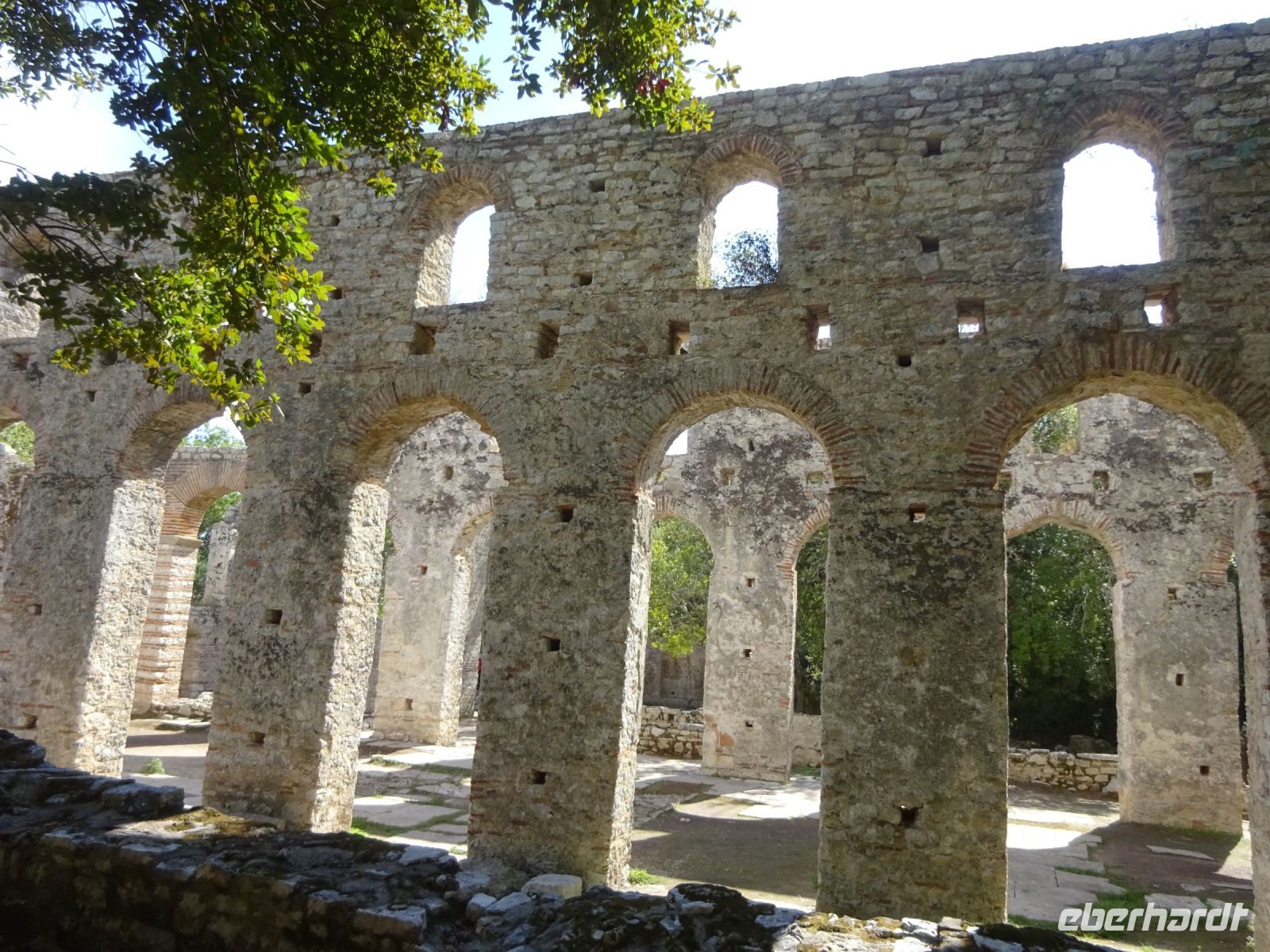 Erster Programmpunkt ist heute das Blue Eye, eine beeindruckende blaue Quelle. Das Wasser sprudelt hier unterirdisch hervor, und bisher weiß niemand genau, wo die Quelle eigentlich ihren Ursprung hat. Gern verweilen wir ein wenig in diesem schönen Naturpark. Die Sonne lacht, was will man mehr. Aber noch weitere Entdeckungen warten auf uns. Ganz in der Nähe von Saranda in etwas südliche Richtung befindet sich der Nationalpark von Butrint, der anschließend auf unserem Programm steht. Es handelt sich dabei um eine der wichtigsten Sehenswürdigkeiten Albaniens überhaupt, die nicht umsonst auf der Liste des UNESCO-Weltkulturerbes steht. Andi führt uns in Butrint durch die Ausgrabungsstätten. Wir kommen aus dem Staunen nicht heraus. Wir sehen u.a. die Fragmente des Amphitheaters und die venezianische Festung, Wasserleitungssysteme und Quellen, Reste einer Kirche, die frühere Stadtbefestigung, Teile der Stadttore usw., usw. Dann fahren wir weiter in Richtung Saranda, wo wir oberhalb des Ortes die malerisch gelegene Festungsruine Lekuresi sehen.