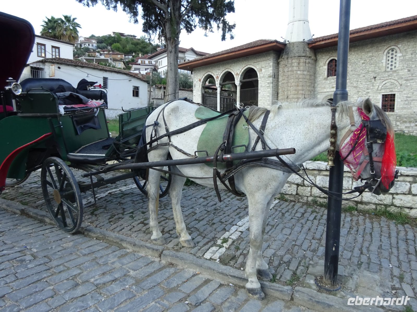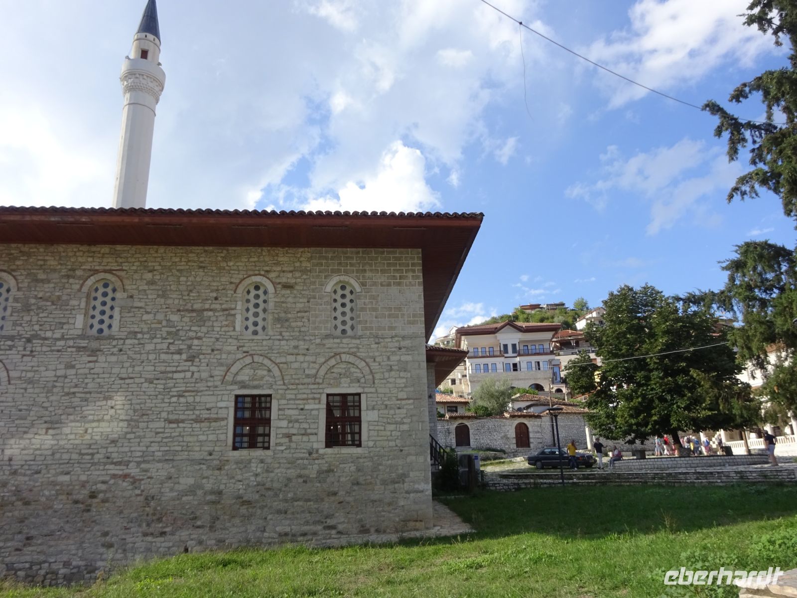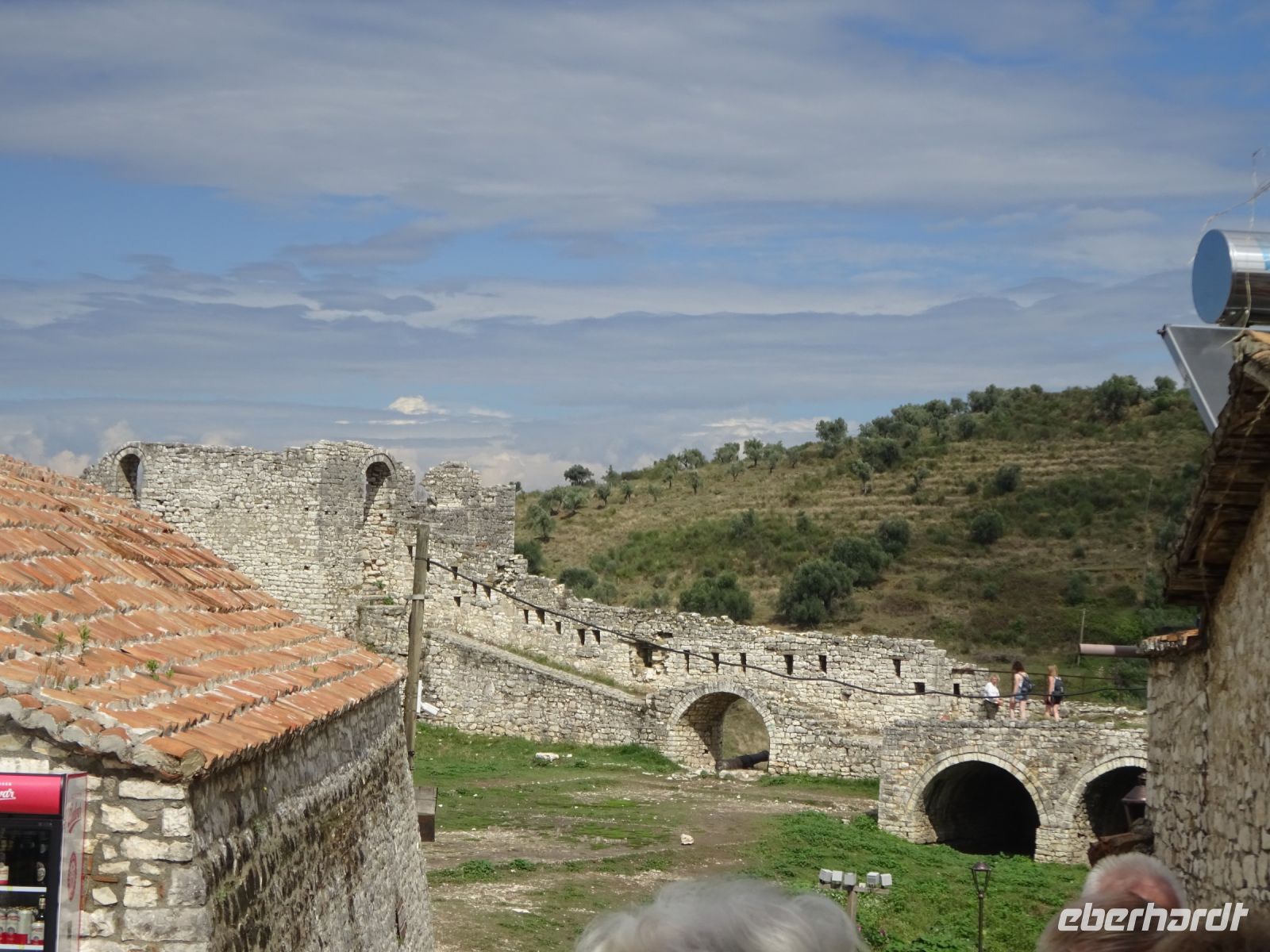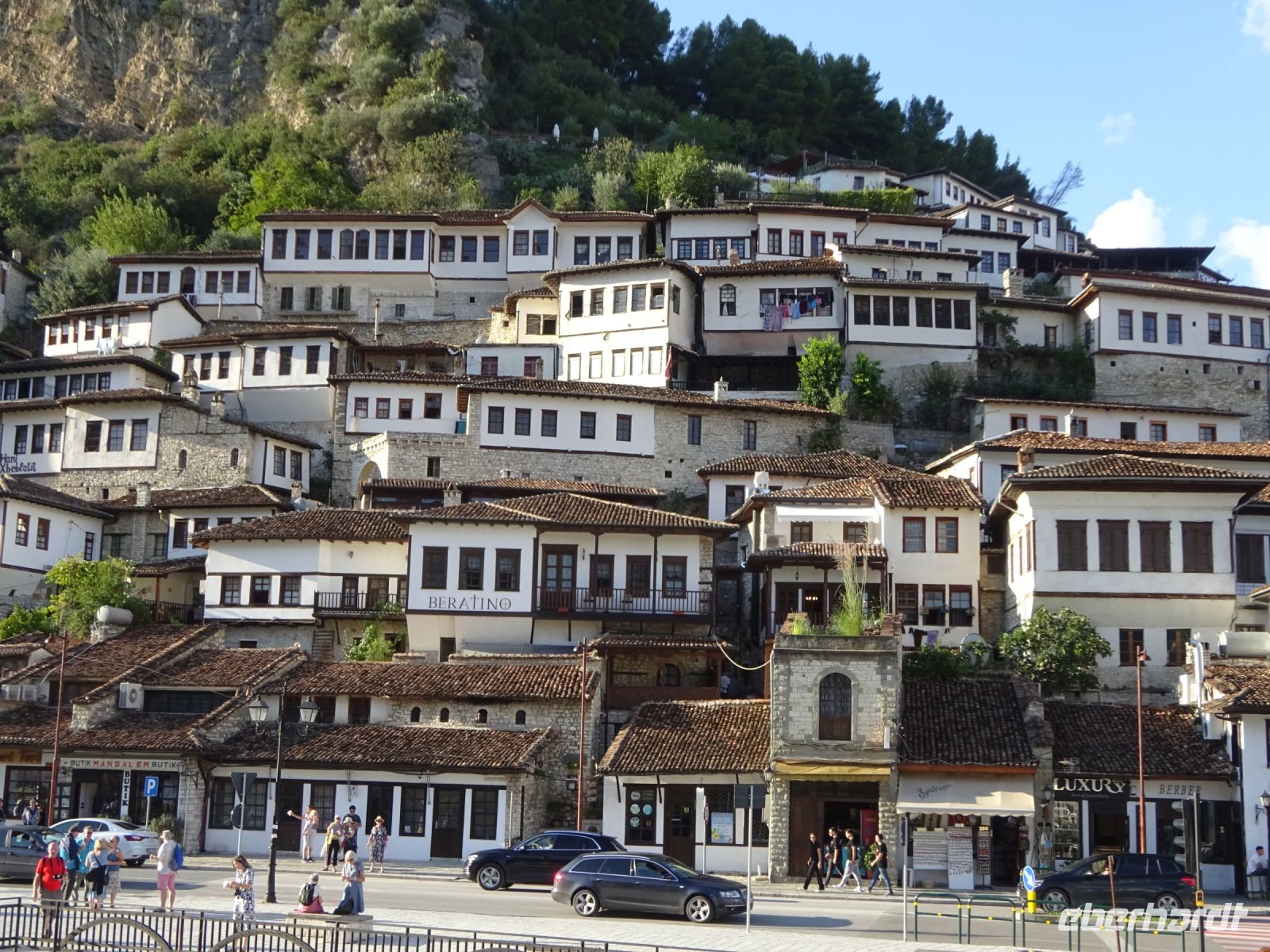 Wir fuhren mit unserem Bus in südliche Richtung hinaus aus Tirana über Elbasan, die viertgrößte Stadt Albaniens. Unser heutiges Tagesziel ist Berat, eine wirklich sehenswerte Stadt. Gelesen und gehört haben wir das schon, nun wollen wir es auch sehen. Weiße Natursteinhäuser mit großen Fenstern prägen das Bild der Altstadt und verliehen ihr einst den Beinamen „Stadt der tausend Fenster“. Über der Stadt erhebt sich eine der größten Festungsanlagen des Balkans, die wir selbstverständlich kennenlernten und auf einem Rundgang besichtigten. Zunächst stärkten wir uns aber, dann gingen wir auf einen Rundgang durch die weitläufige Festung. Dies ist übrigens eigentlich eine Festungsstadt, die auch noch heute bewohnt ist. Davon können wir uns selbst überzeugen. Ganz besonders fasziniert uns die Nikolai-Kirche innerhalb der Festungsstadt. Sie ist an sich schon sehenswert, beherbergt aber dazu ein Ikonen-Museum mit Arbeiten des albanischen Ikonen-Malers Onufri und seines Sohnes Niklas. Nach der Besichtigung der Burganlage fahren wir mit unserem Bus hinunter in die Stadt. Im schönen Hotel Portik mitten im Zentrum wohnen wir, leider nur für eine Nacht. Nach einer kurzen Erfrischungspause nehmen wir uns nun die Stadt genauer vor. Fotomotive ohne Ende warten auf uns: wir sehen die Bleimoschee, auch die berühmten Häuser mit den tausend Fenstern, die der Stadt ihren Beinamen gaben. Beim Abendessen und auch beim Frühstück genießen wir die herrliche Aussicht von der Terrasse unseres Hotels im 5. Stock. Hier könnten wir uns gut einen längeren Aufenthalt vorstellen, aber unsere Karawane zog weiter. So sah es das Programm unserer Rundreise vor. Jeder Tag war spannend, bot neue interessante Sehenswürdigkeiten, zahlreiche Eindrücke in neuen Orten. Unsere Gesprächsthemen waren schier unerschöpflich, unsere Fragen auch. Wir wollten alles wissen über dieses Land und seine Menschen. Deshalb waren wir schließlich gekommen.