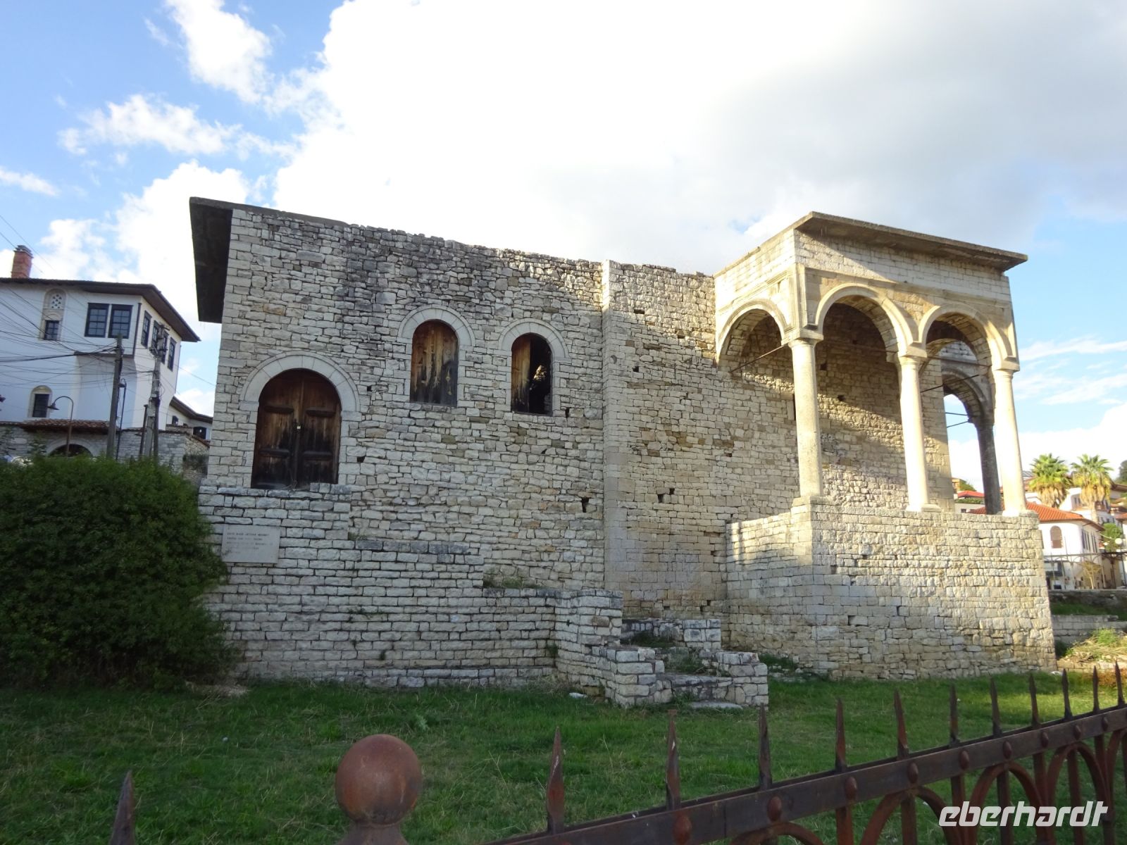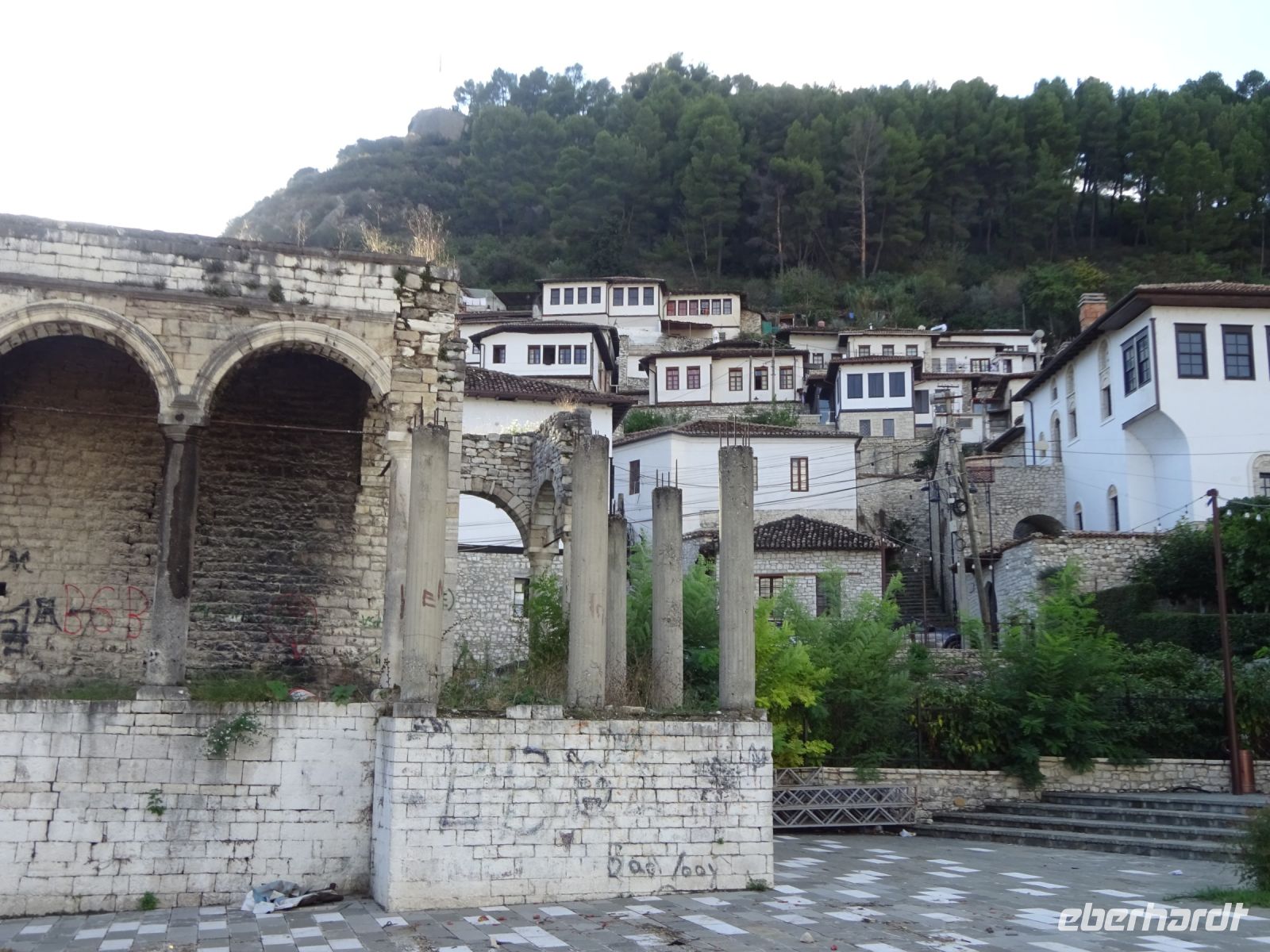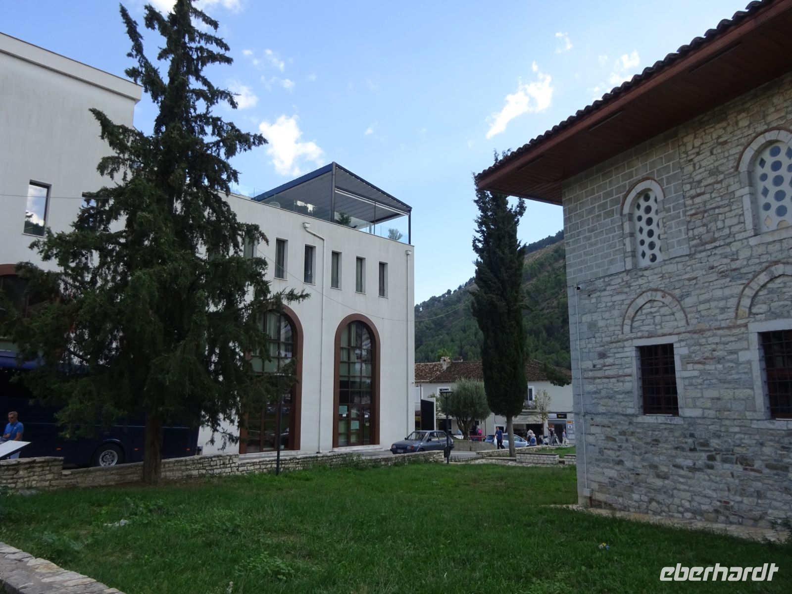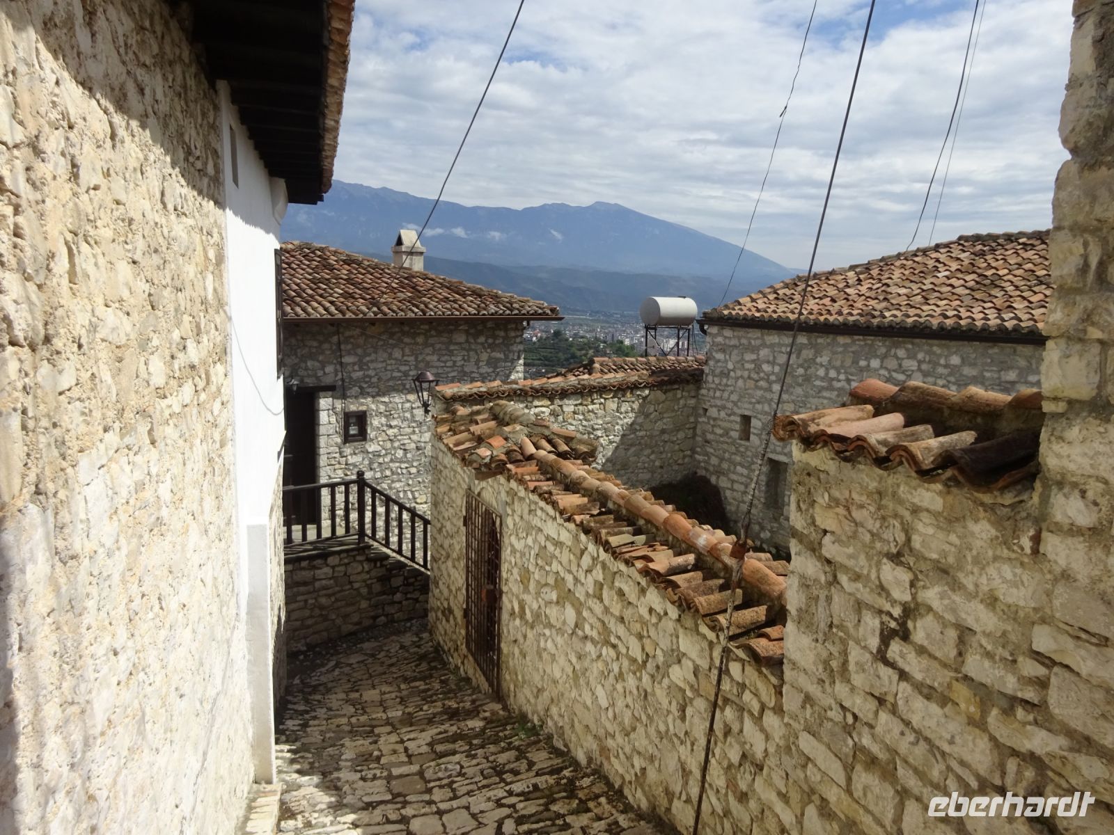 Wir fuhren mit unserem Bus in südliche Richtung hinaus aus Tirana über Elbasan, die viertgrößte Stadt Albaniens. Unser heutiges Tagesziel ist Berat, eine wirklich sehenswerte Stadt. Gelesen und gehört haben wir das schon, nun wollen wir es auch sehen. Weiße Natursteinhäuser mit großen Fenstern prägen das Bild der Altstadt und verliehen ihr einst den Beinamen „Stadt der tausend Fenster“. Über der Stadt erhebt sich eine der größten Festungsanlagen des Balkans, die wir selbstverständlich kennenlernten und auf einem Rundgang besichtigten. Zunächst stärkten wir uns aber, dann gingen wir auf einen Rundgang durch die weitläufige Festung. Dies ist übrigens eigentlich eine Festungsstadt, die auch noch heute bewohnt ist. Davon können wir uns selbst überzeugen. Ganz besonders fasziniert uns die Nikolai-Kirche innerhalb der Festungsstadt. Sie ist an sich schon sehenswert, beherbergt aber dazu ein Ikonen-Museum mit Arbeiten des albanischen Ikonen-Malers Onufri und seines Sohnes Niklas. Nach der Besichtigung der Burganlage fahren wir mit unserem Bus hinunter in die Stadt. Im schönen Hotel Portik mitten im Zentrum wohnen wir, leider nur für eine Nacht. Nach einer kurzen Erfrischungspause nehmen wir uns nun die Stadt genauer vor. Fotomotive ohne Ende warten auf uns: wir sehen die Bleimoschee, auch die berühmten Häuser mit den tausend Fenstern, die der Stadt ihren Beinamen gaben. Beim Abendessen und auch beim Frühstück genießen wir die herrliche Aussicht von der Terrasse unseres Hotels im 5. Stock. Hier könnten wir uns gut einen längeren Aufenthalt vorstellen, aber unsere Karawane zog weiter. So sah es das Programm unserer Rundreise vor. Jeder Tag war spannend, bot neue interessante Sehenswürdigkeiten, zahlreiche Eindrücke in neuen Orten. Unsere Gesprächsthemen waren schier unerschöpflich, unsere Fragen auch. Wir wollten alles wissen über dieses Land und seine Menschen. Deshalb waren wir schließlich gekommen.