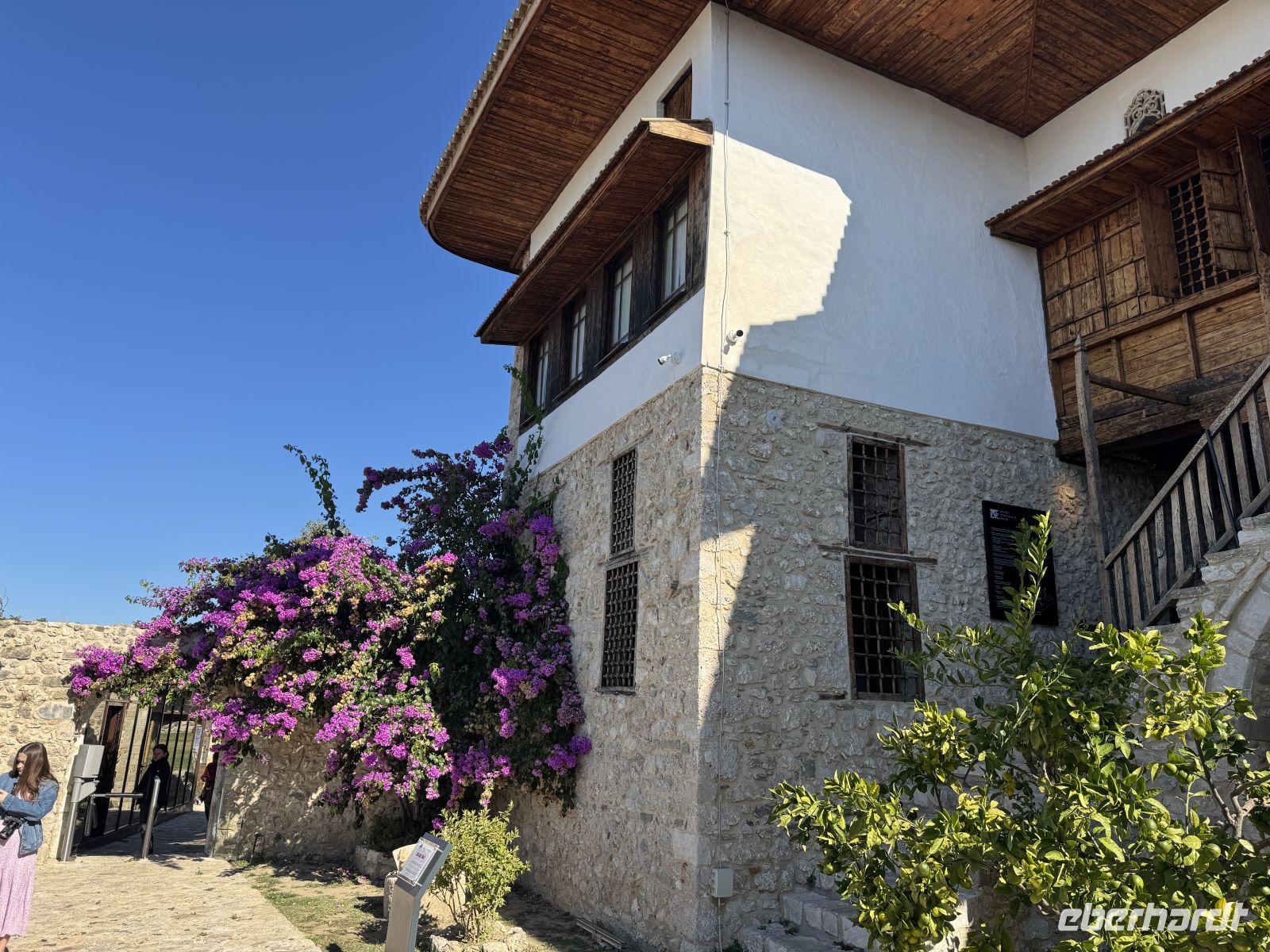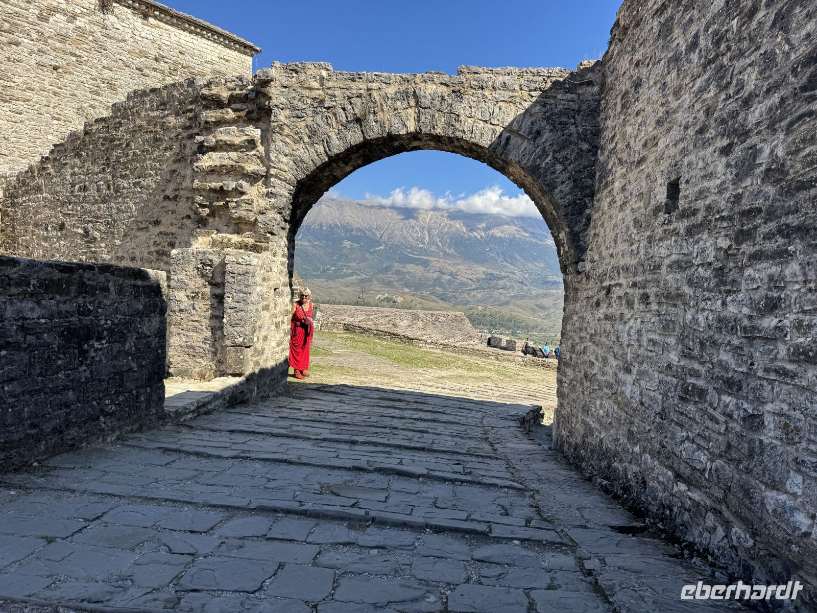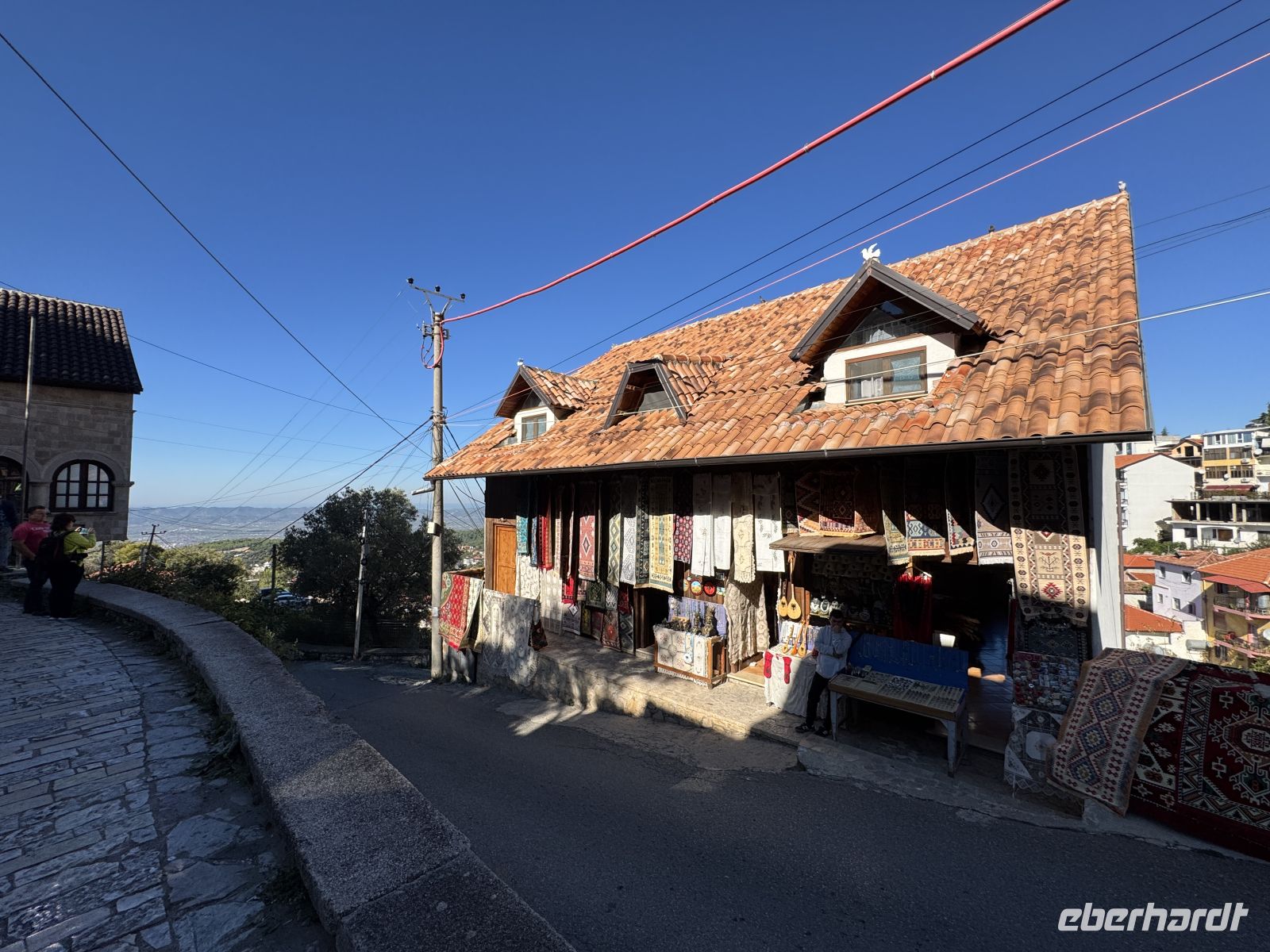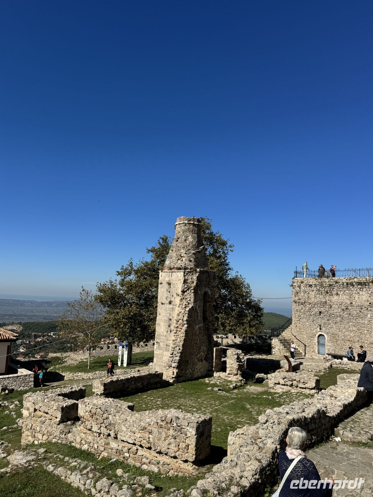 Wir begeben uns auf einem steilen Pflasterweg hinauf zur Burg, wo wir das Waffenmuseum besichtigen und von Neli viel Wissenswertes über die Geschichte der Festung und der Region erfahren. Wir besuchen das Skenduli-Haus, welches liebevoll restauriert wurde und heute als Museum für Geschichte fungiert.