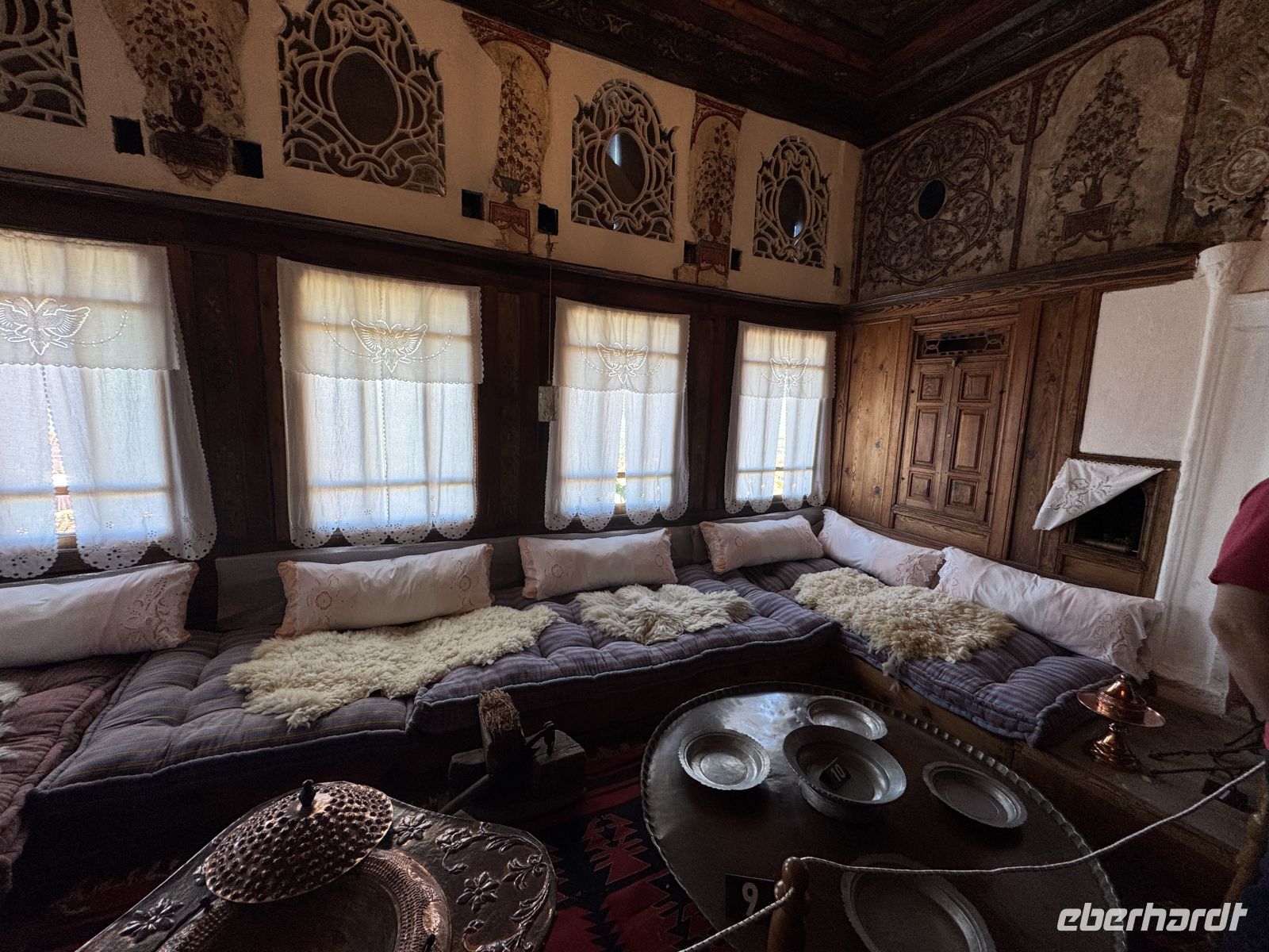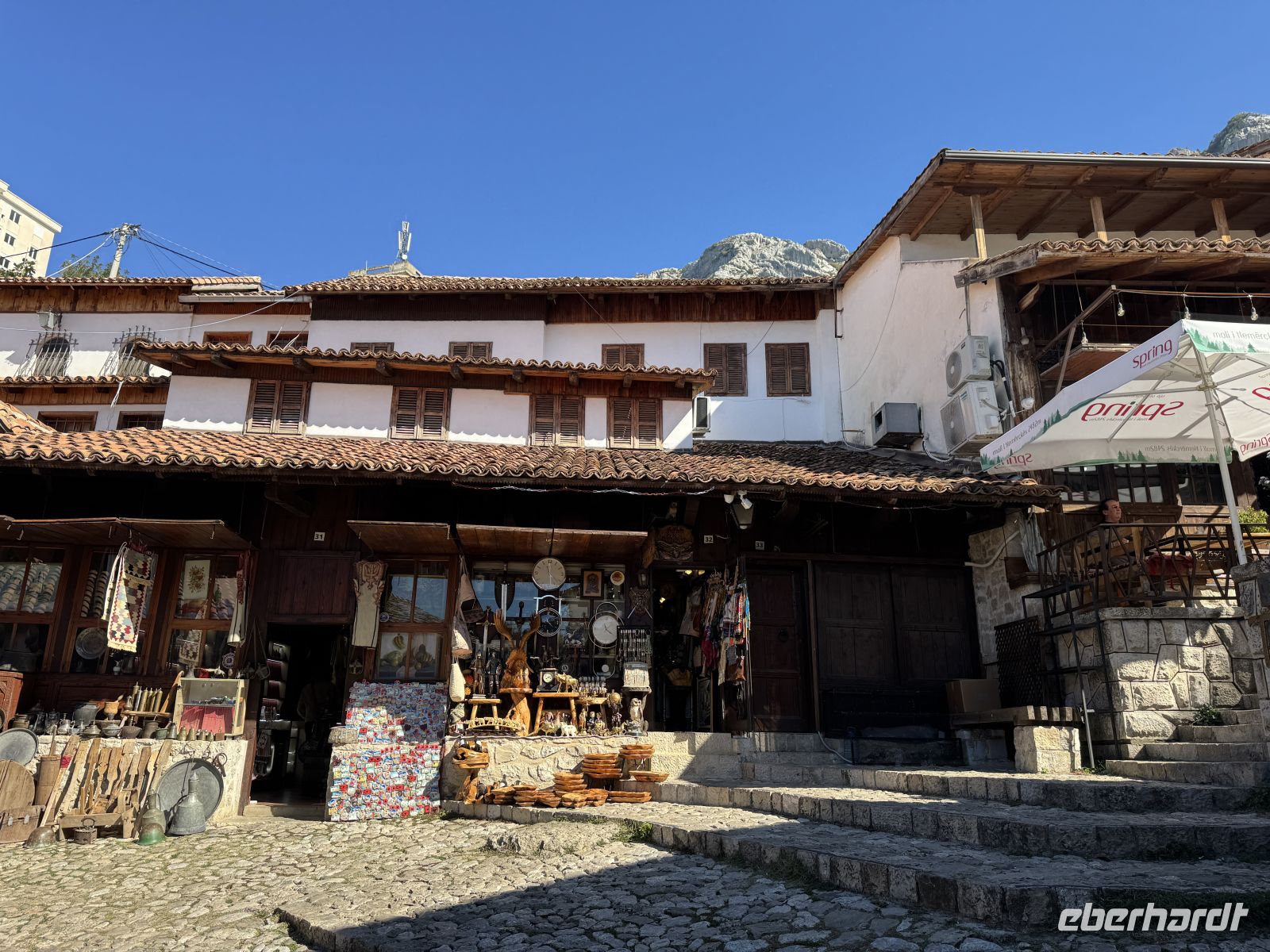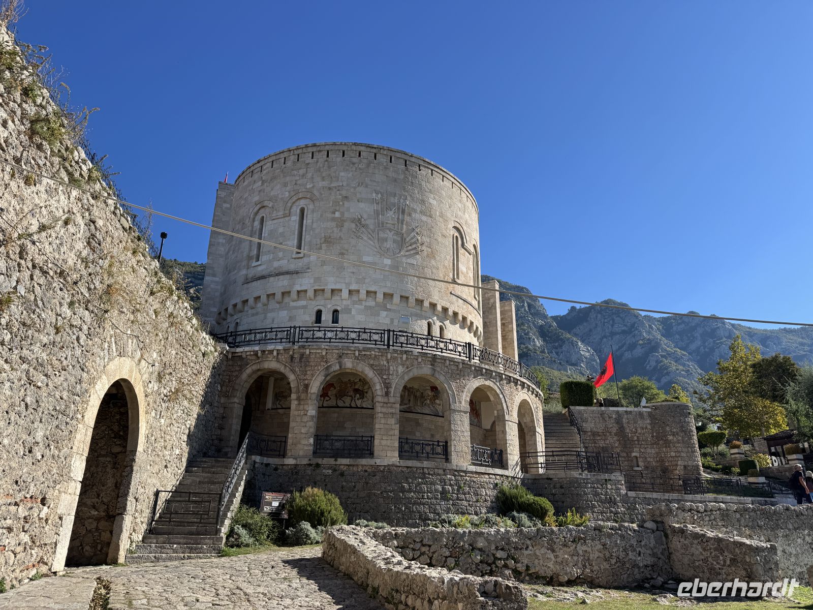 Wir begeben uns auf einem steilen Pflasterweg hinauf zur Burg, wo wir das Waffenmuseum besichtigen und von Neli viel Wissenswertes über die Geschichte der Festung und der Region erfahren. Wir besuchen das Skenduli-Haus, welches liebevoll restauriert wurde und heute als Museum für Geschichte fungiert.