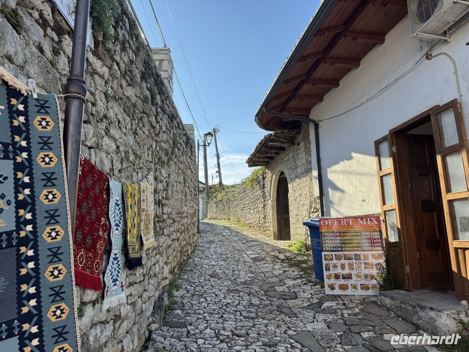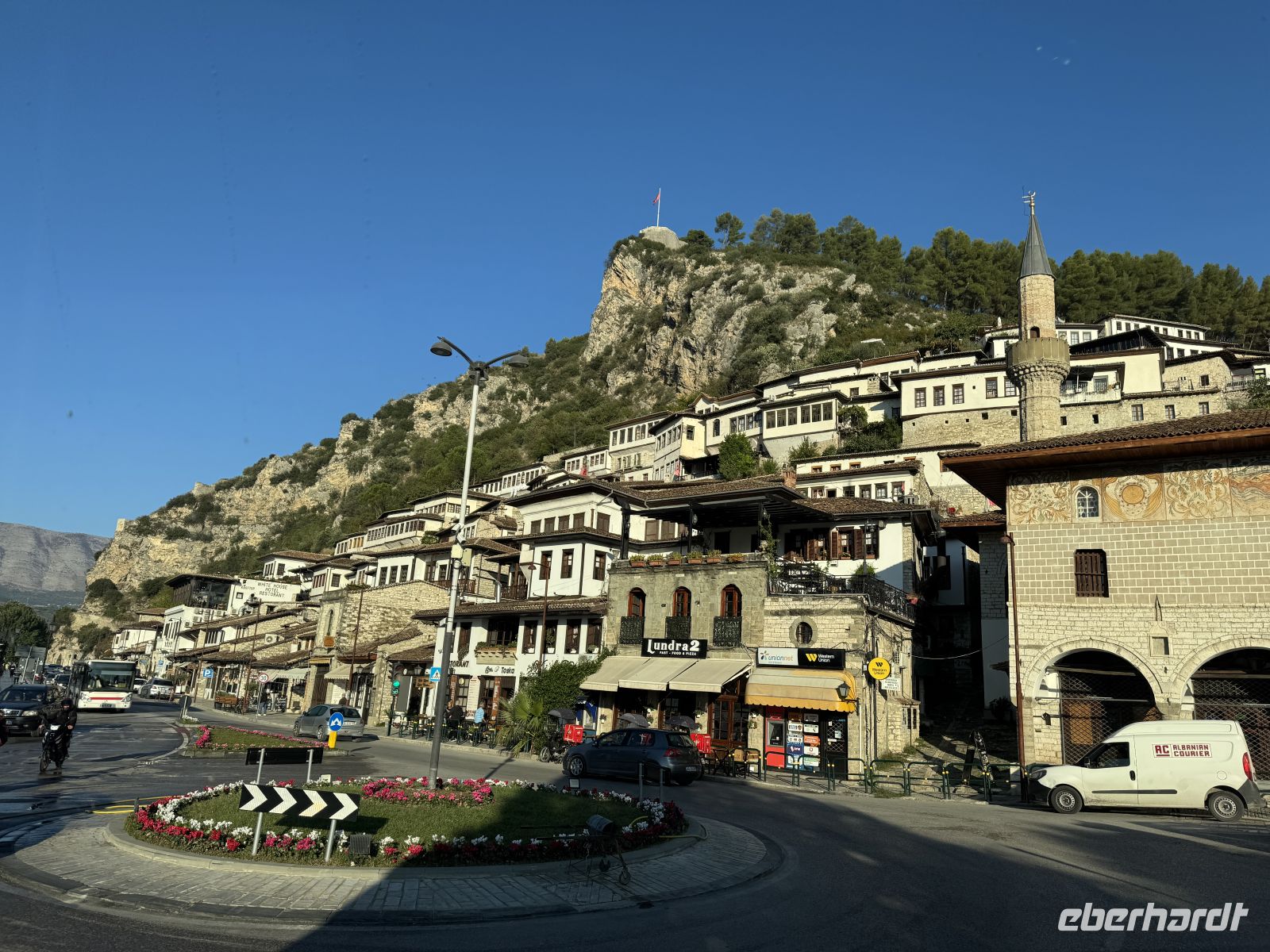 Angekommen in Berat begeben wir uns als erstes auf die Festung auf dem felsigen Hügel von 187 m ü. A. erbaut, wo der Fluss Osum durch einen Engpass im Tal in die mittelalbanische Ebene Myzeqe vorstößt. Die heutige Anlage, die auf römische und byzantinische Vorgängerbauten zurückgeht, wurde in ihrer heutigen Gestalt im Wesentlichen im 13. Jahrhundert errichtet. Da die Grundfläche der Festungsanlage ungewöhnlich groß ist, fanden im Mittelalter nicht nur alle Einwohner Berats darin Platz, sondern neben den Wohnhäusern auch insgesamt 20 Kirchen und eine Moschee. Von den meisten dieser Gotteshäuser sind nur Ruinen erhalten geblieben, aber das Burggelände selbst wird bis heute für Wohnzwecke genutzt. Unter dem Namen Kalaja bildet die Festung sogar einen eigenen Stadtteil. Von dem südlichen Ende der Burg, das sich direkt über einer Talenge befindet, bietet sich ein atemberaubender Ausblick über die ganze Stadt und die steilen Felsenhänge. Am gegenüberliegenden Ufer liegt der historische Stadtteil Gorica. Unterhalb der Burg dehnen sich der Stadtteil Mangalem sowie das heutige Stadtzentrum aus. Im Norden vor der Stadt entstanden zur kommunistischen Zeit neue Quartiere mit zahlreichen Plattenbauten. All das können wir bei einem atemberaubenden Blick von der auf der Festung befindlichen Aussichtplattform sehen.