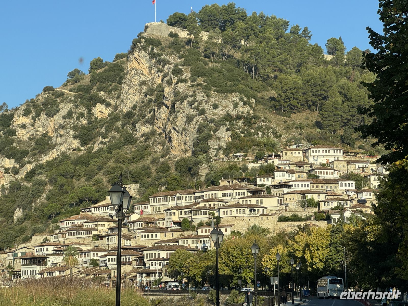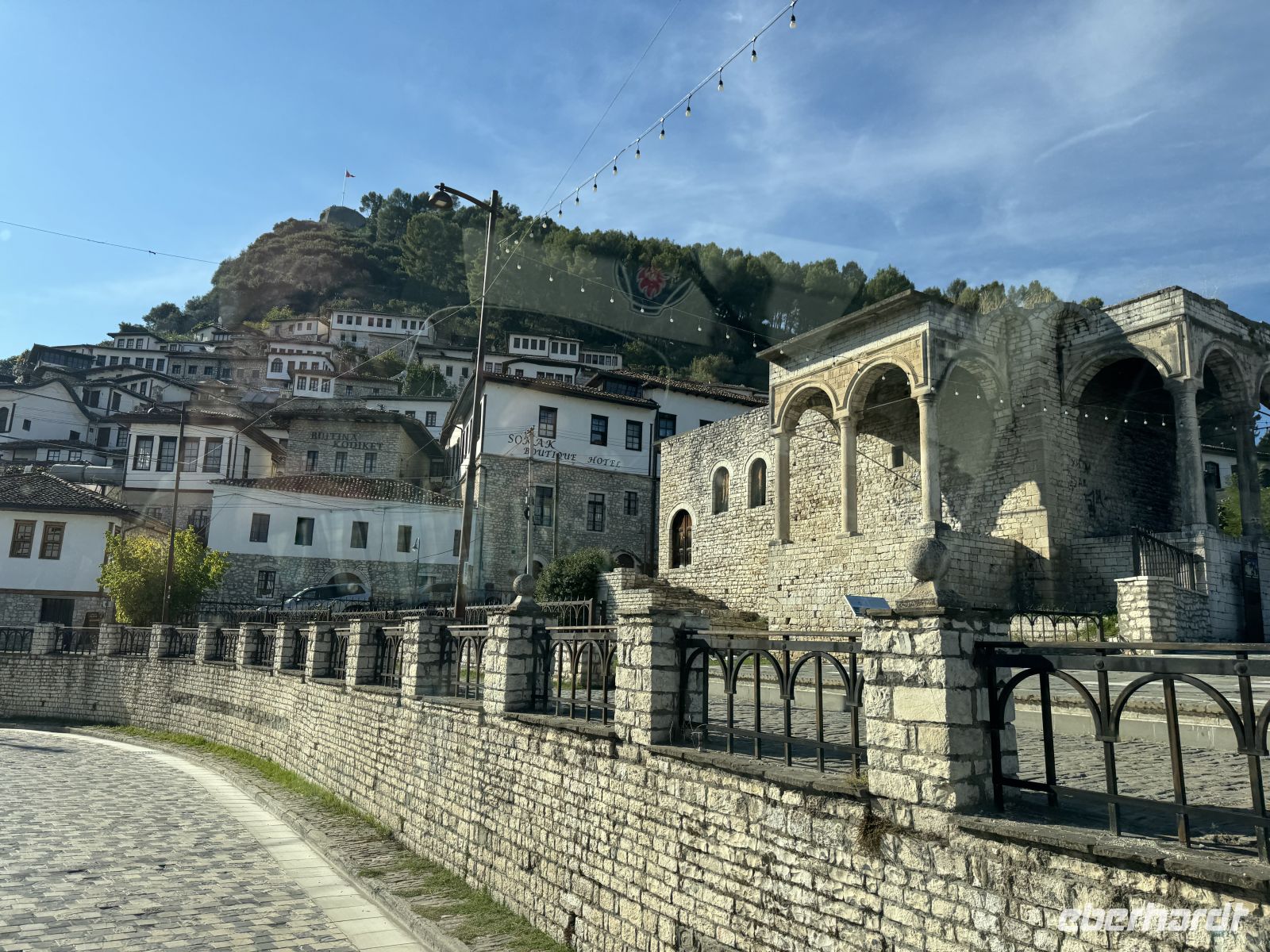 Nach einem ausgiebigen Frühstück im Hotel fahren wir los in Richtung Berat, der Stadt der 1000 Fenster am Fluss Osum. Die Stadt der tausend Fenster, die 1961 offiziell zur Museumsstadt ernannt und 2008 UNESCO-Welterbe wurde, steht unter besonderem Schutz: In drei Stadtteilen mit den typischen historischen weißen Häusern sind Neubauten verboten. Insbesondere dank dieser drei kompakten Altstadt-Quartiere Mangalem, Gorica und Kalaja (deutsch: Burg) und der vielen Moscheen und Kirchen gilt Berat als eine der wichtigsten Sehenswürdigkeiten des Landes.