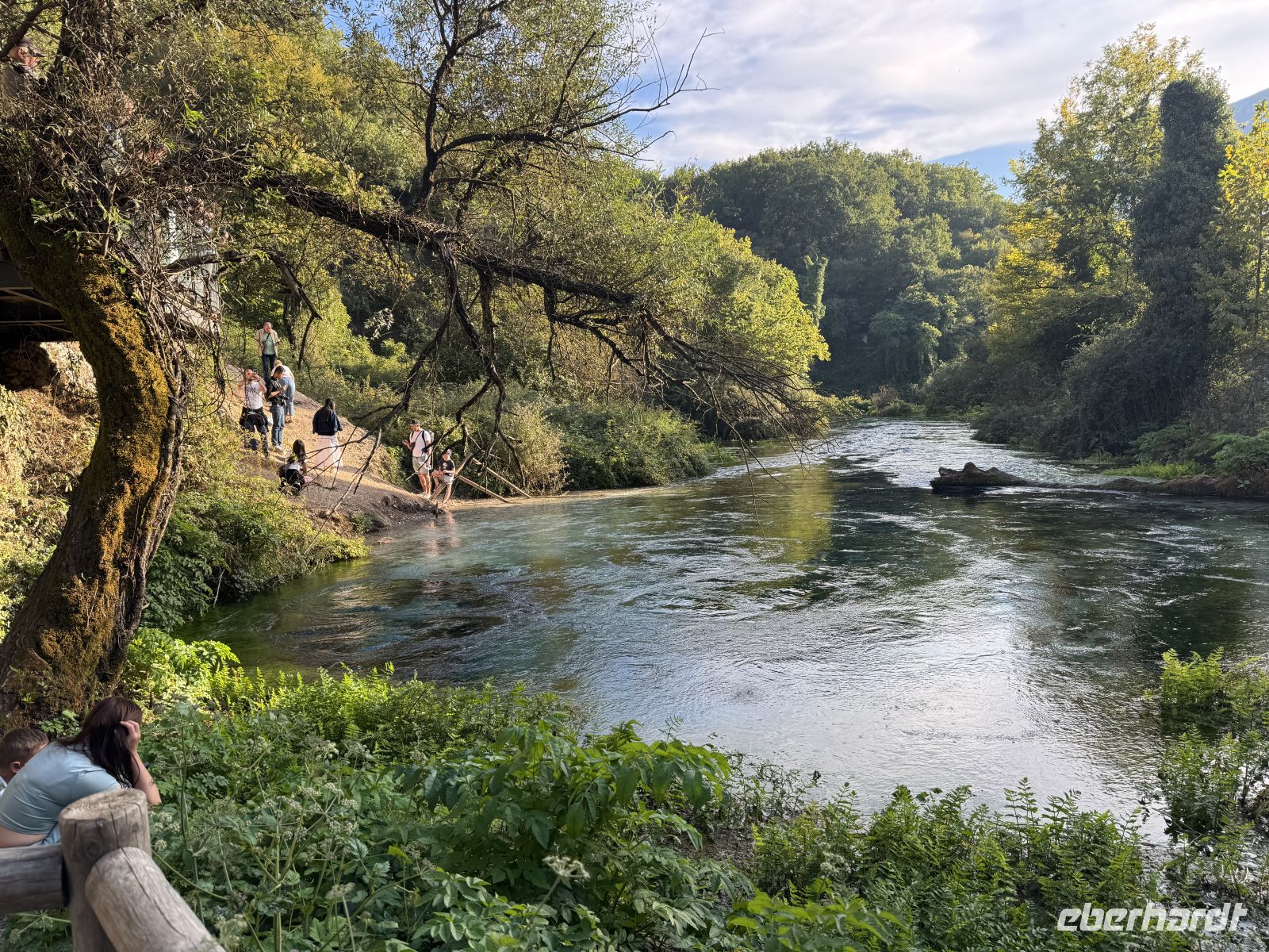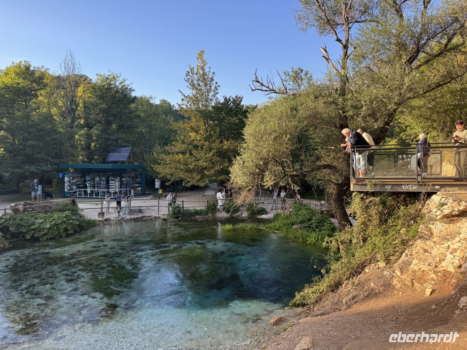 Jetzt fahren wir zum berühmten „Blue Eye“ in der Nähe von Saranda. Das Blue Eye ist ein natürlich vorkommendes geologische Phänomen und mit 6 m³/s die wasserreichste Quelle des Landes. Das Wasser tritt unter hohem Druck aus einem Quelltopf hervor, dessen genaue Tiefe noch nicht erkundet werden konnte. Die Temperatur beträgt 12,75 °C mit einer maximalen Abweichung von lediglich 0,15 °C. Vor dem Hintergrund des hellen Kalksteins hat das Wasser im Sonnenlicht eine tiefblaue Farbe, die ihr auch den Namen verleiht. Das Wasser von Syri i Kaltër fließt in die Bistrica ab, die kurz nach der Quelle zur Energiegewinnung gestaut wird.