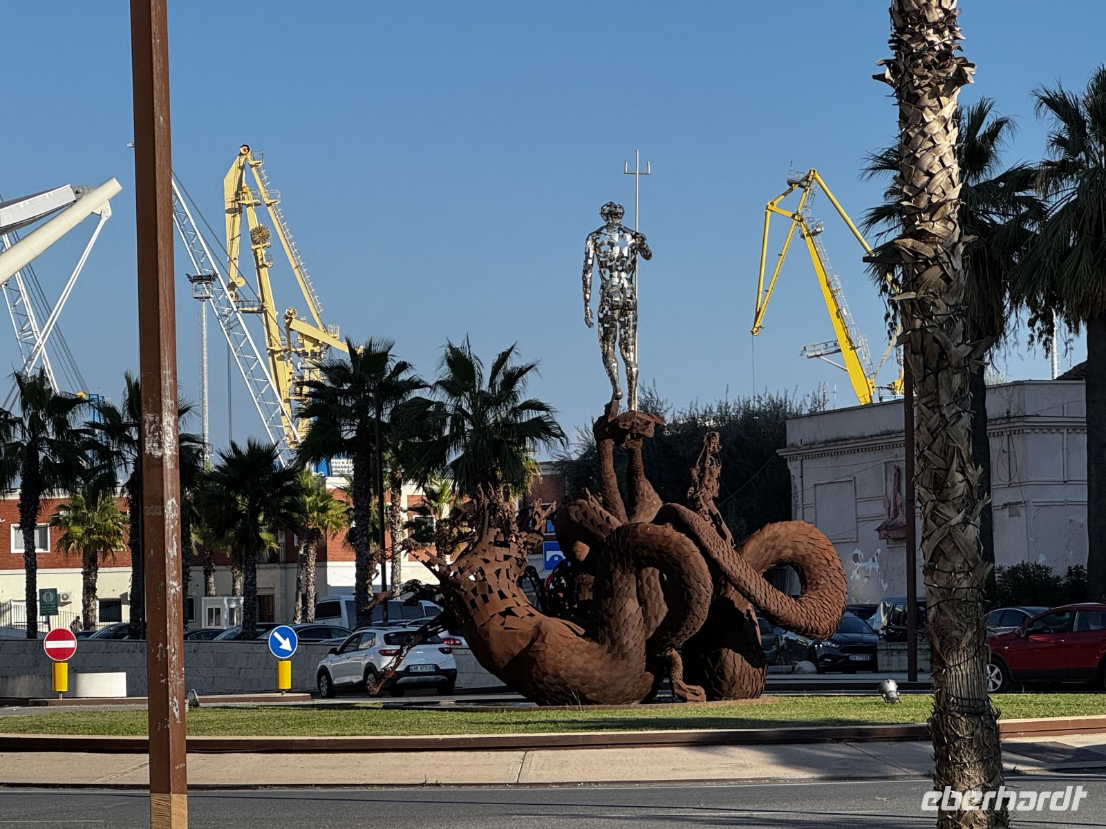 Wir starten an der Uferpromenade, fotografieren uns mit den da stehenden Statuen von John Lennon, Tina Turner, Bob Dylan und Mick Jagger, gehen weiter zumm Venezianischen Turm, einem der Wahrzeichen der Stadt bis zum Amphitheater, das am südwestlichen Rand der historischen Altstadt von Durrës unweit der Südwestspitze der Halbinsel liegt, die den Hafen der Stadt bildet. Der elliptische Bau liegt an den Hängen eines Hügels, der gegen Westen und Norden ansteigt, gleich innerhalb der Stadtmauern. Die Durchmesser des Baus betragen je nach Quelle 118–132 Meter und 98–113 Meter, diejenigen der Arena ca. 61 Meter und 40–42 Meter.[1][3] Das Amphitheater stieg im Westen rund 20 Meter den Hügel hoch an. Im Süden wurden die freistehenden Ränge auf Substruktionen erbaut.
