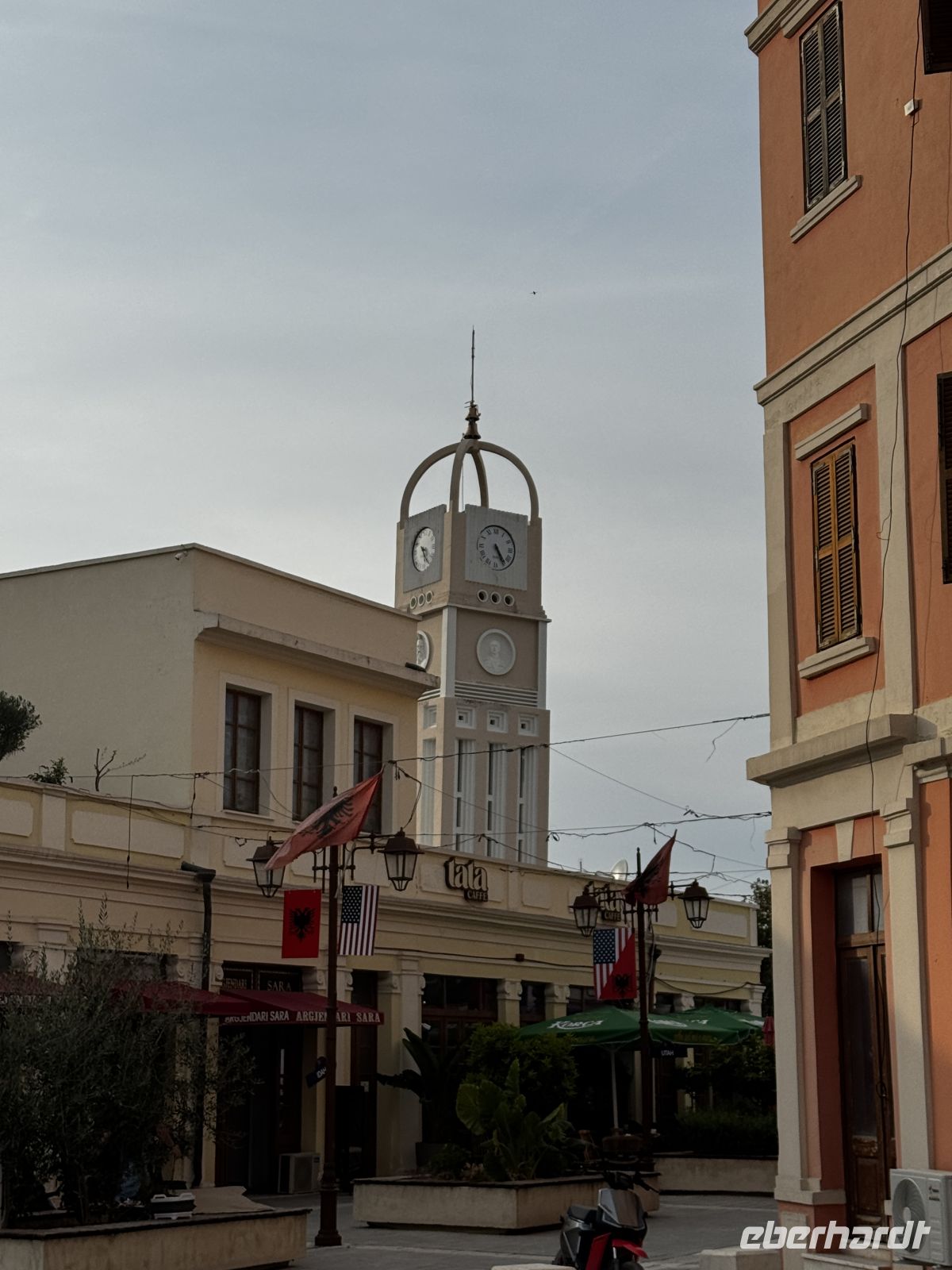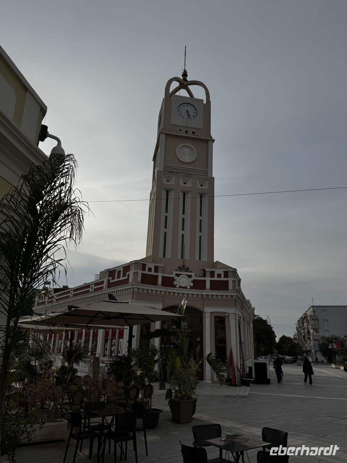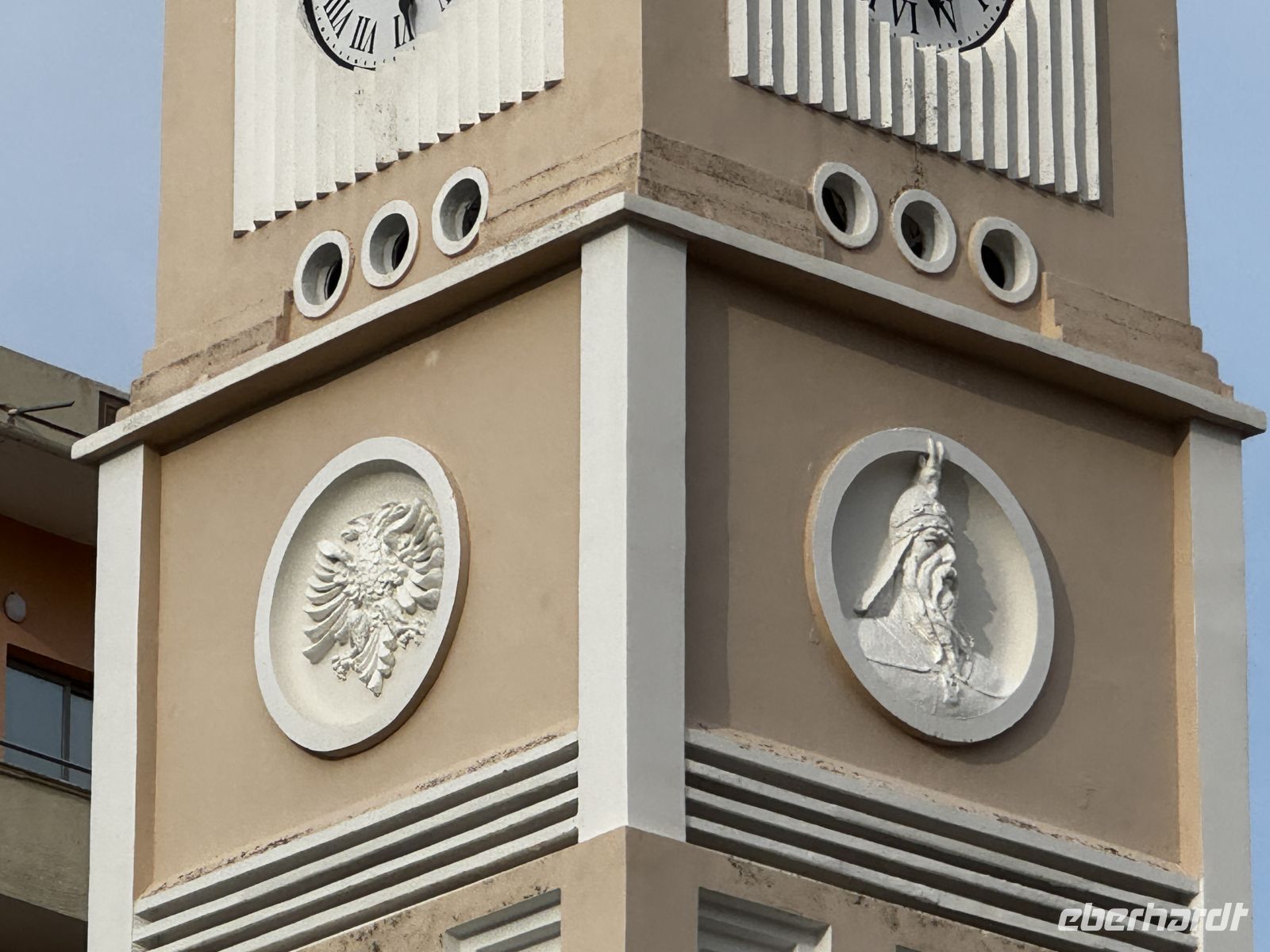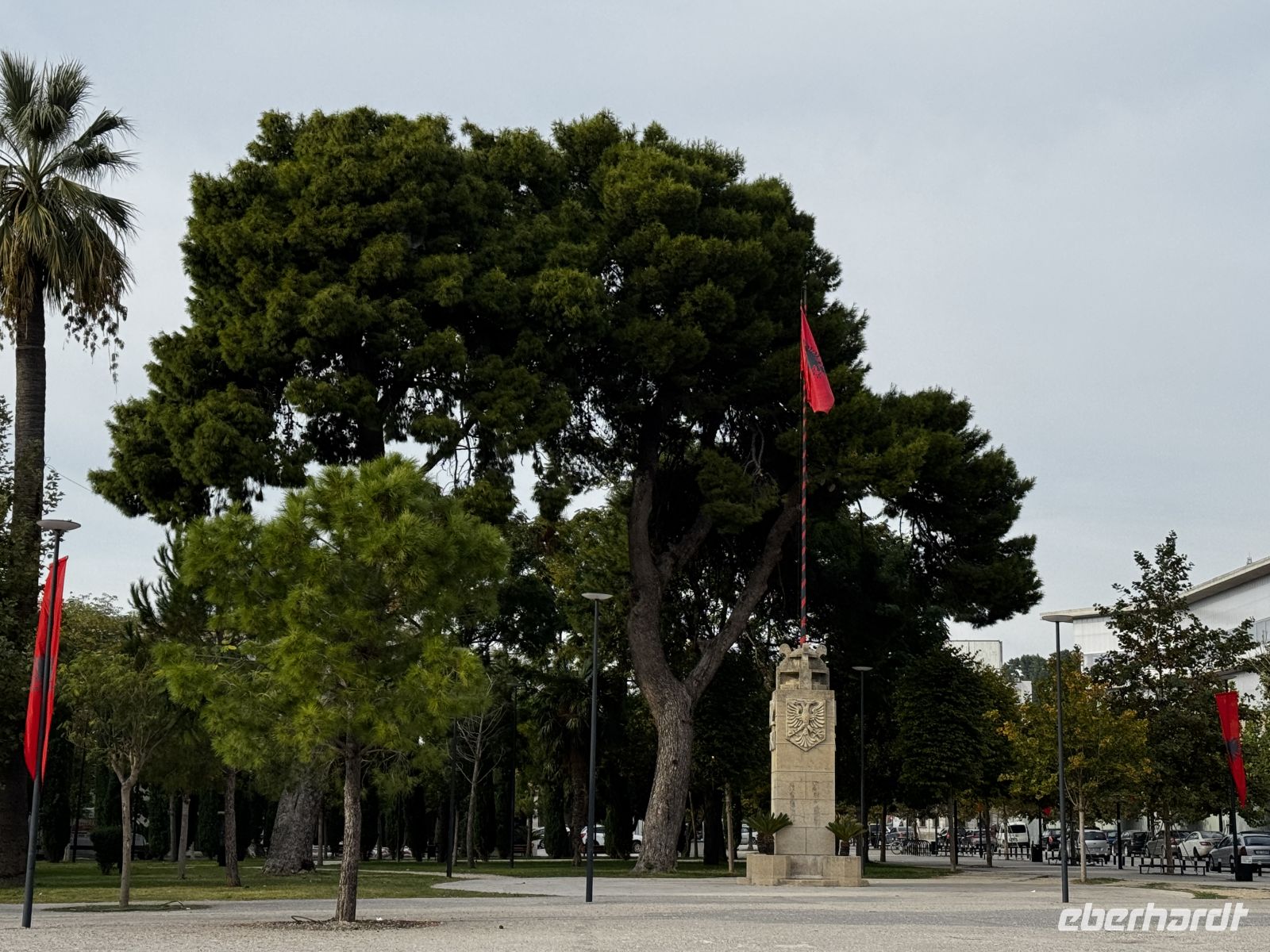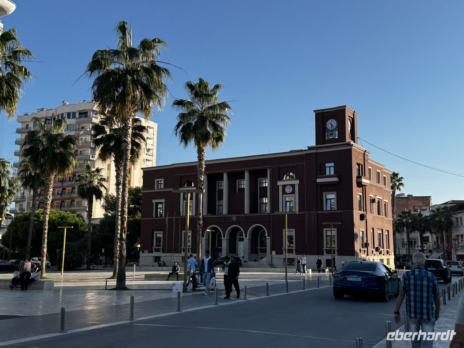 Weiter spazieren wir zum zentralen Platz der Stadt mit dem Rathaus und der großen Moschee von Durres. Mit der großen Kuppel und dem schmalen Minarett handelt es sich um einen Moscheebau im türkischen Stil. Der Bau hat eine Fläche von 1319 Quadratmetern. Es war noch ein zweites Minarett geplant gewesen, das aber nie vollendet worden ist.