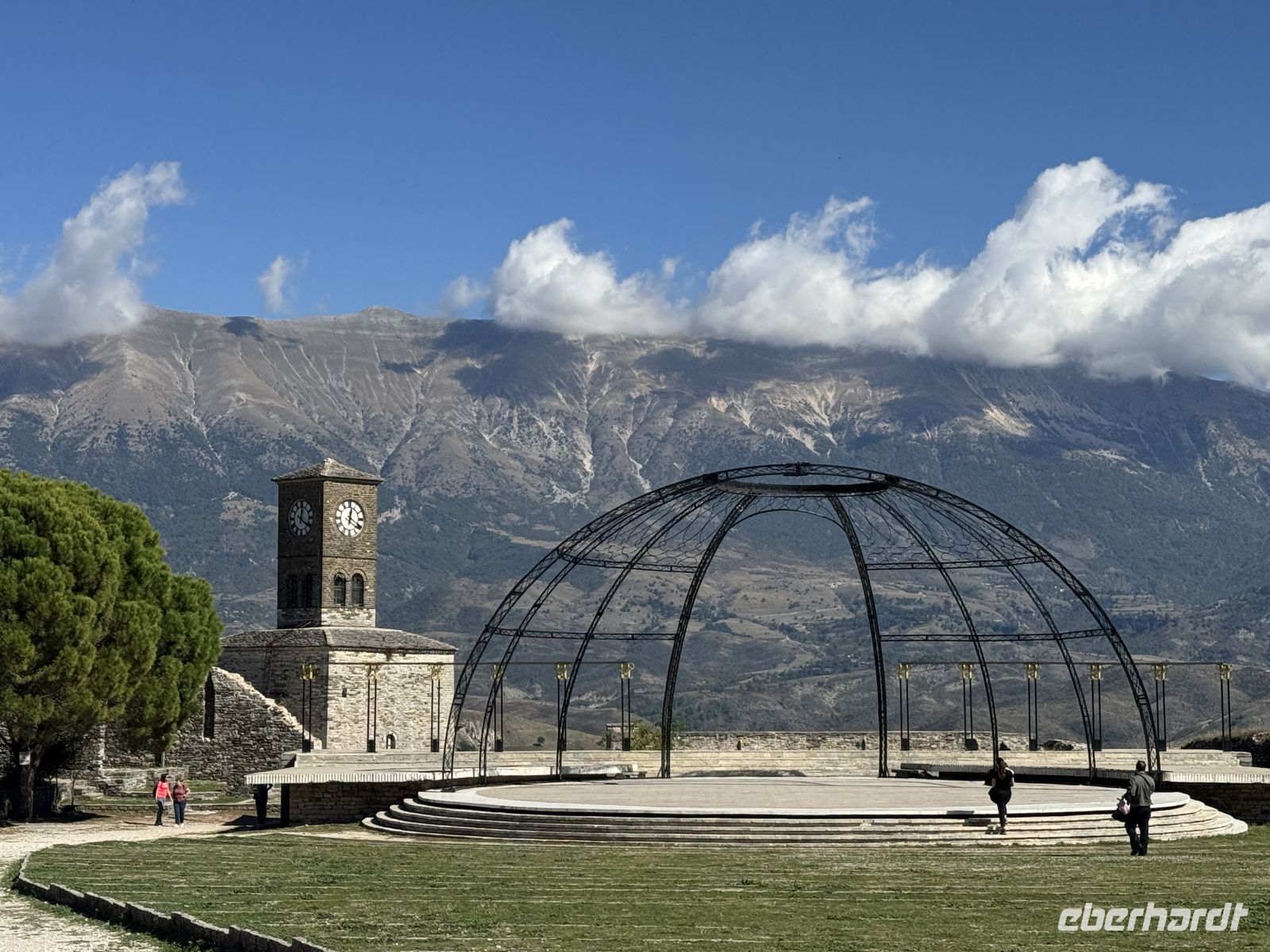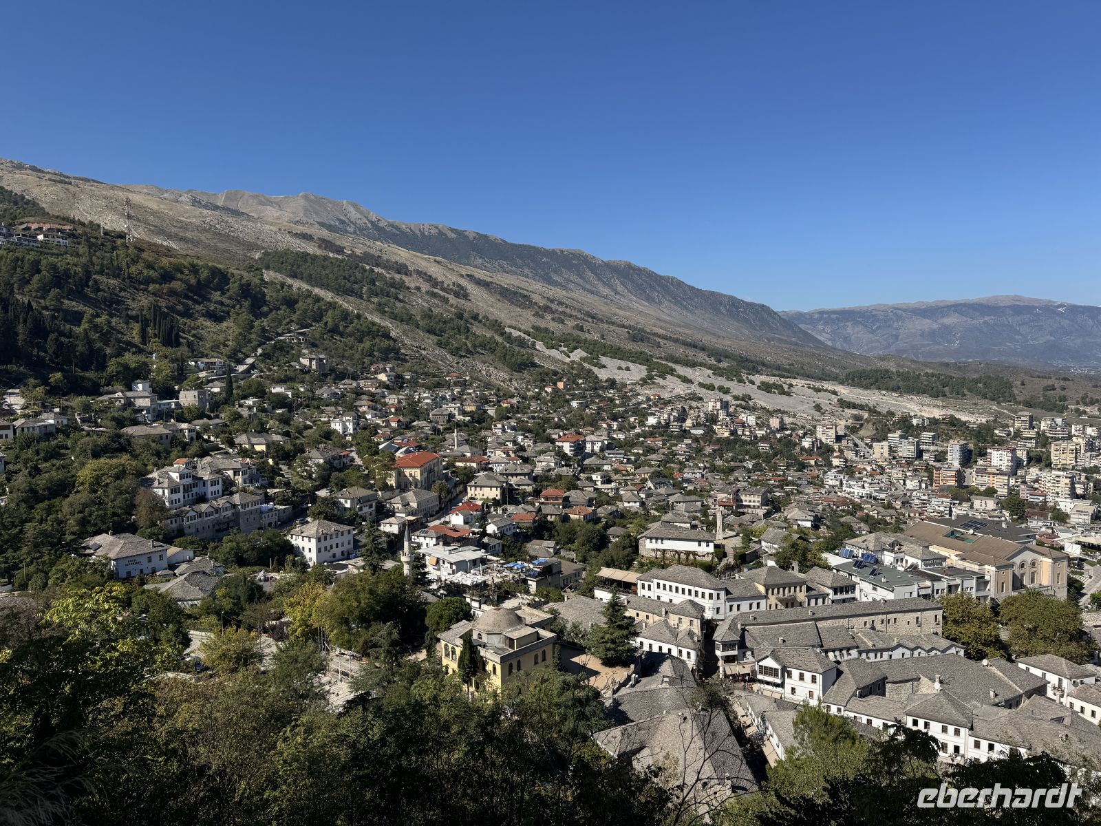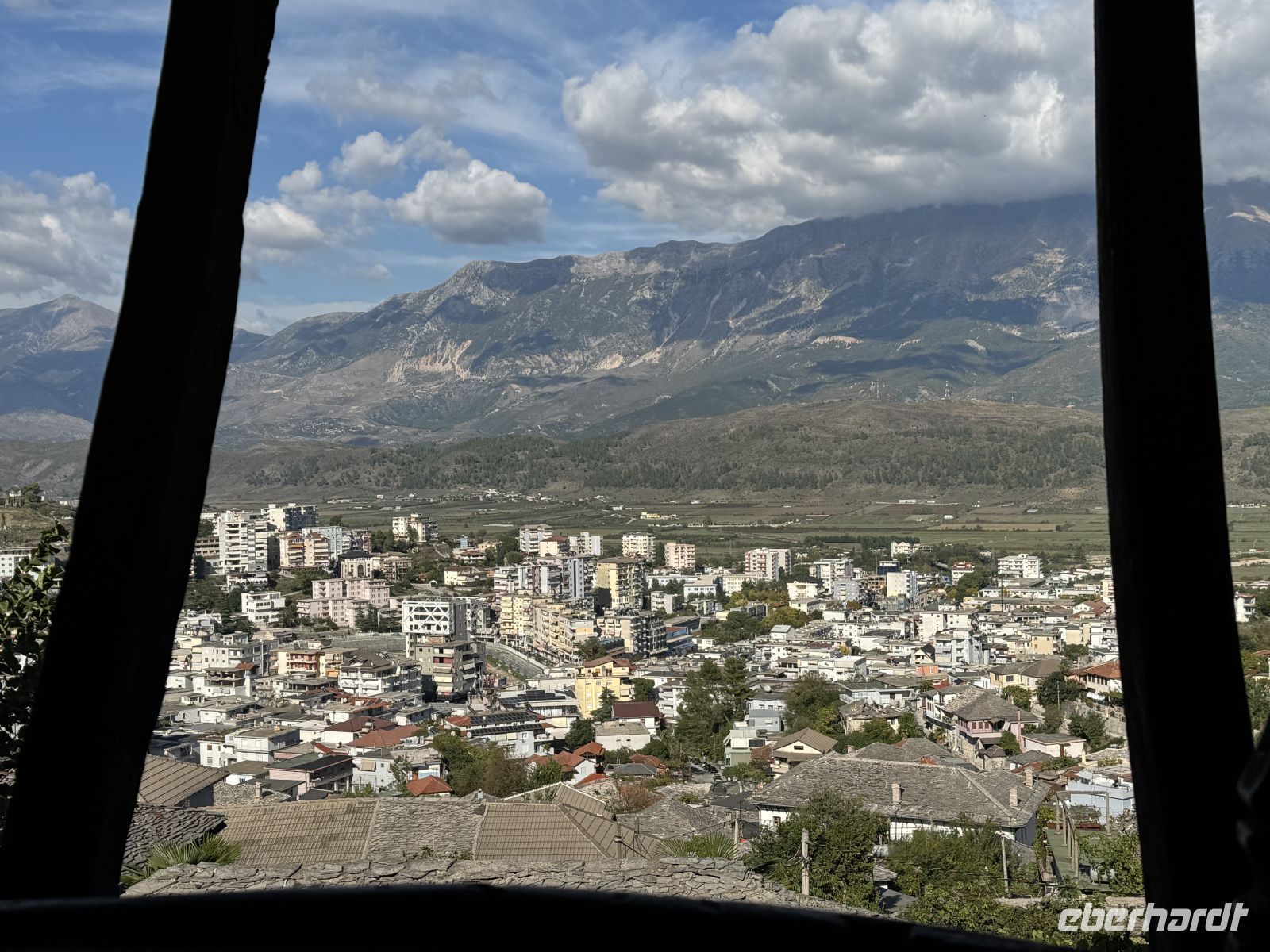 Heute führt uns unsere Reise nach Gjirokastra, der Stadt der tausend Steine. Den Beinamen „Stadt der Steine“ verdankt Gjirokastra seinem einzigartigen Stadtbild. Markante, kleinen Trutzburgen ähnelnde Häuser prägen seit Jahrhunderten die Viertel um die Burg, die heutige Altstadt. Bedeckt mit Steinplatten aus den nahen Gebirgen dienten die Dächer früher dazu, die Innentemperatur der Häuser zu regulieren. Sie zählt seit 2005 zum UNESCO-Welterbe. Sie ist eine der ältesten Städte des Landes und wichtiges kulturelles Zentrum Südalbaniens. Die Stadt ist Geburtsort des ehemaligen Diktators Enver Hoxha und des bekanntesten albanischen Schriftstellers Ismail Kadare. Sue liegt im Süden Albaniens im Flusstal des Drino, das sich hier zur Dropull-Ebene weitet. Die älteren Quartiere der Stadt sind am steilen Hang des Mali i Gjerë auf bis zu 480 m ü. A. erbaut. Neuere Stadtteile ziehen sich abwärts bis zu den kleinen Gewerbegebieten am Flussufer auf 190 m ü. A. Durch die Stadt fließen einige kleinere Bäche von Südwesten Richtung Nordosten, die unterhalb von Gjirokastra in den Drino münden. Bei starkem Niederschlag schwellen sie stark an und treten gelegentlich über die Ufer. Wälder sind im nahen Umland rar. In der Flussebene wird teilweise Landwirtschaft und Viehzucht betrieben.