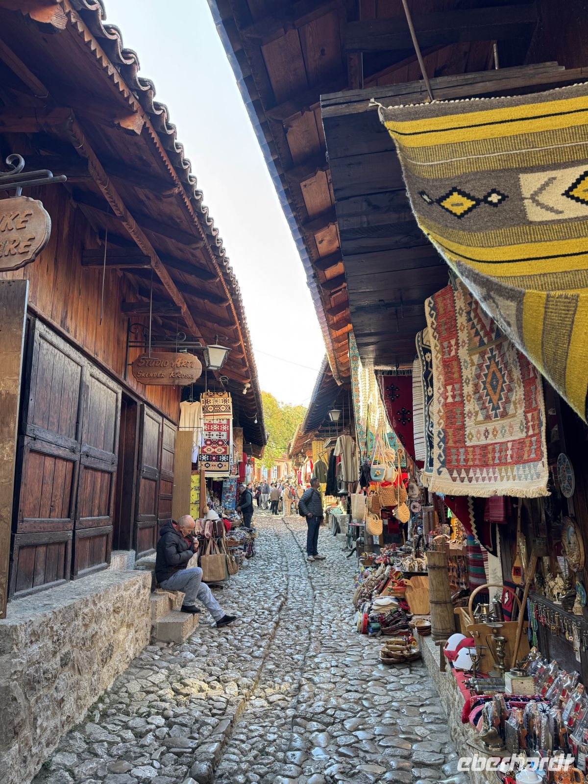 Wir wandern durch die liebevoll restaurierte Basarstraße in der Altstadt vorbei an vielen kleinen Lädchen zur über dem Ort thronenden Burg. Die Burg von Kruja aus dem frühen 6. Jhd. gilt in Albanien als ein historischer Schatz. Das Skanderbeg-Museum bzw. Nationalmuseum befindet sich innerhalb dieser Festung und sieht aus wie eine mittelalterliche Trutzburg, ist aber ein Neubau aus den 80er Jahren, zu welcher Zeit es eröffnet wurde. Hier besuchen wir das ethnografische Museum und erfahren Viel über die albanische Geschichte, die jahrhundertealten Traditionen und das Handwerk des Landes.