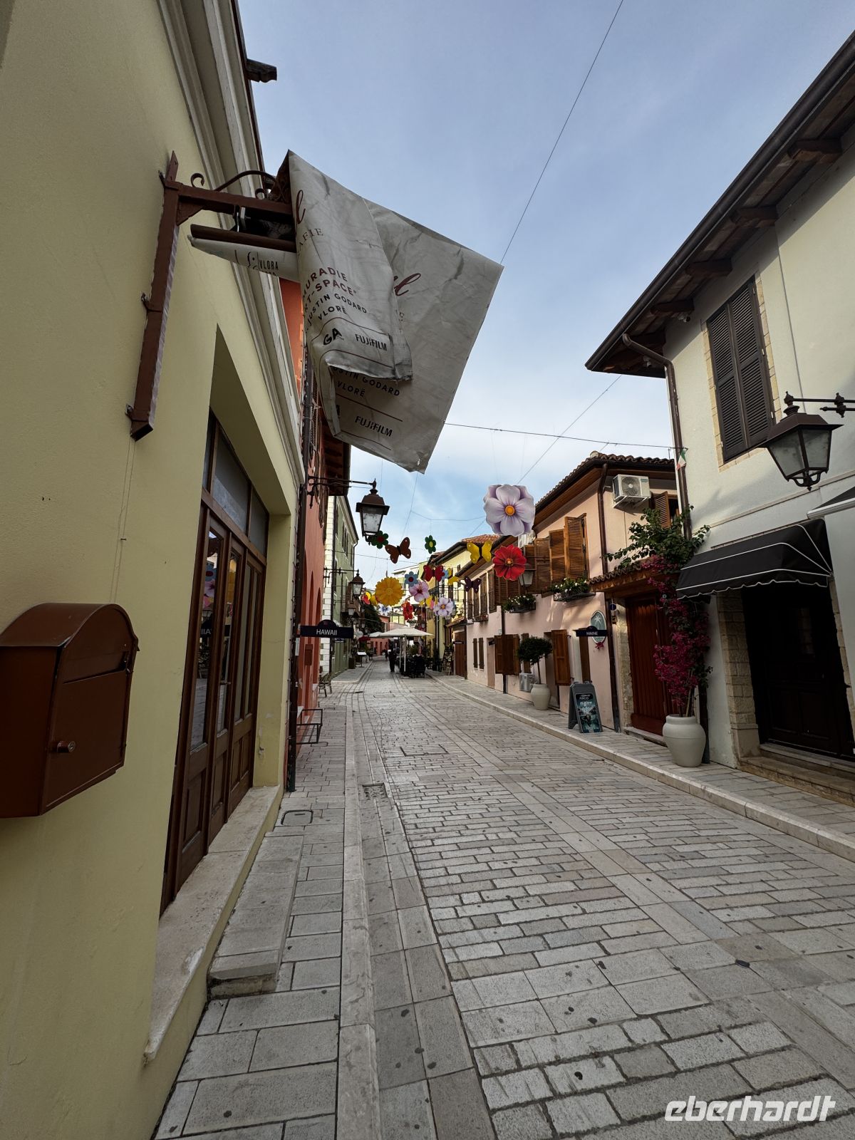 Durch eine von historischen Gebäuden und zahlreichen Cafés und Bars gesäumte Straße kehren wir zurück zum Venezianischen Turm.