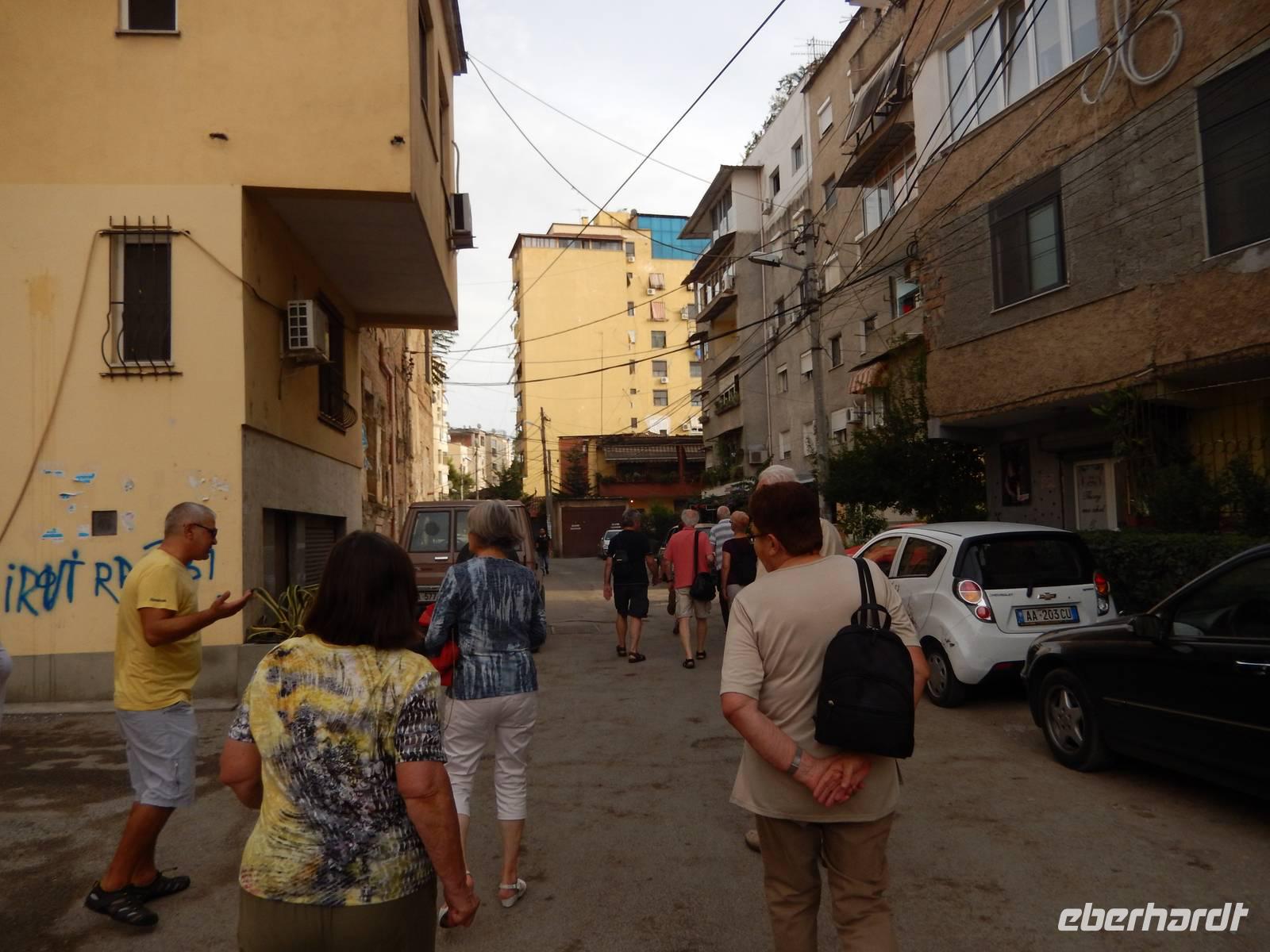 Einige Gäste wollten noch gern Geld tauschen und Briefmarken besorgen, daher ging es kurz nach 13 Uhr zur Wechselstube und zur Post. Beide Geschäfte waren schnell gefunden, nur hatte diese Post leider nicht die richtigen Briefmarken, dass wir kurzerhand weiterzogen und eine andere Post fanden, wo wir alle unsere Briefmarken kaufen konnten. Danach stellten wir fest, dass wir schon die halbe Innenstadt bei dem größeren Spaziergang gesehen hatten. Am Nachmittag ging es dann etwas später als gewollt los und wir liefen von unserem Hotel zu dem nicht weit entfernt gelegenen Museum. Hier hörten wir uns die interessanten Erklärungen unseres Reiseleiters an und man hatte das Gefühl, hier könnte man auch zwei Tage verbringen. Anschließend ging es in das sehr schöne Restaurant Era. Hier saßen wir auf einer Terrasse im Garten und trauten kaum unseren Augen. Der Kellner brachte ein Gericht nach dem anderen und wenn man dachte es ist kein Platz mehr auf dem Tisch, er fand immer noch eine Lücke für den nächsten Teller. Nachdem wir in die köstliche Welt der albanischen Küche abgetaucht waren, traten wir den Nachhauseweg an und freuten uns alle auf das Bett.
