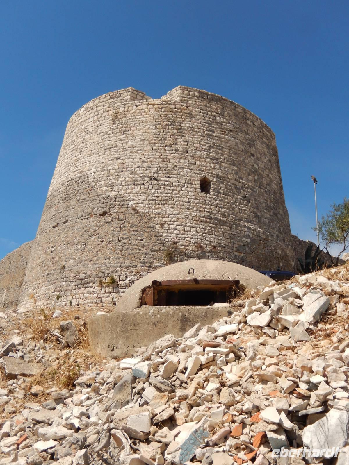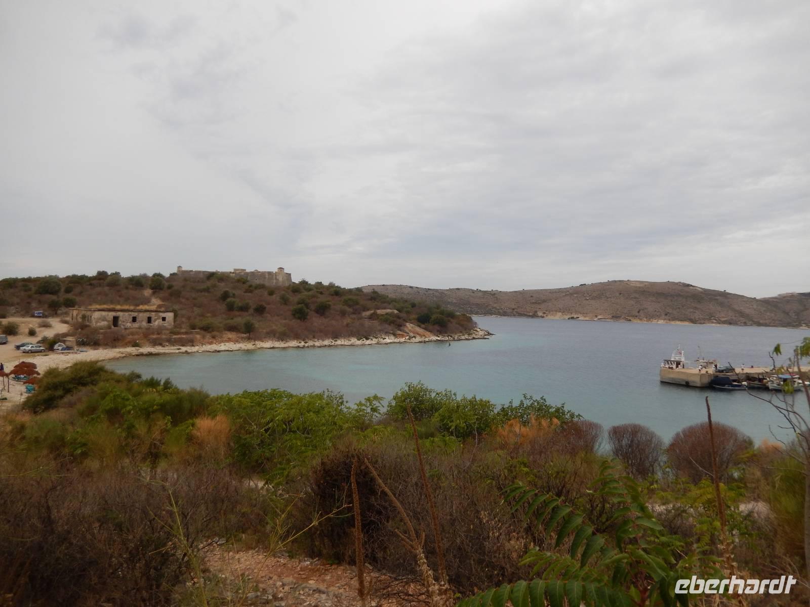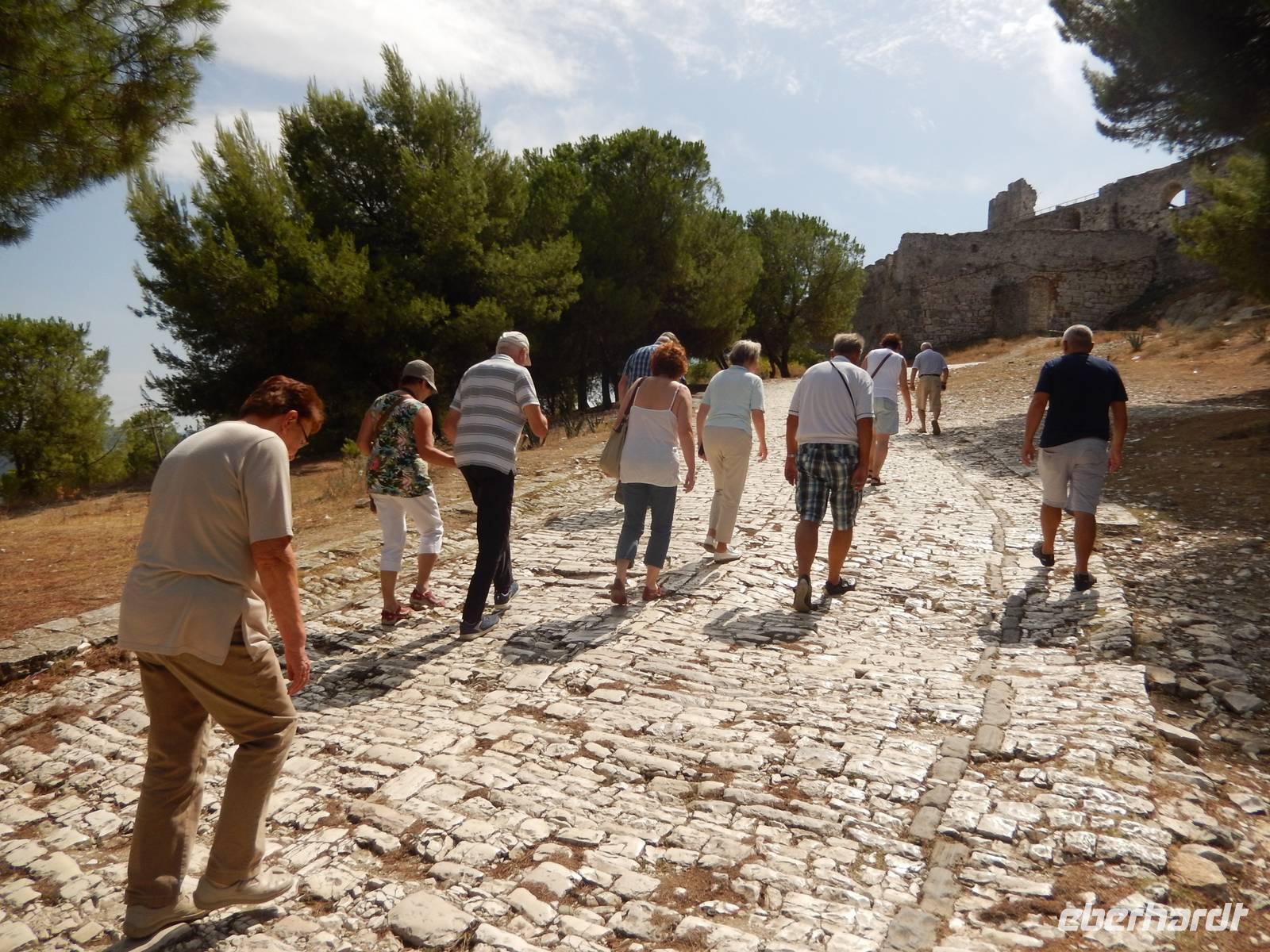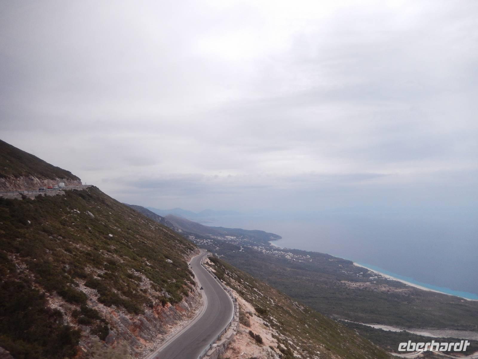 Auch an diesem Morgen konnten wir die herrliche Aussicht beim Frühstück genießen, ehe wir aus unserem Hotel auscheckten. Heute hatten wir eine kleinen Fahrt vor uns. Die Zeit verflog aber sehr schnell, da es auf einer Panoramastraße, teilweise 1000 Meter über dem Meer, entlang ging und Koli zu jedem Dorf eine Geschichte kannte. Unterwegs hielten wir in Kalaja e Porto Palermos. Hier gab es eine alte Festung zu bestaunen. Anscheinend war es neu, dass nun ein älterer Herr davor stand und Eintritt verlangte. Auch Koli war sich nicht sicher, ob dieser Herr für den Staat arbeitete oder das Geld in die eigene Tasche wirtschaftete. So beschlossen wir, uns die Festung nur von außen an zu sehen. Der Vater von Koli war einst U-Boot Kapitän, was sehr interessant war, da sich hier der einzige U-Boot Hafen von Albanien befindet. Nachdem wir die ersten kulturellen Leckerbissen angesehen hatten, war es Zeit für einen Kaffee oder einen Bergtee, in der nahe gelegenen Taverne mit Blick auf das klare Wasser, was es auch zu trinken gab. Danach ging es weiter auf der Panoramastraße, welche sich Kurve um Kurve nach oben zu unserem Mittagsstopp schlängelte. Hier gibt es eine örtliche Spezialität. Einen Joghurt auf Schafskäse Basis mit Honig und Walnüssen. Als wir wieder das Lokal verließen, trauten wir unseren Augen nicht. Dort wo wir gerade noch eine herrliche Aussicht auf das Meer hatten, zog jetzt eine dicke Nebelwand an uns vorbei, die uns gerade einmal 10 Meter weit sehen ließ. Im Bus benebelten wir uns selbst ein wenig, in dem wir auf unsere Gesundheit einen kleinen Skanderberg tranken. :-)