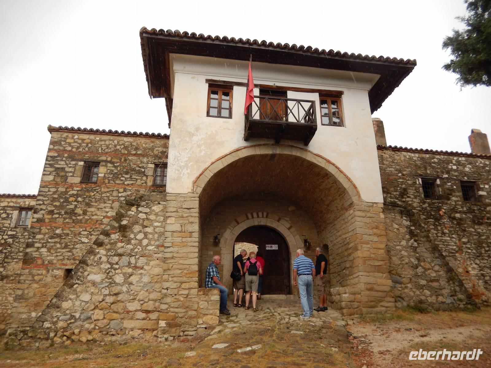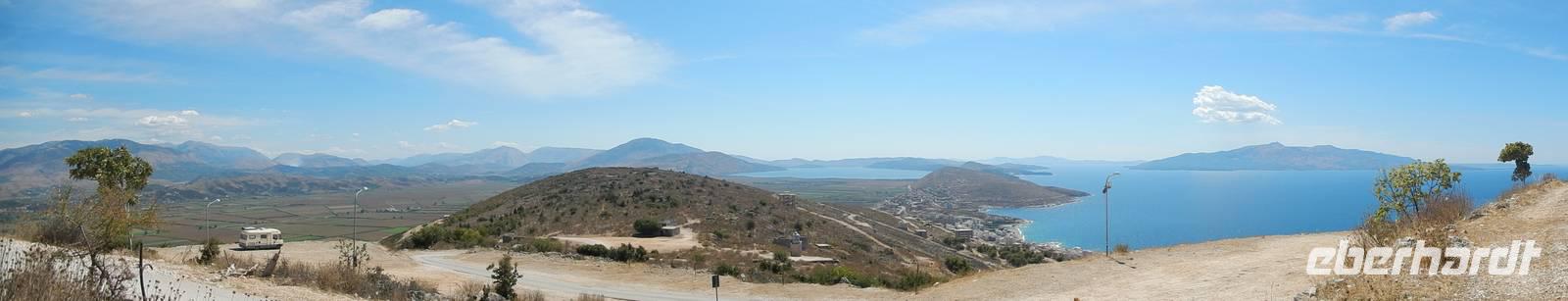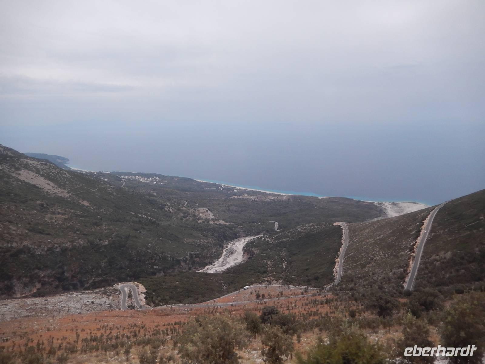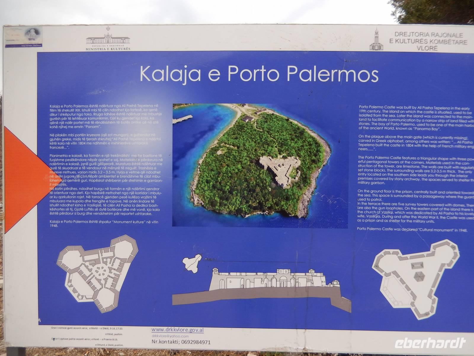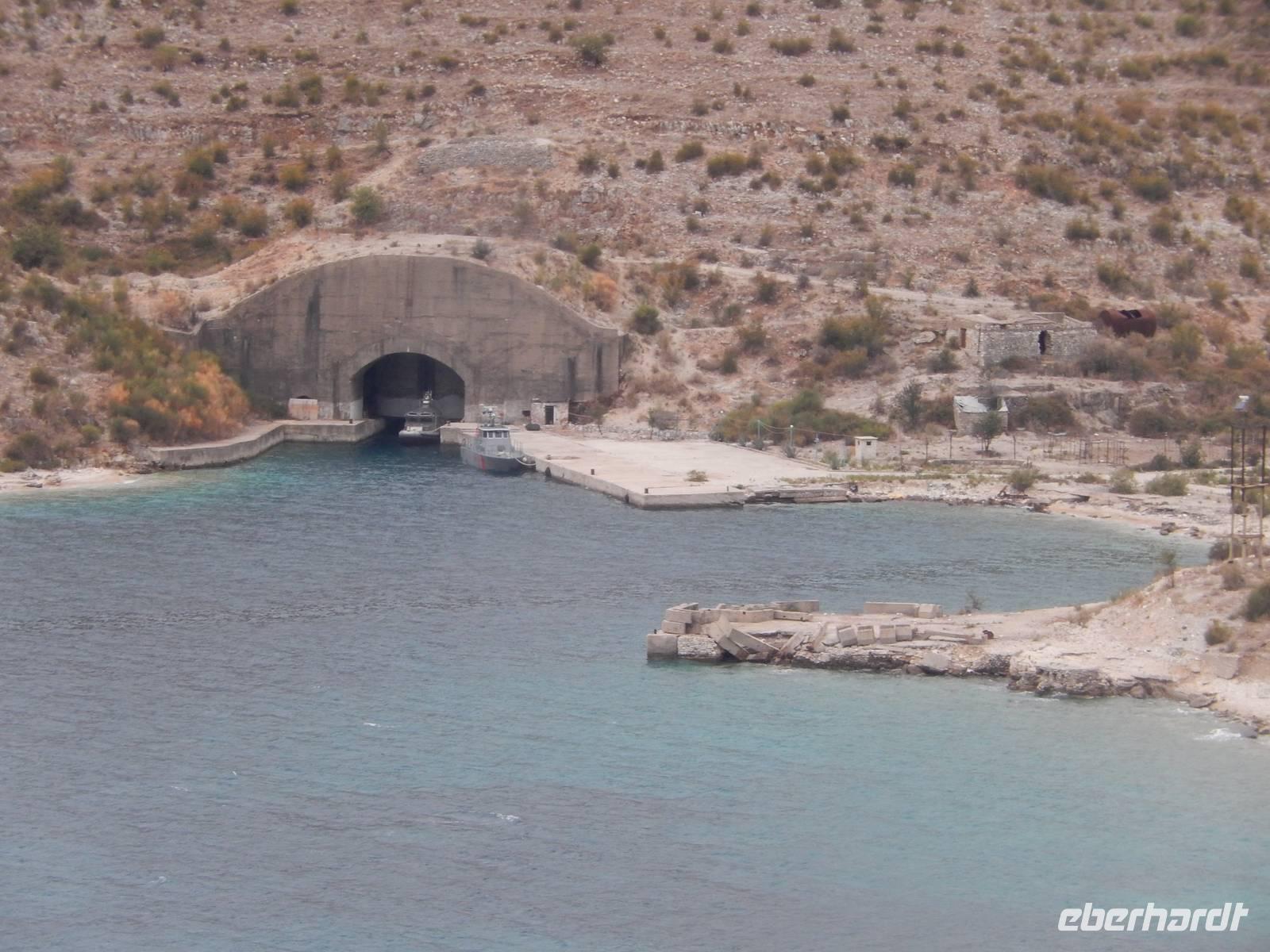 Auch an diesem Morgen konnten wir die herrliche Aussicht beim Frühstück genießen, ehe wir aus unserem Hotel auscheckten. Heute hatten wir eine kleinen Fahrt vor uns. Die Zeit verflog aber sehr schnell, da es auf einer Panoramastraße, teilweise 1000 Meter über dem Meer, entlang ging und Koli zu jedem Dorf eine Geschichte kannte. Unterwegs hielten wir in Kalaja e Porto Palermos. Hier gab es eine alte Festung zu bestaunen. Anscheinend war es neu, dass nun ein älterer Herr davor stand und Eintritt verlangte. Auch Koli war sich nicht sicher, ob dieser Herr für den Staat arbeitete oder das Geld in die eigene Tasche wirtschaftete. So beschlossen wir, uns die Festung nur von außen an zu sehen. Der Vater von Koli war einst U-Boot Kapitän, was sehr interessant war, da sich hier der einzige U-Boot Hafen von Albanien befindet. Nachdem wir die ersten kulturellen Leckerbissen angesehen hatten, war es Zeit für einen Kaffee oder einen Bergtee, in der nahe gelegenen Taverne mit Blick auf das klare Wasser, was es auch zu trinken gab. Danach ging es weiter auf der Panoramastraße, welche sich Kurve um Kurve nach oben zu unserem Mittagsstopp schlängelte. Hier gibt es eine örtliche Spezialität. Einen Joghurt auf Schafskäse Basis mit Honig und Walnüssen. Als wir wieder das Lokal verließen, trauten wir unseren Augen nicht. Dort wo wir gerade noch eine herrliche Aussicht auf das Meer hatten, zog jetzt eine dicke Nebelwand an uns vorbei, die uns gerade einmal 10 Meter weit sehen ließ. Im Bus benebelten wir uns selbst ein wenig, in dem wir auf unsere Gesundheit einen kleinen Skanderberg tranken. :-)