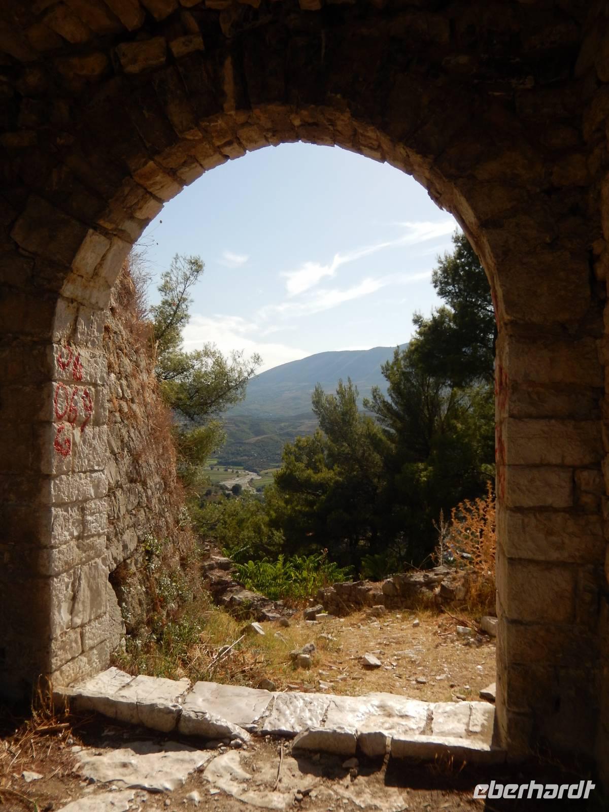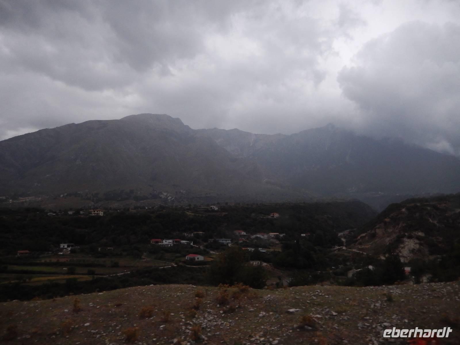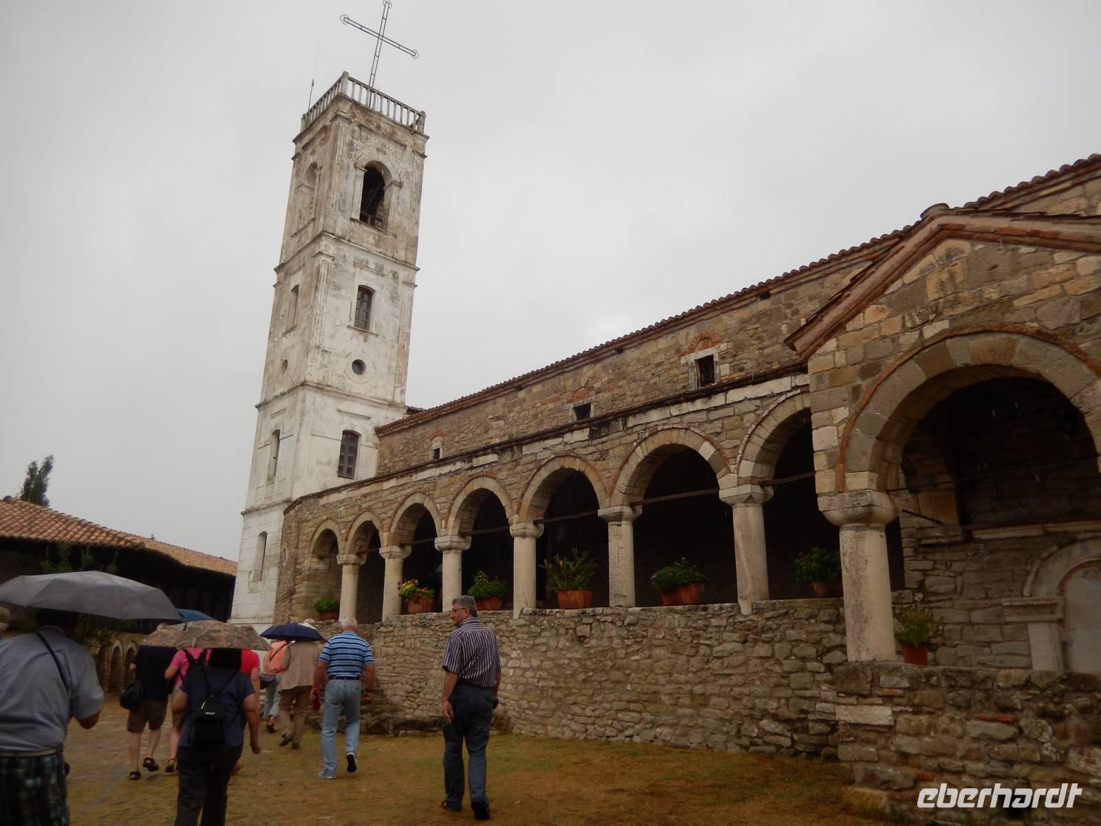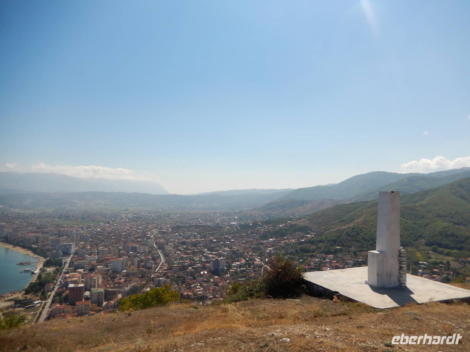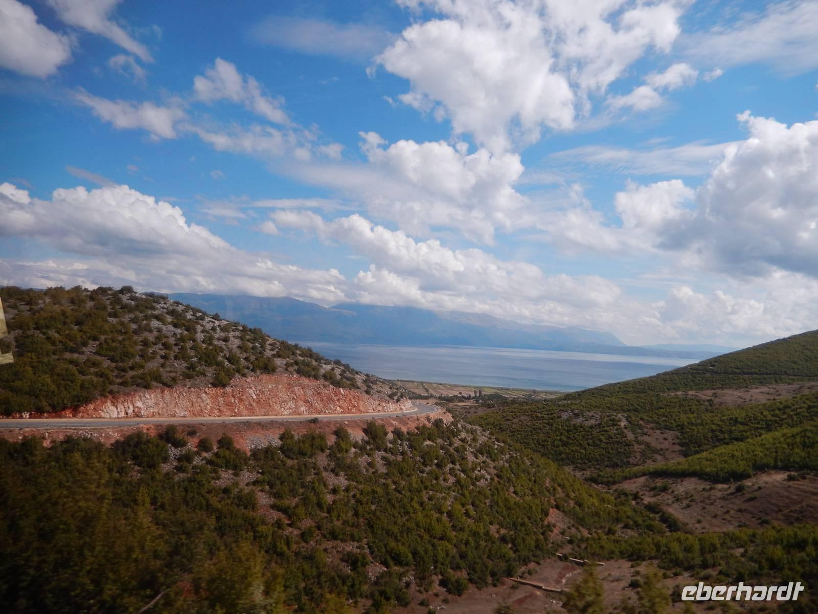 Auch an diesem Morgen konnten wir die herrliche Aussicht beim Frühstück genießen, ehe wir aus unserem Hotel auscheckten. Heute hatten wir eine kleinen Fahrt vor uns. Die Zeit verflog aber sehr schnell, da es auf einer Panoramastraße, teilweise 1000 Meter über dem Meer, entlang ging und Koli zu jedem Dorf eine Geschichte kannte. Unterwegs hielten wir in Kalaja e Porto Palermos. Hier gab es eine alte Festung zu bestaunen. Anscheinend war es neu, dass nun ein älterer Herr davor stand und Eintritt verlangte. Auch Koli war sich nicht sicher, ob dieser Herr für den Staat arbeitete oder das Geld in die eigene Tasche wirtschaftete. So beschlossen wir, uns die Festung nur von außen an zu sehen. Der Vater von Koli war einst U-Boot Kapitän, was sehr interessant war, da sich hier der einzige U-Boot Hafen von Albanien befindet. Nachdem wir die ersten kulturellen Leckerbissen angesehen hatten, war es Zeit für einen Kaffee oder einen Bergtee, in der nahe gelegenen Taverne mit Blick auf das klare Wasser, was es auch zu trinken gab. Danach ging es weiter auf der Panoramastraße, welche sich Kurve um Kurve nach oben zu unserem Mittagsstopp schlängelte. Hier gibt es eine örtliche Spezialität. Einen Joghurt auf Schafskäse Basis mit Honig und Walnüssen. Als wir wieder das Lokal verließen, trauten wir unseren Augen nicht. Dort wo wir gerade noch eine herrliche Aussicht auf das Meer hatten, zog jetzt eine dicke Nebelwand an uns vorbei, die uns gerade einmal 10 Meter weit sehen ließ. Im Bus benebelten wir uns selbst ein wenig, in dem wir auf unsere Gesundheit einen kleinen Skanderberg tranken. :-)