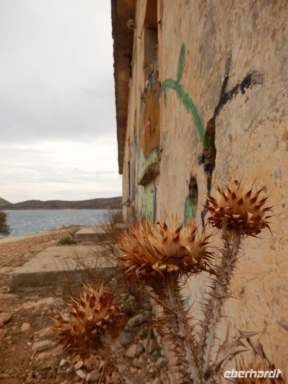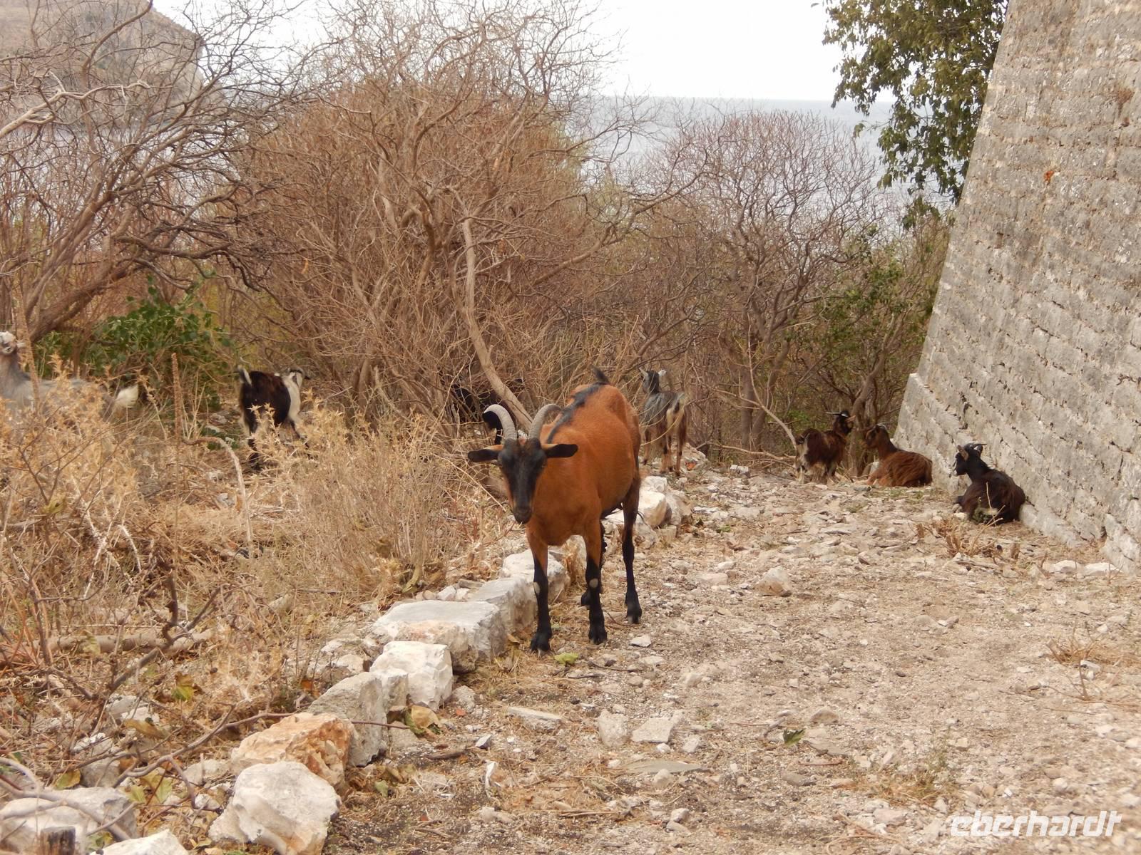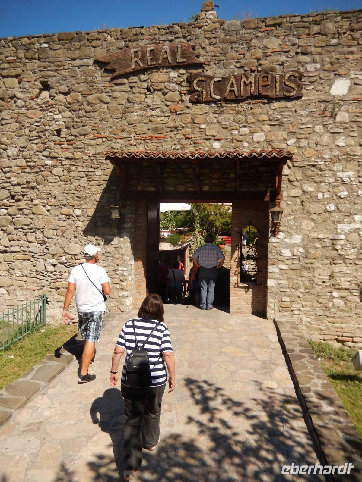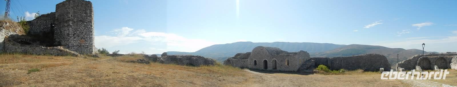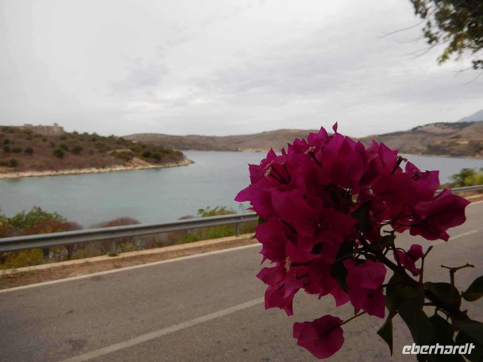 Auch an diesem Morgen konnten wir die herrliche Aussicht beim Frühstück genießen, ehe wir aus unserem Hotel auscheckten. Heute hatten wir eine kleinen Fahrt vor uns. Die Zeit verflog aber sehr schnell, da es auf einer Panoramastraße, teilweise 1000 Meter über dem Meer, entlang ging und Koli zu jedem Dorf eine Geschichte kannte. Unterwegs hielten wir in Kalaja e Porto Palermos. Hier gab es eine alte Festung zu bestaunen. Anscheinend war es neu, dass nun ein älterer Herr davor stand und Eintritt verlangte. Auch Koli war sich nicht sicher, ob dieser Herr für den Staat arbeitete oder das Geld in die eigene Tasche wirtschaftete. So beschlossen wir, uns die Festung nur von außen an zu sehen. Der Vater von Koli war einst U-Boot Kapitän, was sehr interessant war, da sich hier der einzige U-Boot Hafen von Albanien befindet. Nachdem wir die ersten kulturellen Leckerbissen angesehen hatten, war es Zeit für einen Kaffee oder einen Bergtee, in der nahe gelegenen Taverne mit Blick auf das klare Wasser, was es auch zu trinken gab. Danach ging es weiter auf der Panoramastraße, welche sich Kurve um Kurve nach oben zu unserem Mittagsstopp schlängelte. Hier gibt es eine örtliche Spezialität. Einen Joghurt auf Schafskäse Basis mit Honig und Walnüssen. Als wir wieder das Lokal verließen, trauten wir unseren Augen nicht. Dort wo wir gerade noch eine herrliche Aussicht auf das Meer hatten, zog jetzt eine dicke Nebelwand an uns vorbei, die uns gerade einmal 10 Meter weit sehen ließ. Im Bus benebelten wir uns selbst ein wenig, in dem wir auf unsere Gesundheit einen kleinen Skanderberg tranken. :-)