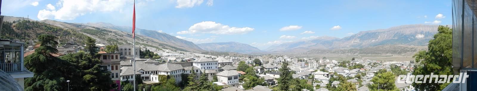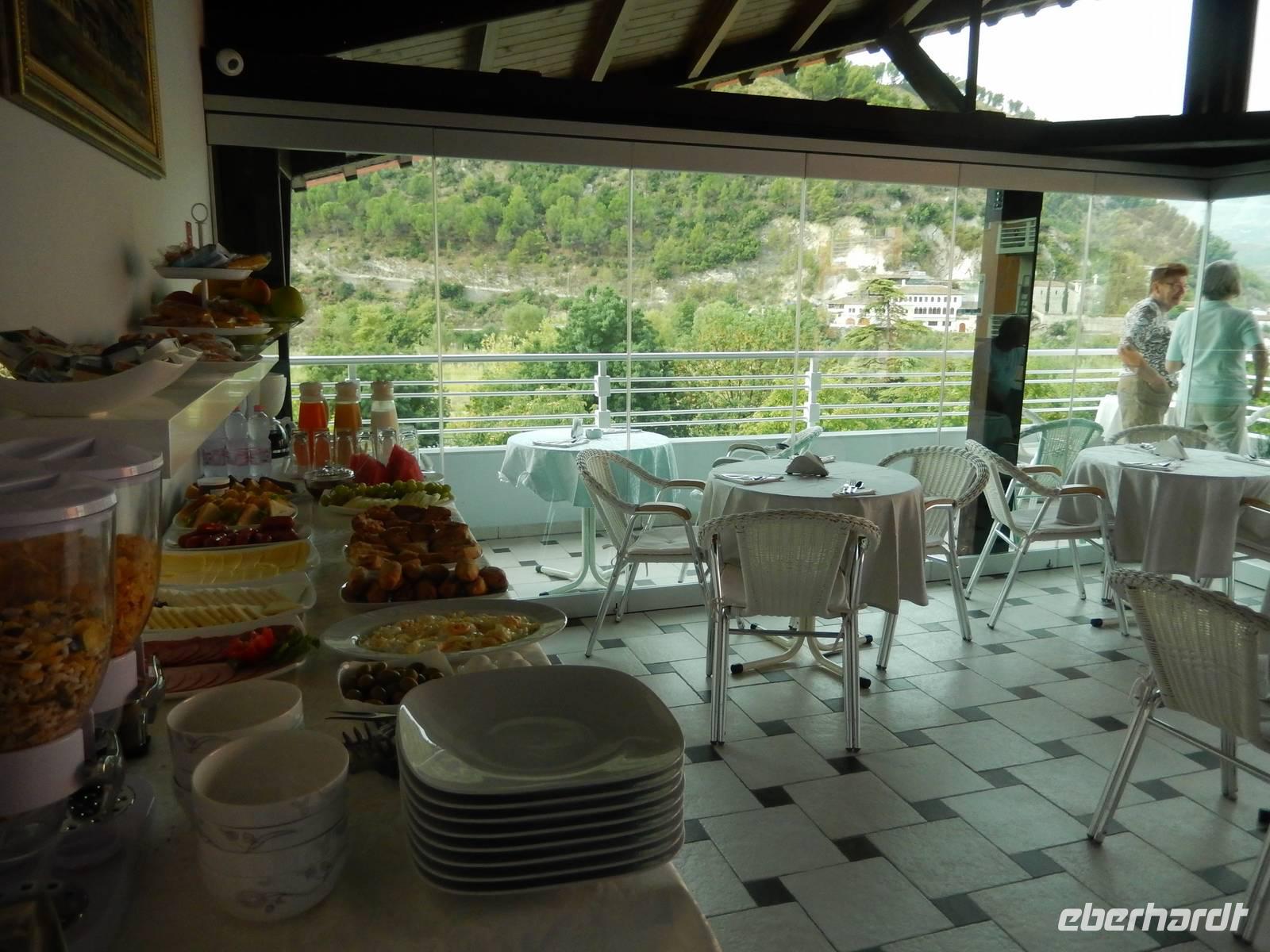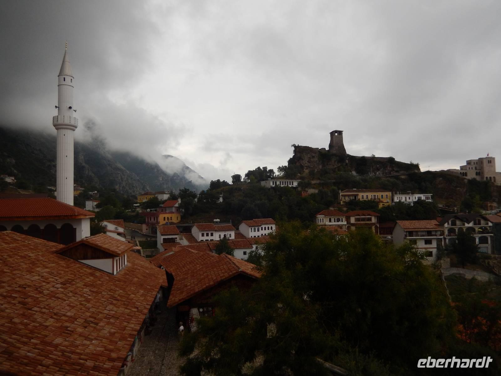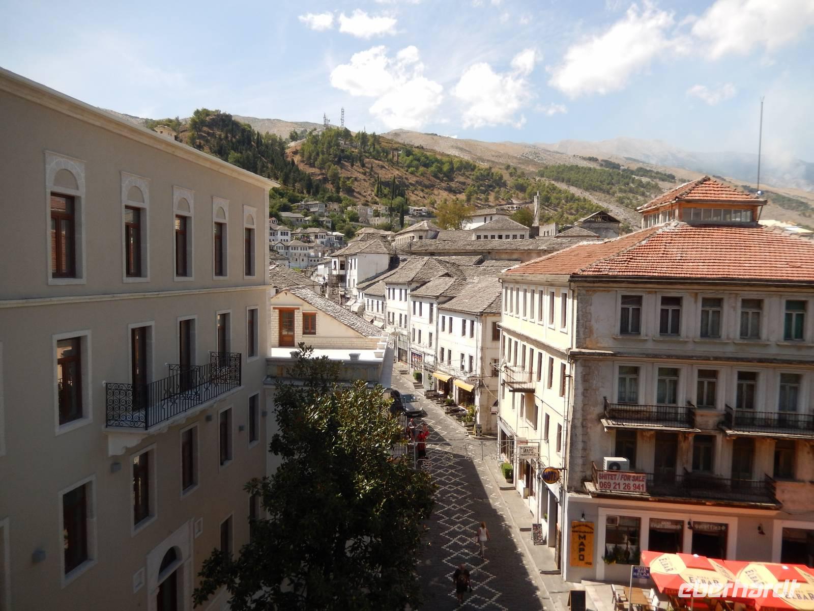 Am Morgen erwartete uns ein Frühstück de luxe. Das Buffet war reichlich gedeckt und wir speisten auf der Dachterrasse und genossen die morgendliche frische Luft. Gegen 9 Uhr verließen wir unser schönes Hotel und Koli schlug vor, einen anderen Weg zu fahren damit wir auch etwas von den Dörfern sehen können. Er erklärte uns auf dem Hinweg nach Gijrokaster die umliegende Landschaft, spielte uns kurz typische einheimische Musik vor und erläuterte uns die Zusammenhänge der umliegenden Länder mit Albanien. In Gijrokaster aßen wir abermals über den Dächern der Stadt, ehe es zu dem Geburtshaus von Enver Hoxha ging. Dieses beheimatet heute ein Ethnografisches Museum. Hier erfuhren wir mehr über die alten Lebensgewohnheiten der Einwohner.
