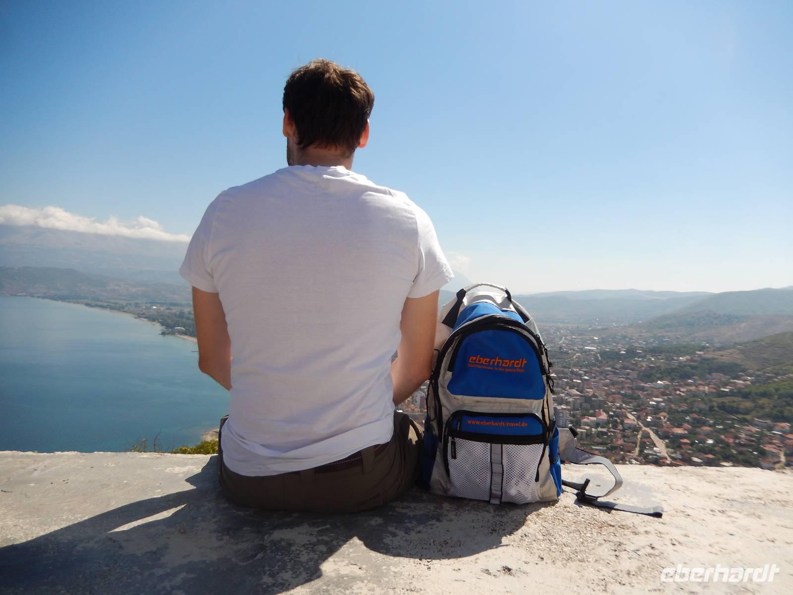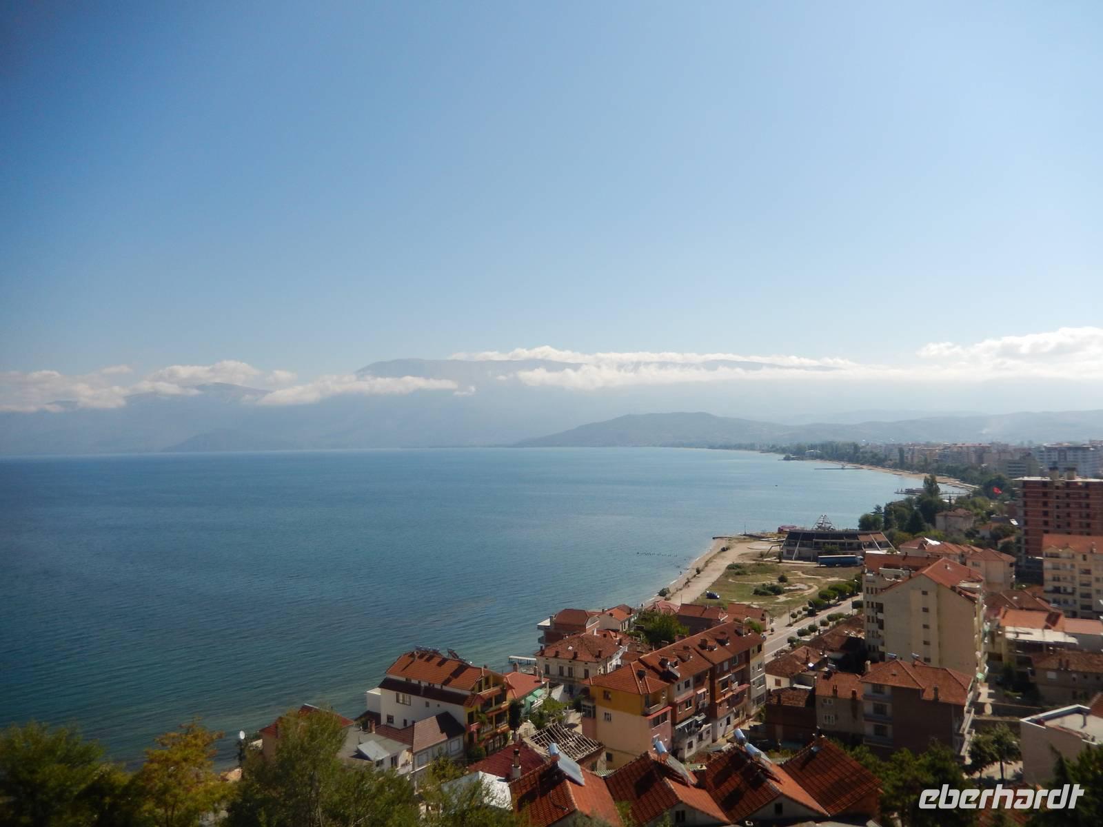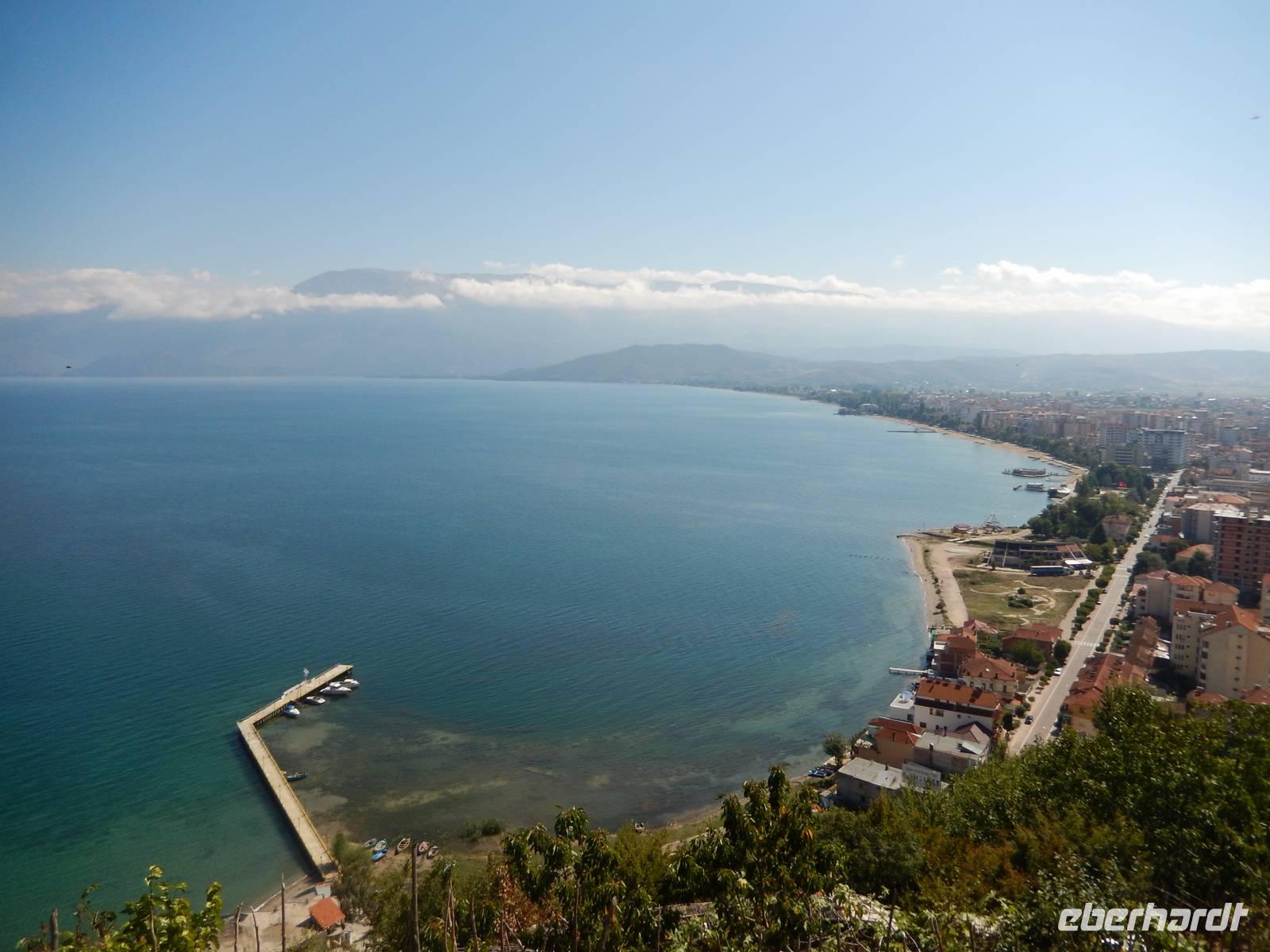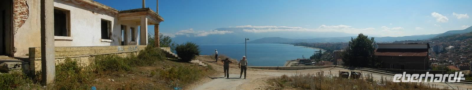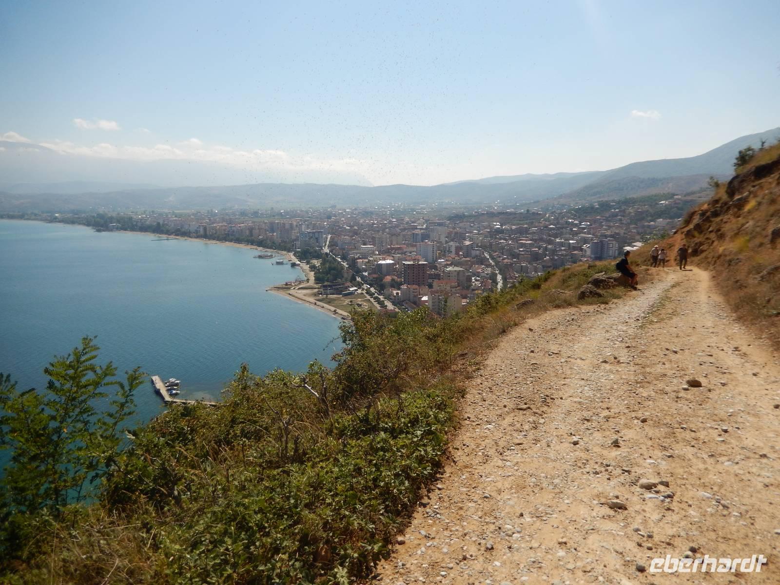 Die Wandertruppe folgte zunächst erst einmal schmalen Gassen, die durch die Stadt gingen, ehe sie am Stadtrand auf einen Pfad trafen welcher sie nach oben führte. Unterwegs hatte man eine herrliche Aussicht auf das glasklare Wasser und konnte sich auch einen guten Überblick auf die Stadt verschaffen. Auf dem Weg nach unten pflückten wir noch nicht ganz reife Walnüsse, knackten sie und ließen sie uns schmecken. Am Nachmittag nutzten dann die meisten Gäste die warmen Sonnenstrahlen und hüpften in den Ohridsee. Das Abendessen wurde im Hotel serviert und anschließend gab es noch albanisch/europäische Livemusik.