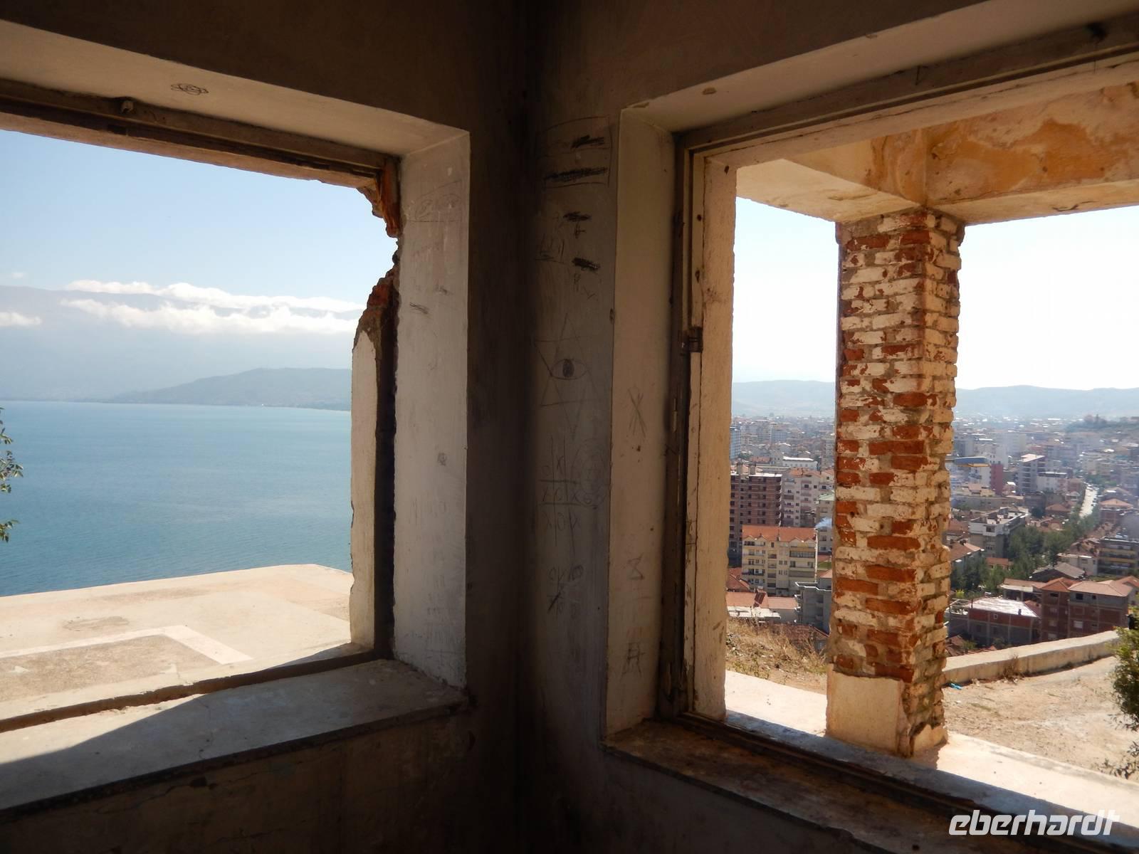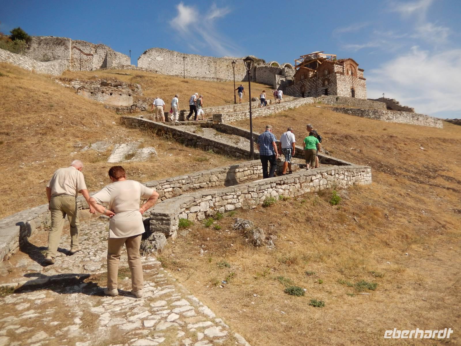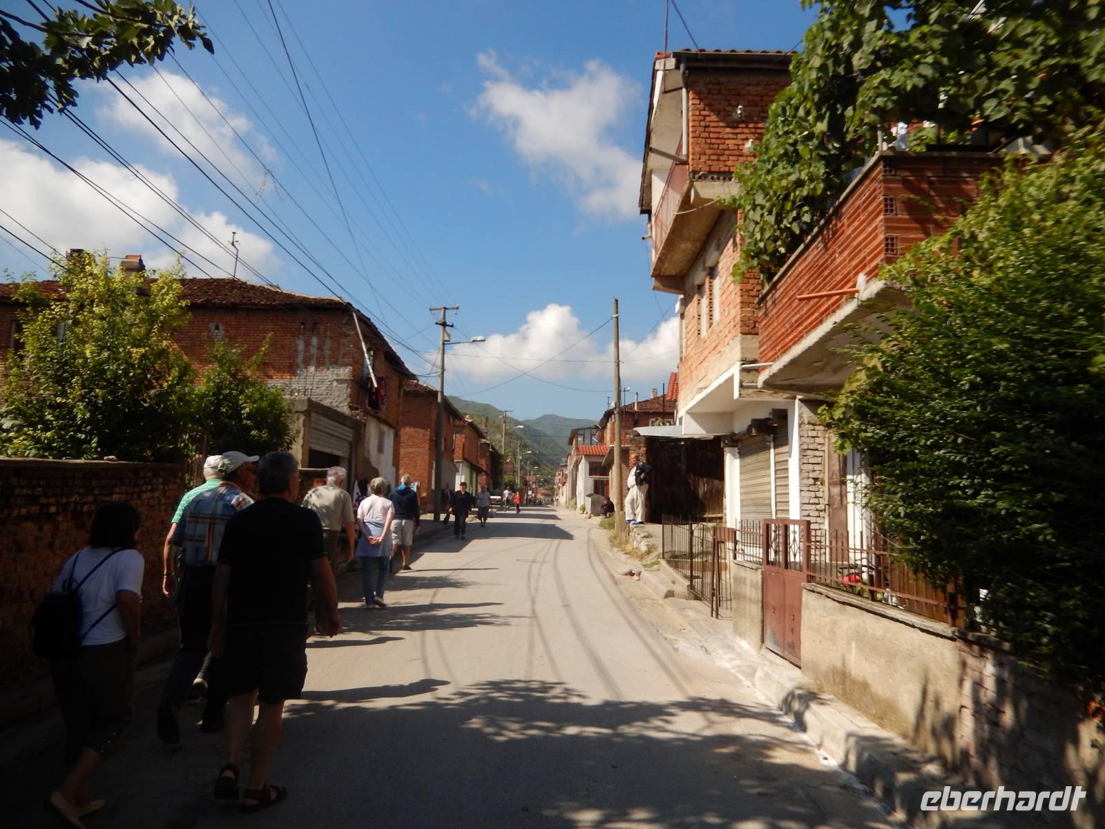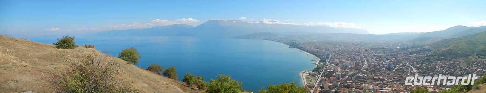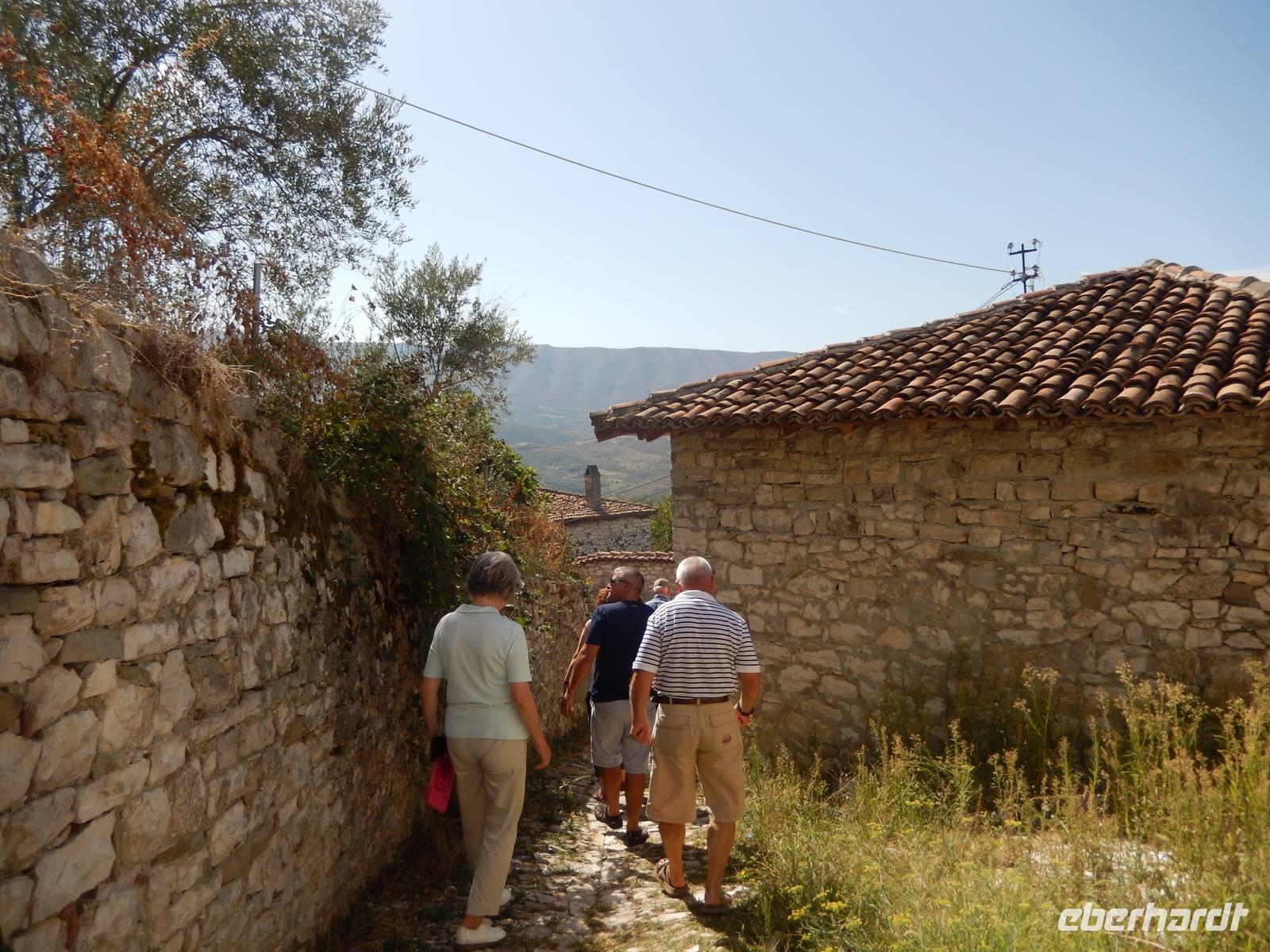 Die Wandertruppe folgte zunächst erst einmal schmalen Gassen, die durch die Stadt gingen, ehe sie am Stadtrand auf einen Pfad trafen welcher sie nach oben führte. Unterwegs hatte man eine herrliche Aussicht auf das glasklare Wasser und konnte sich auch einen guten Überblick auf die Stadt verschaffen. Auf dem Weg nach unten pflückten wir noch nicht ganz reife Walnüsse, knackten sie und ließen sie uns schmecken. Am Nachmittag nutzten dann die meisten Gäste die warmen Sonnenstrahlen und hüpften in den Ohridsee. Das Abendessen wurde im Hotel serviert und anschließend gab es noch albanisch/europäische Livemusik.