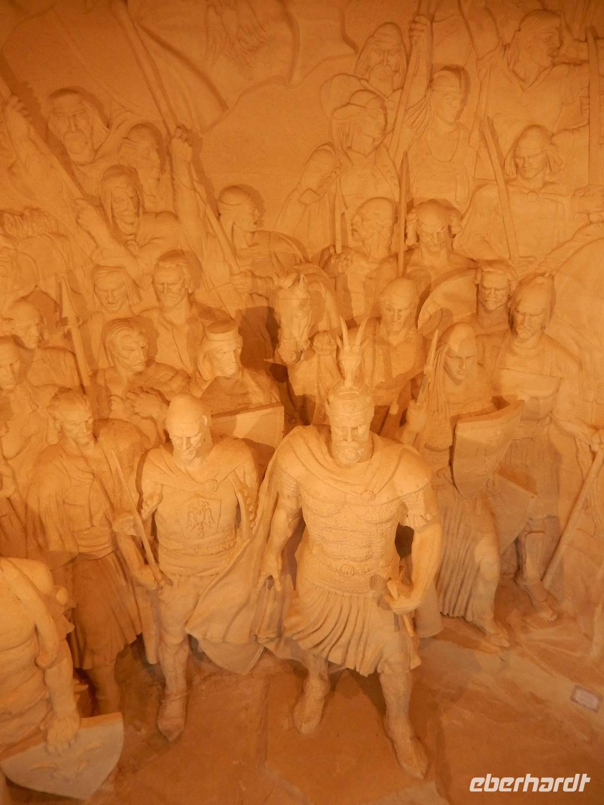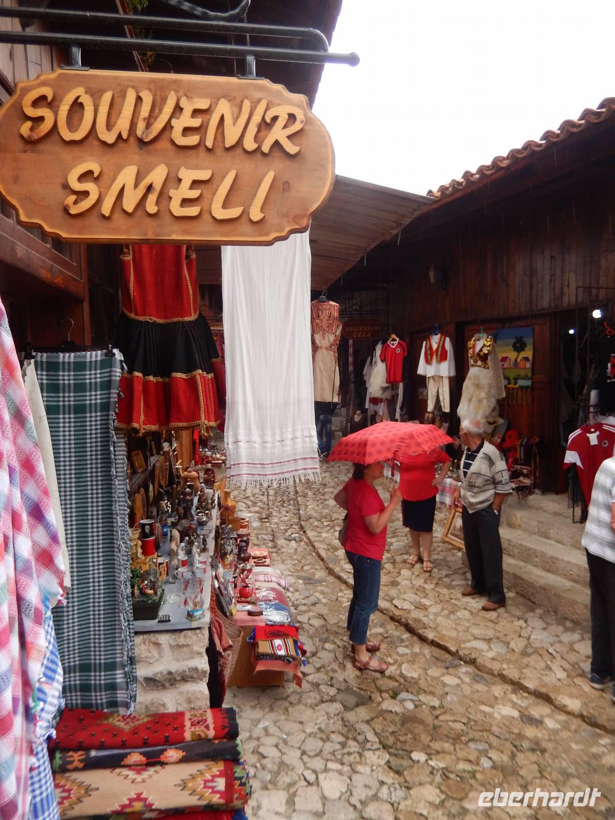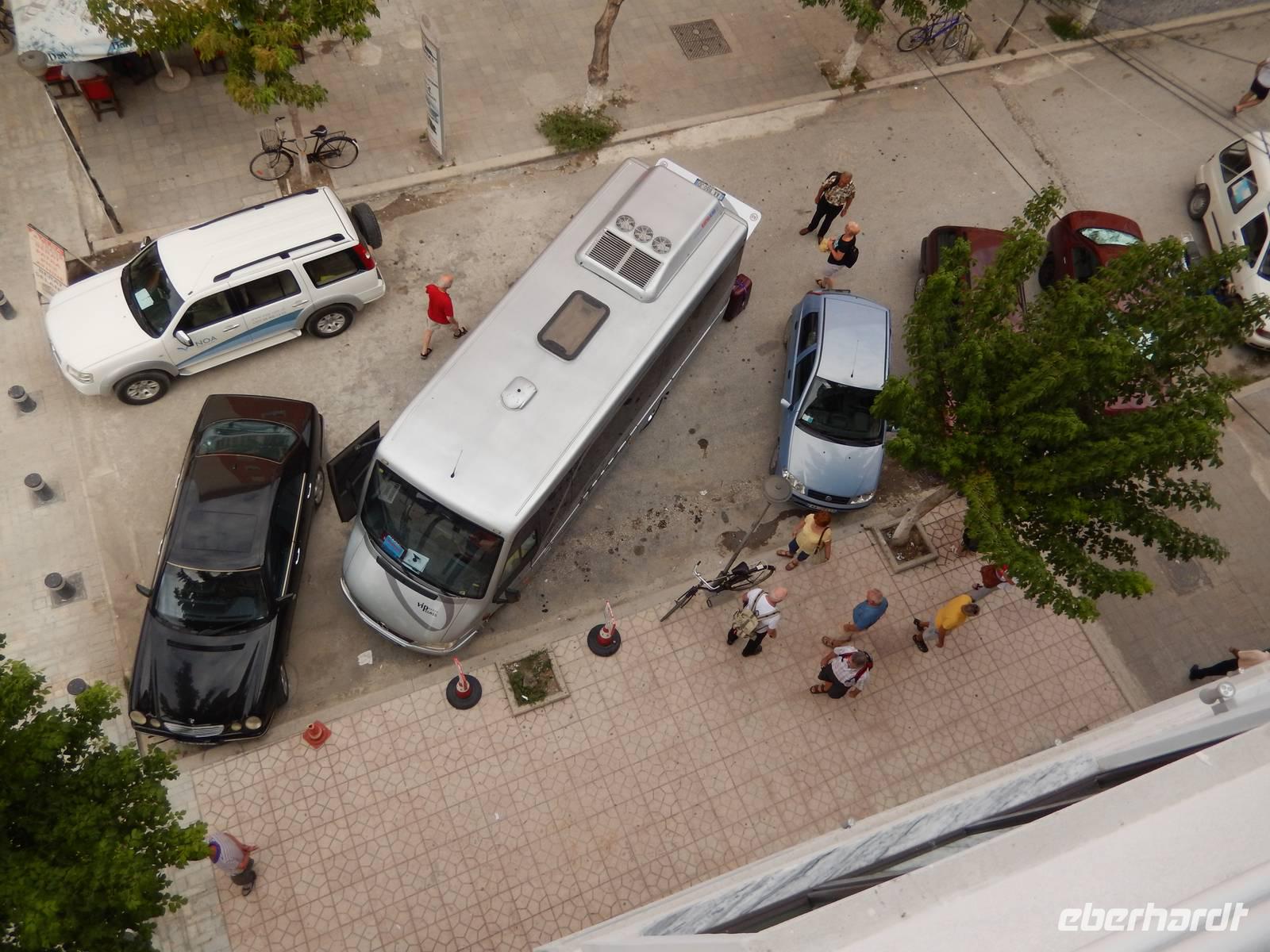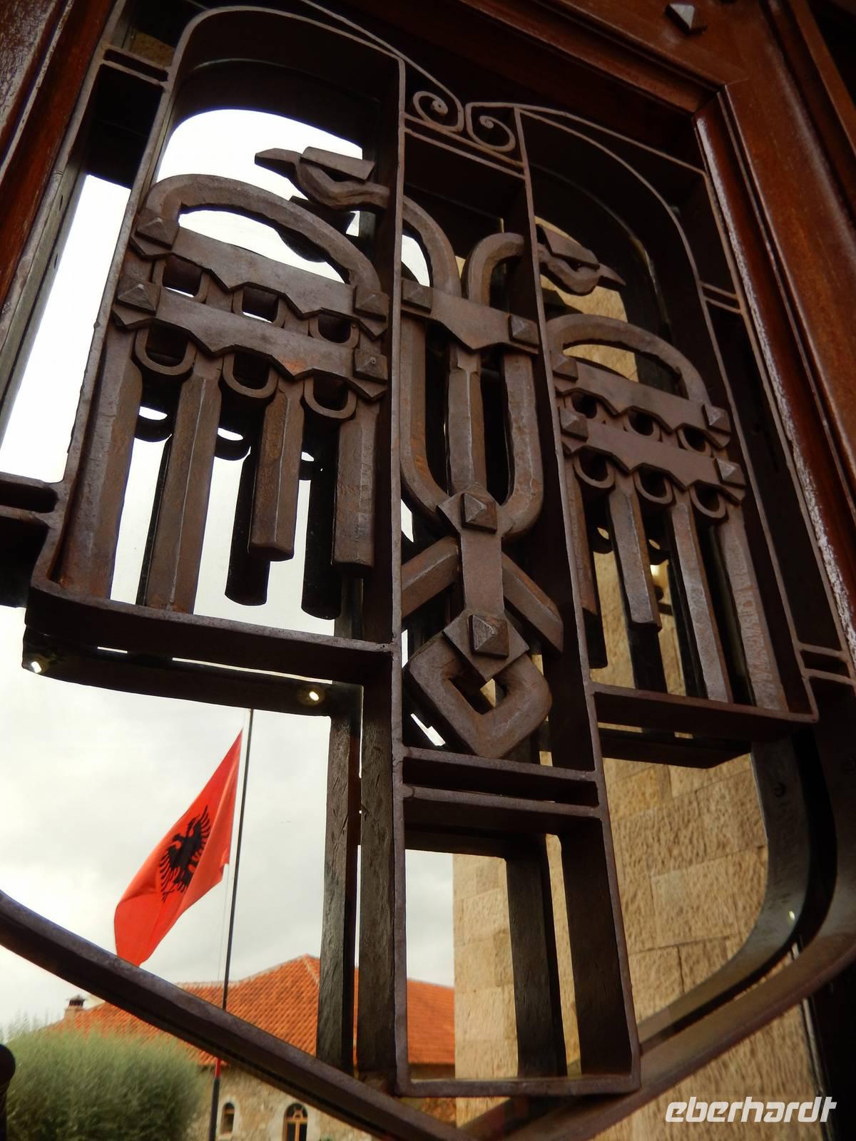 Heute Nacht erlebten wir den ersten richtigen Regen in Albanien. Daher beschlossen wir die Koffer zu packen und uns auf den Weg zum Kloster Adrenica zu machen. Das Programm für heute sah es ja auch genauso vor. :-) Das alte Kloster war noch sehr gut erhalten und die Kirche hatte auch die Zeit von Hoxha gut überstanden und sah sehr schick aus. Nachdem durch uns erneut viele Kerzen in der Kirche brannten, ging es zurück in den Bus, welcher uns nach Kruja brachte. In Kruja konnten wir die Lebens- und Auto-fahr-Kultur des Landes hautnah erleben. Es gab hier eine Bestattung und das Auto, das den Sarg transportierte, stand kurz nach einer Kurve mitten auf der Straße und verschmälerte sie so. Dazu kamen noch die trauernden Gäste (ausschließlich Männer) und der normale Autoverkehr. Schon nach kurzer Zeit war die gesamte Kurve verstopft, da jeder den anderen überholen wollte. Zu guter Letzt, setzte der Bus aus Kosovo noch auf der Straße auf, da er zu schwer war. Doch niemand beschwerte sich darüber, auch nicht als die Menschenmenge beschloss die Straße komplett einzunehmen und sich gegenseitig die Hände zu schütteln. Nach einer Weile löste sich der Knoten und wir konnten endlich weiter fahren und das letzte Museum unserer Reise, das Museum des Nationalhelden Skanderbeg, welches von der Tochter von Enver Hoxha entworfen wurde, besichtigen. Nach der Besichtigung ging es über den Basar zum Mittagessen und danach zurück zum Bus, der anschließend die Fahrt nach Durres aufnahm. Da das Programm am nächsten Tag etwas kleiner ausfiel, entschlossen wir uns die Besichtigung von Durres mit seinem Amphitheater auf den morgigen Tag zu verschieben und stattdessen dem Meer einen Besuch abzustatten. Wir schliefen nämlich direkt am Meer. :-)