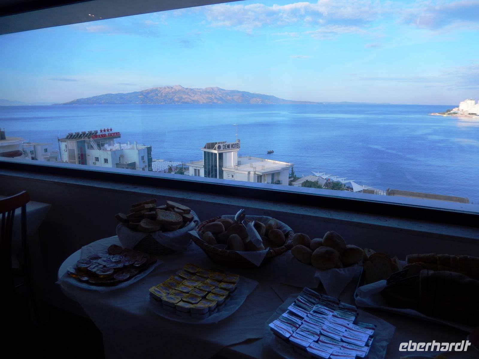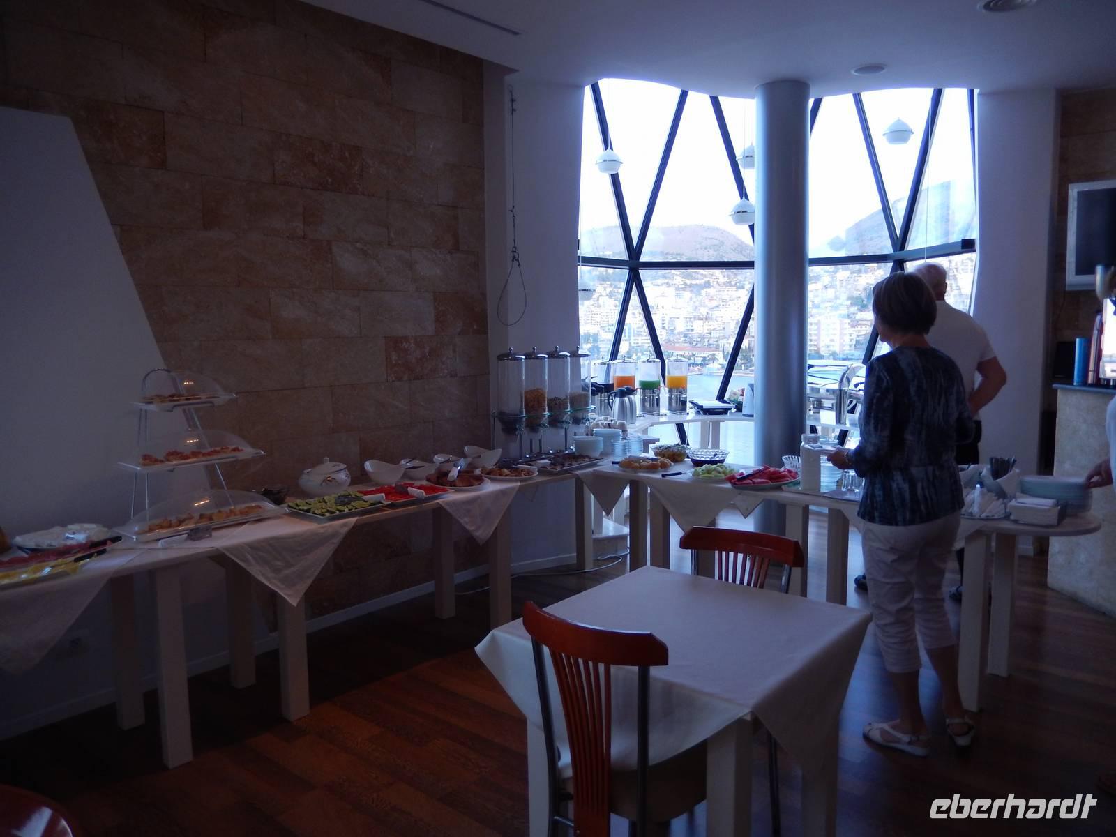 Nachdem wir gestern schon eine herrliche Aussicht beim Frühstück hatten, toppte die heutige Aussicht das Ganze noch einmal. Wir nahmen im fünften Stock unseres schönen Hotels Platz und konnten auf das vor uns liegende Meer hinunter schauen. Dabei genossen wir die ganzen Leckereien, die uns aufgetischt wurden.