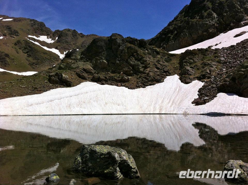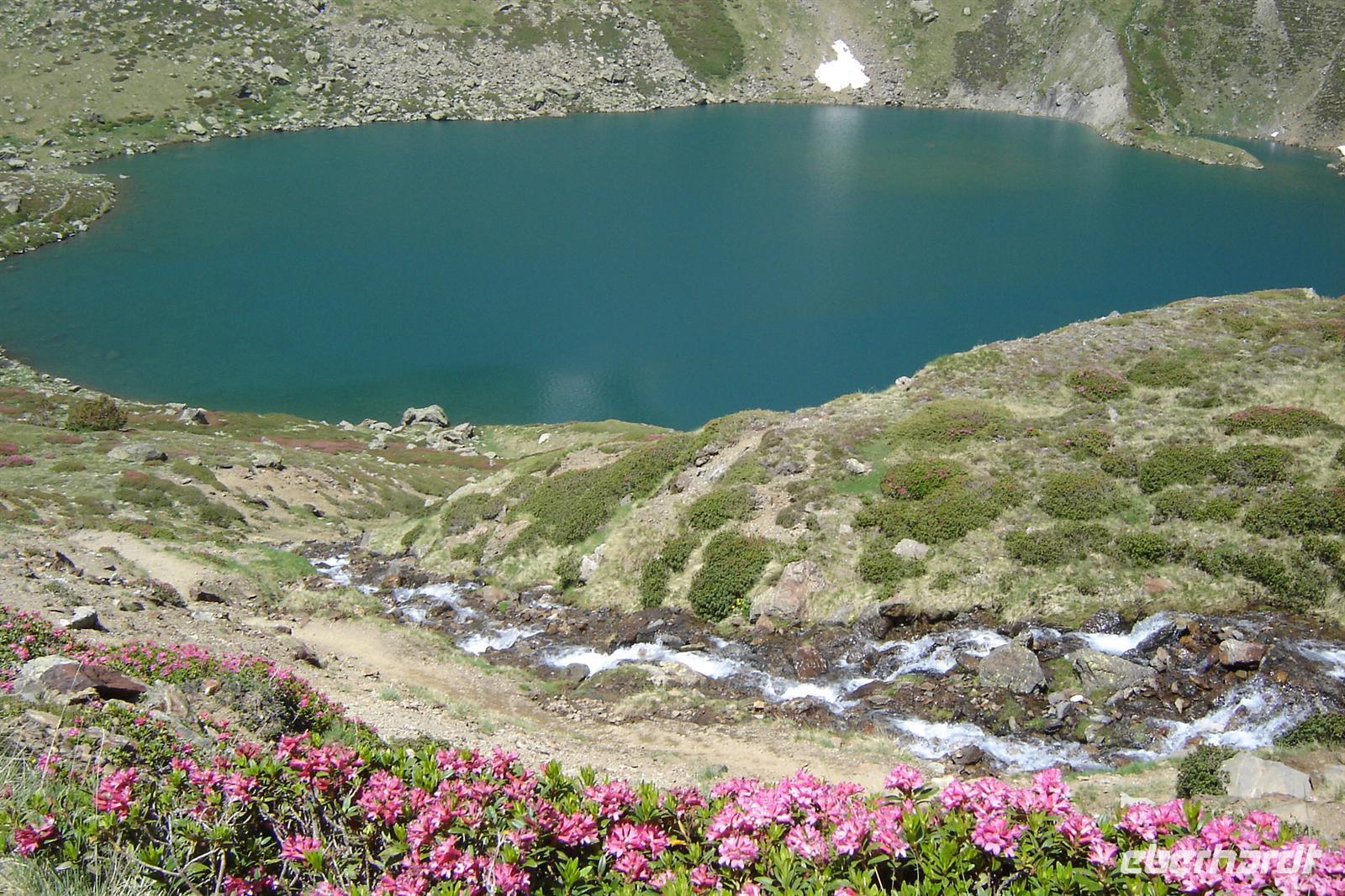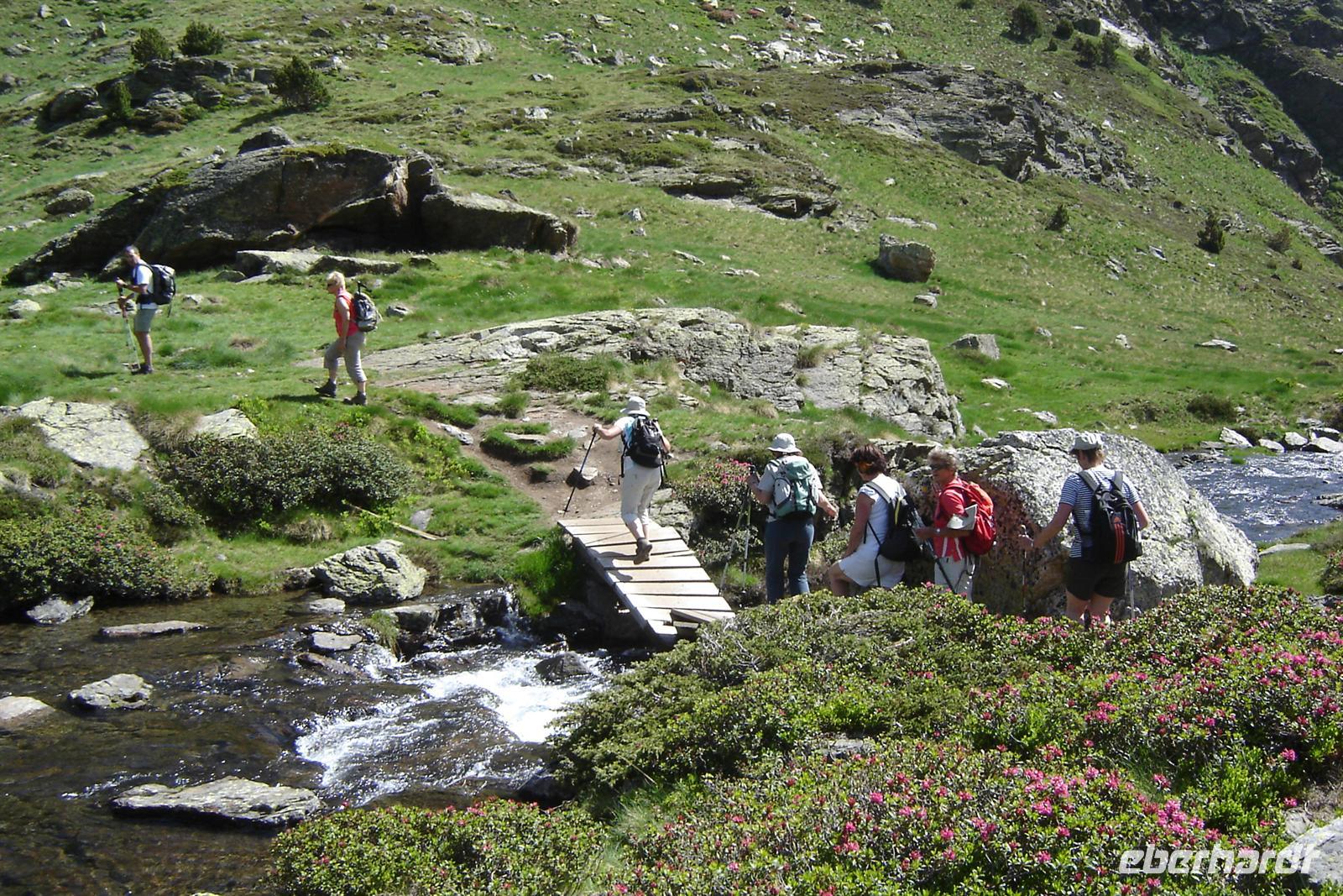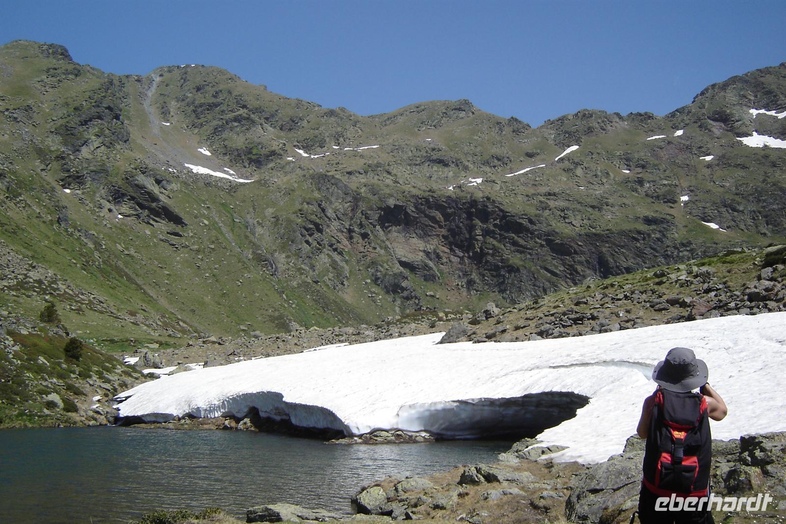 Zum Anfang der Wanderung haben wir uns in zwei Gruppen geteilt. Die sportbegeisterten wanderten mit Marco und die Genusswanderer wanderten mit Ignasi von Ordino-Arcalis ca. 300 Meter Höhe weiter oben. Wir wanderten den saftig grünen Wiesen und den leuchtend magentafarbenen Bergrosen entlang, überquerten kleine Bäche und gelangten zum ersten See der Tristaina-Seen. Am nahegelegenen zweiten See lag ringsherum noch zauberhaft funkelnder Schnee. Bei der Überquerung der Schneefleckchen zuckten alle ihre Fotoapparate heraus, denn Schnee bei mehr als 25 Grad, strahlendem Sonnenschein und umgeben von türkisschimmernden Seen sowie bunten Blumenwiesen erlebt man selten bei uns in Deutschland.