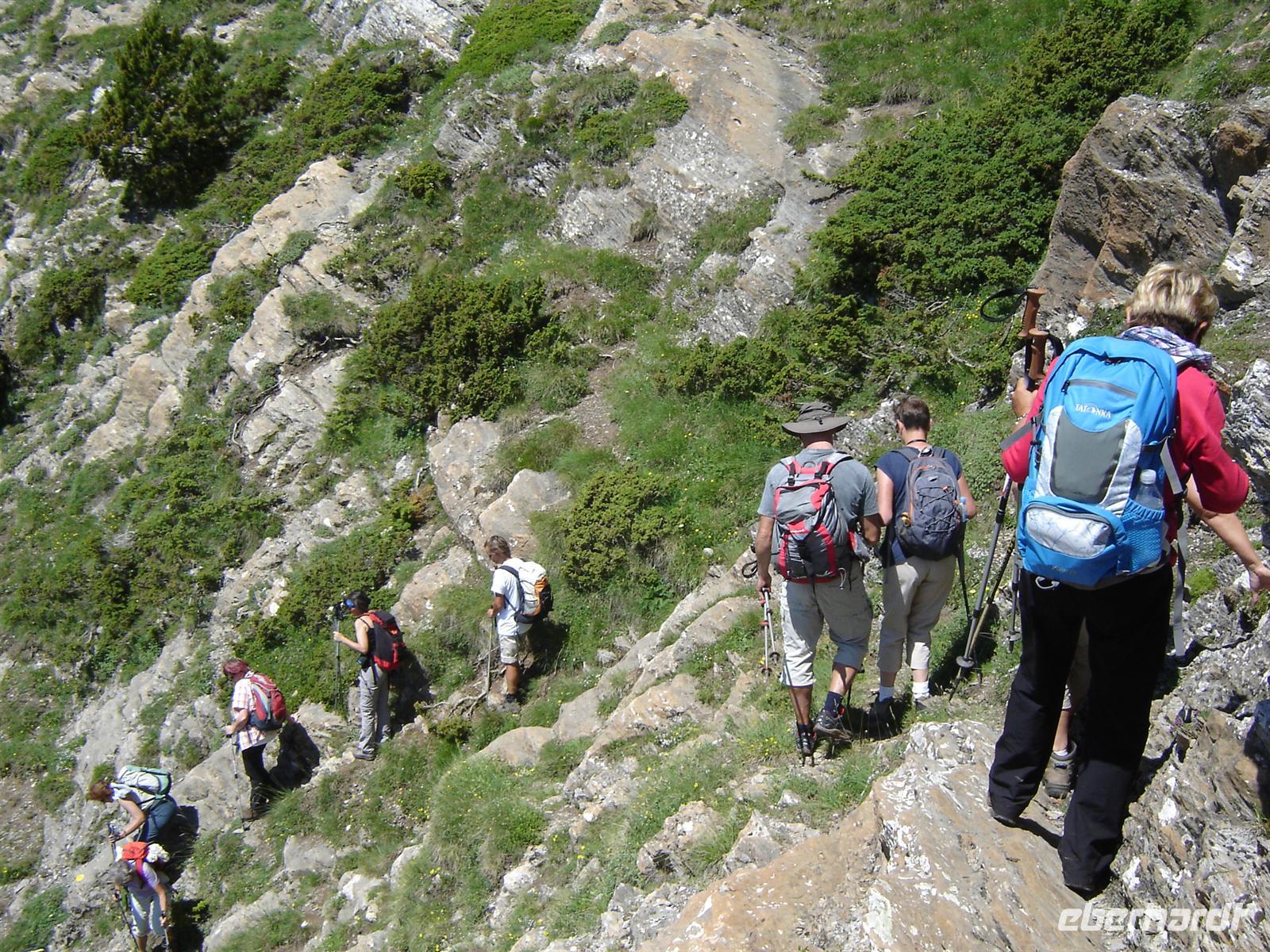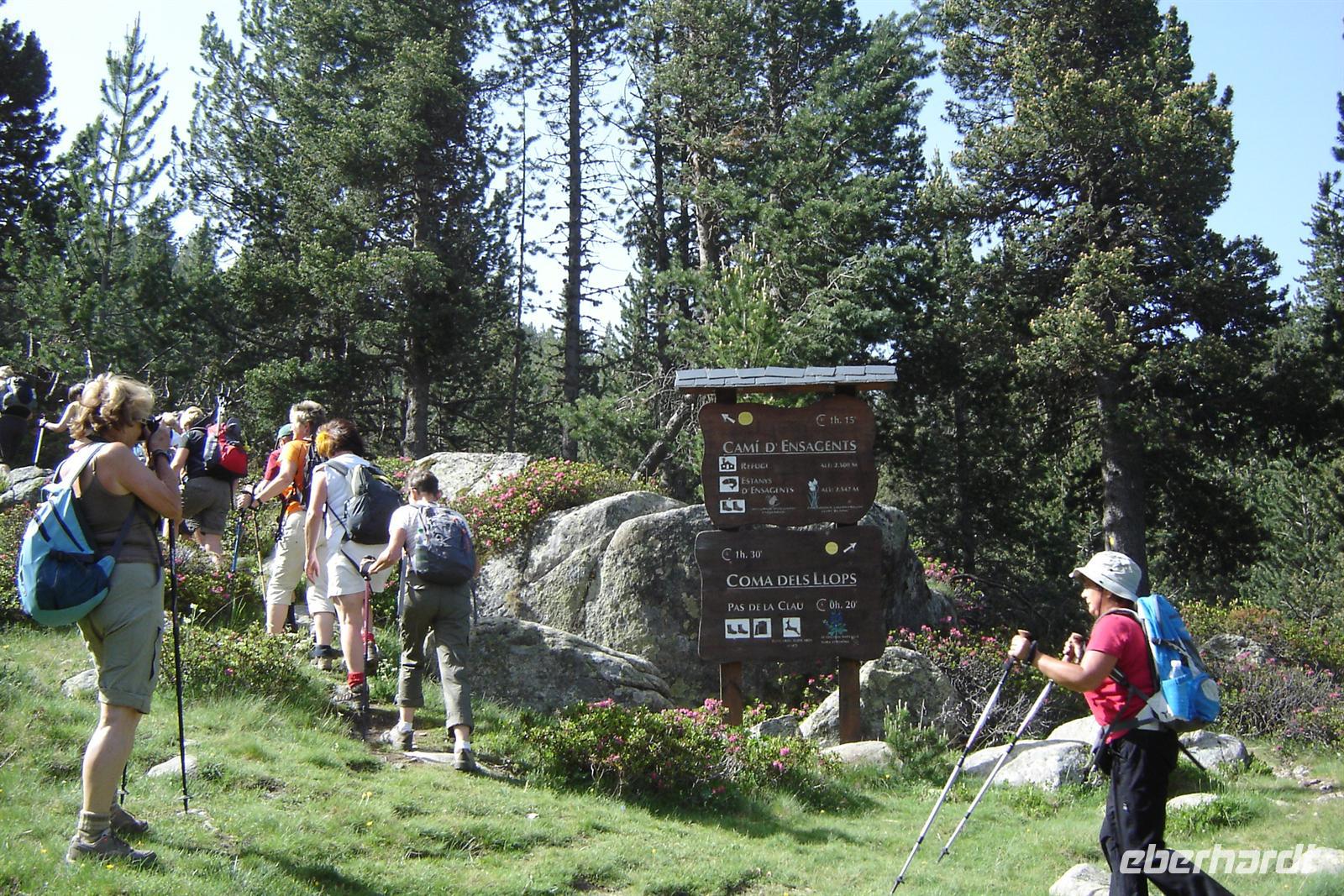 Zur letzten Wanderung trafen wir Marco und Ignasi am Ausgangspunkt Arinsal, welches auf ca. 1800 Metern Höhe liegt. Durch das Naturreservat Vedat de Xixerella erreichten wir nach ca. 350 Metern Höhe den Turer-Pass, von dem wir wunderschöne Ausblicke auf die umgebenden Berge genießen konnten. Weiter ging es zum höher gelegenen Coll de la Botella-Pass, auf dem wir eine Herde von Pyrenäen-Gemsen entdeckten. Geschwind rannten Sie die steilen Berghänge hinunter und suchten unter den Bäumen des Reservates Schutz. Obwohl die Wanderung nur einen Aufstieg von ca. 350 Metern und einen Abstieg von ca. 100 Metern beinhaltete, war sie keinesfalls zu unterschätzen. Es gab hin und wieder einige Stellen, an denen man am Rande der steilen Berghängen klettern musste und wirklich Trittsicherheit sowie etwas Klettergeschick mitbringen sollte.